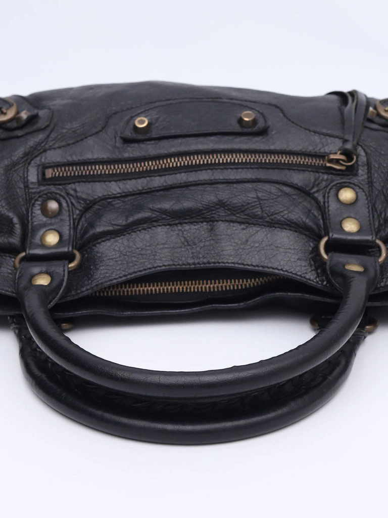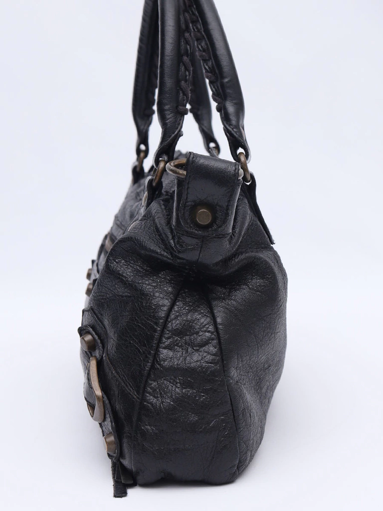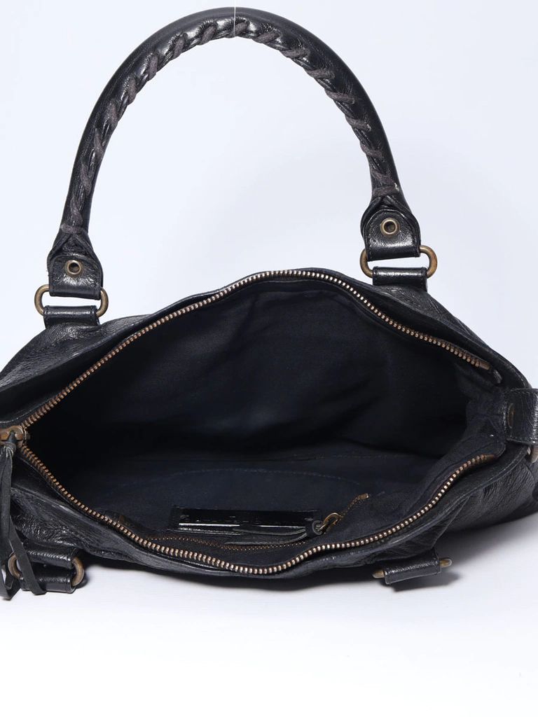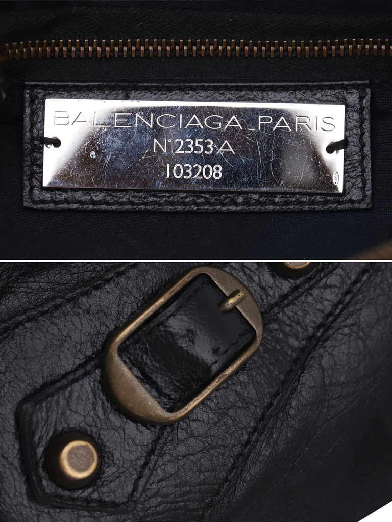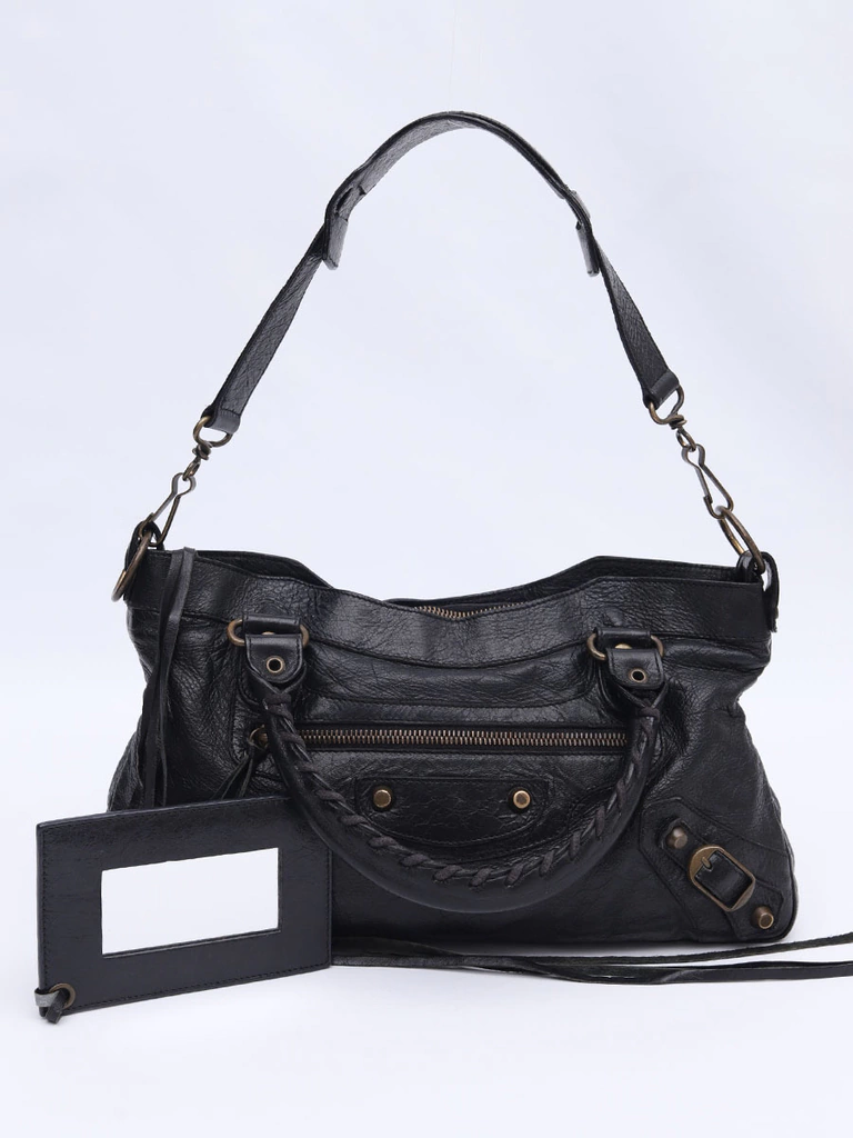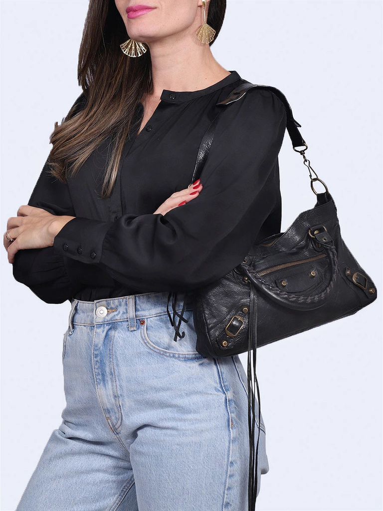 A Bolsa Original Balenciaga Motorcycle First é um dos modelos de bolsa mais cobiçados no momento pelas celebridades. Com seu estilo despojado e super estiloso, o modelo "First" é produzido em couro de cordeiro na cor "Black" e metais bronze com tratamento envelhecido. Com uma alça de ombro removível, franjas e tachas clássicas da marca Balenciaga, o modelo ainda apresenta um bolso exterior frontal, um bolso interno com zíper e duas alças de mão.