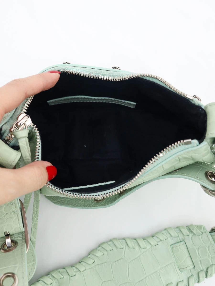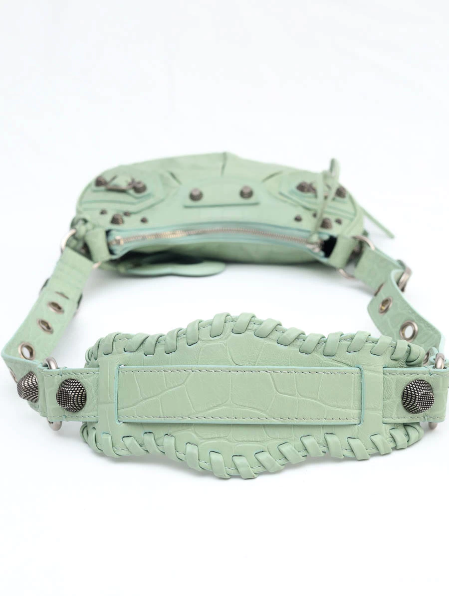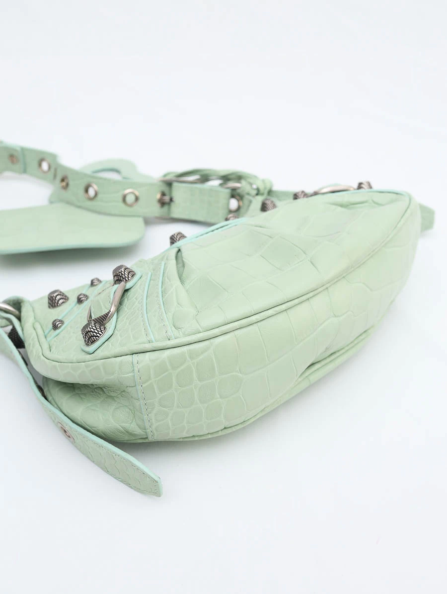A icônica Balenciaga Le Cagole é uma releitura moderna da clássica Motorcycle Bag, trazendo uma estética ousada e cheia de personalidade. Este modelo em couro verde água com textura croco combina perfeitamente com os detalhes em metais prateados envelhecidos, alça trançada e aplicações de rebites que dão o toque rebelde característico da marca. A bolsa acompanha um espelho em formato de coração e um mini porta-cartões removível, ambos no mesmo tom e material, reforçando seu visual contemporâneo e multifuncional.