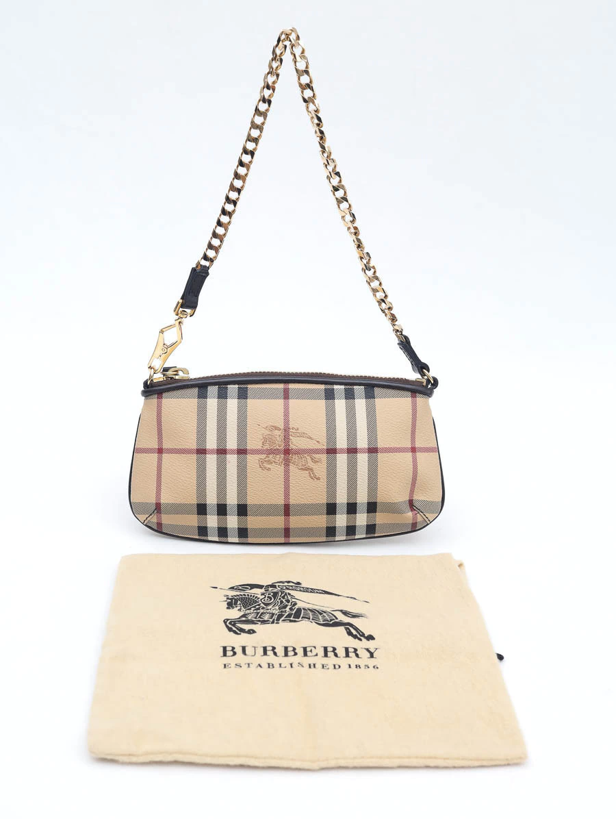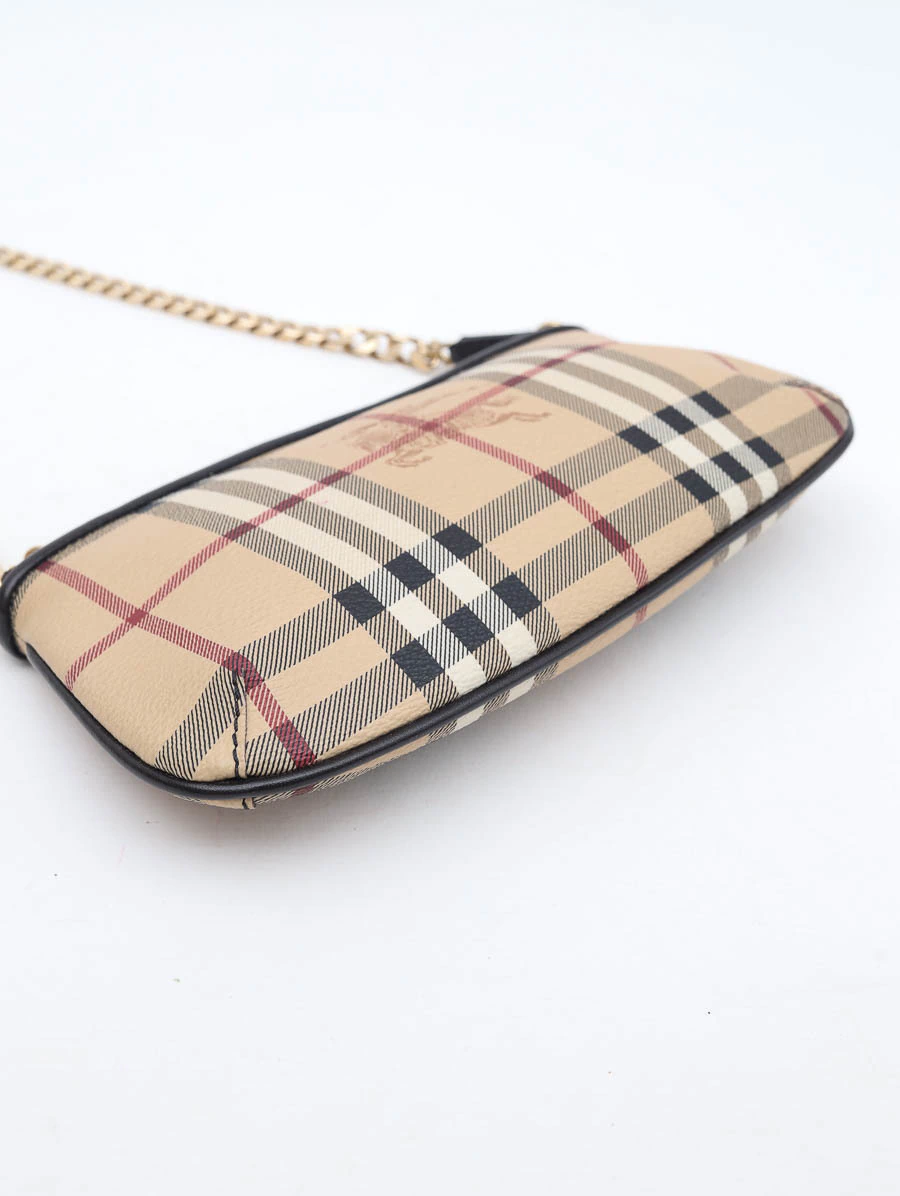 Bolsa original Burberry Haymarket Check Pochette em canvas com o clássico xadrez da marca e detalhe do cavaleiro em destaque. Possui alça em corrente dourada com acabamento em couro preto, oferecendo um toque elegante e atemporal.
