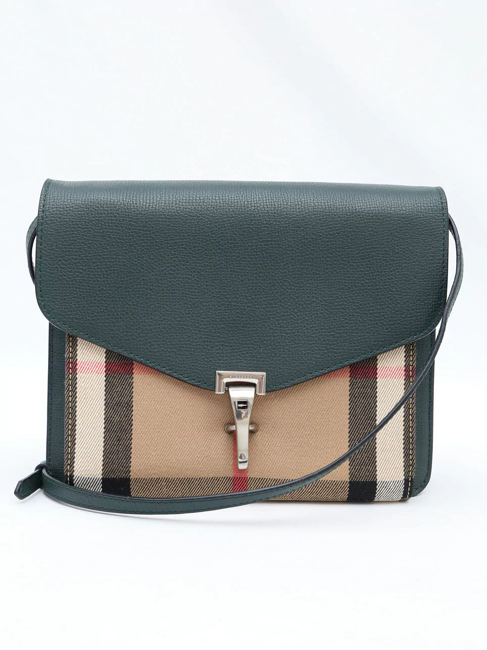Bolsa Original Burberry Macken Crossbody é uma bolsa deslumbrante no tamanho médio, com corpo estruturado em couro na cor verde militar, estampa da marca Burberry e metais pratas. Apresenta uma alça longa com ajuste de comprimento, aba flap, interior com dois compartimentos e um bolso externo com zíper na parte de trás.