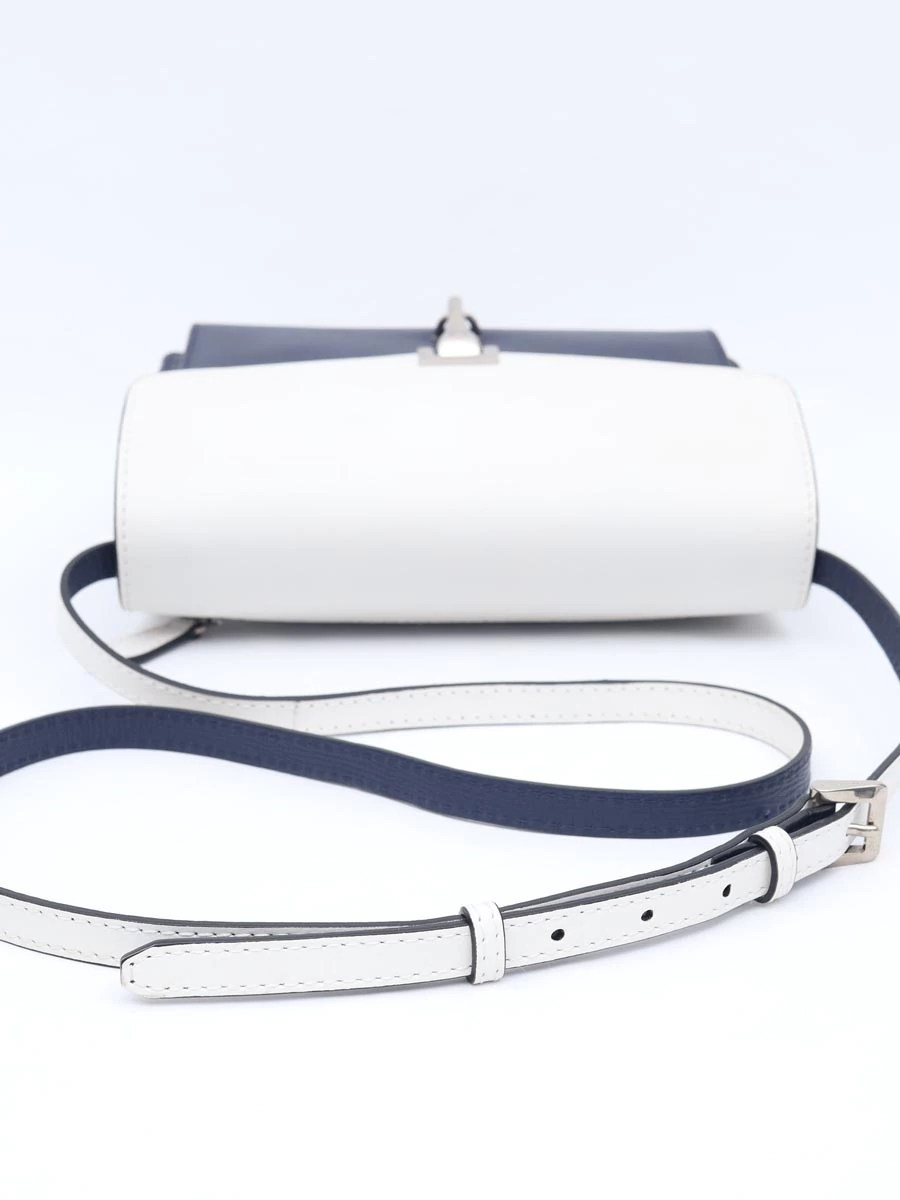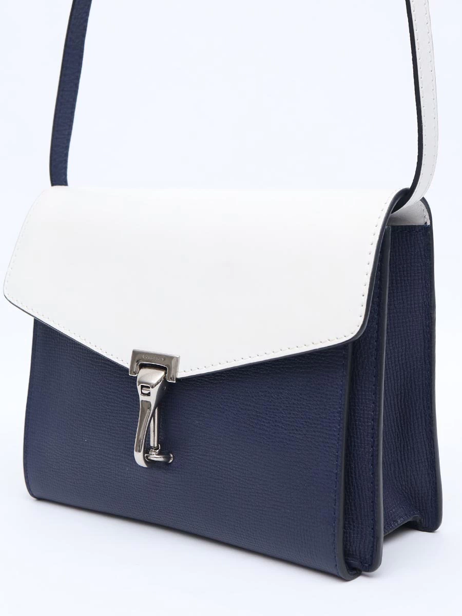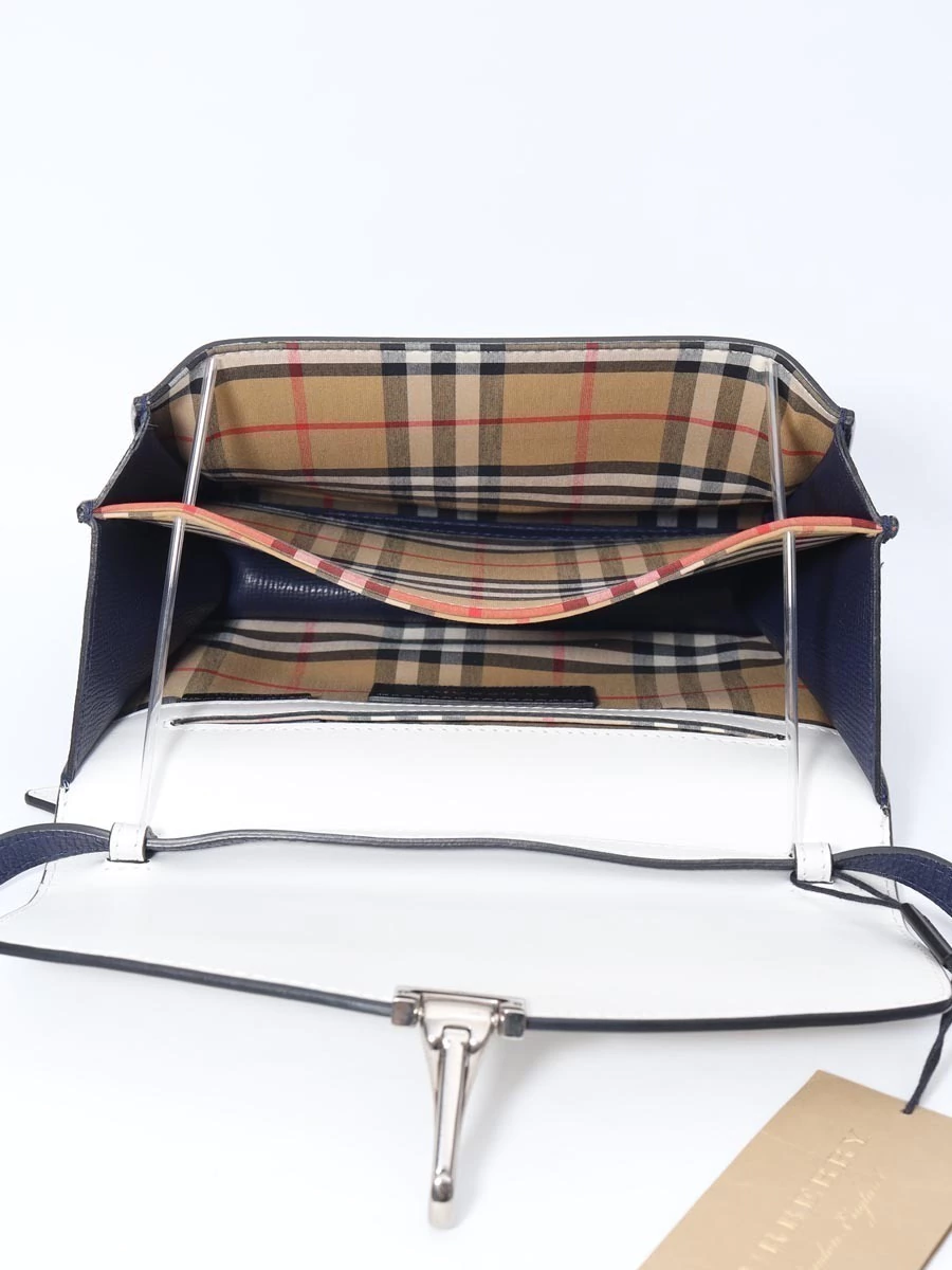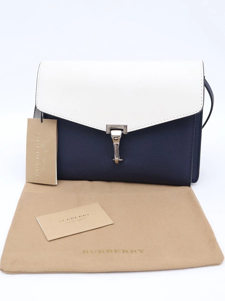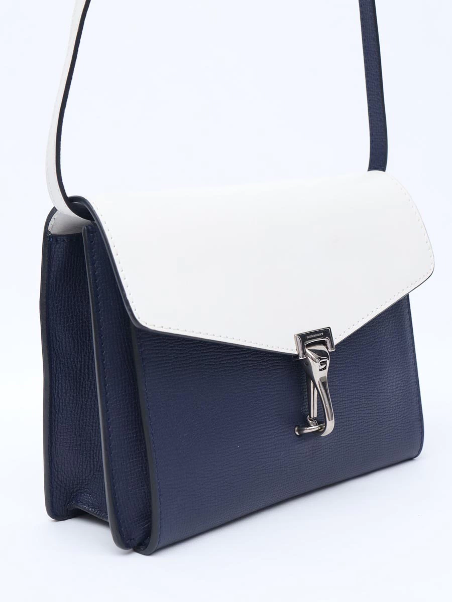 A Bolsa Burberry Macken Crossbody é um modelo médio e estruturado, uma bolsa deslumbrante produzida em couro nas cores azul e branca com metais pratas. Apresenta uma alça longa com ajuste de comprimento, aba flap e interior com dois compartimentos com estampa xadrez clássica e um bolso externo com zíper na parte de trás.