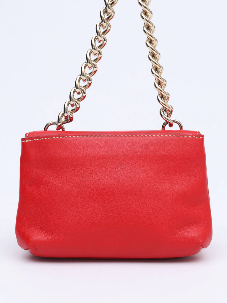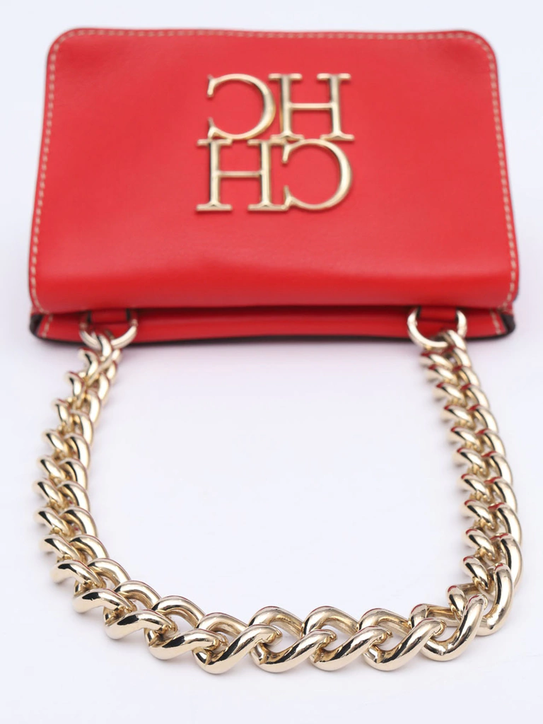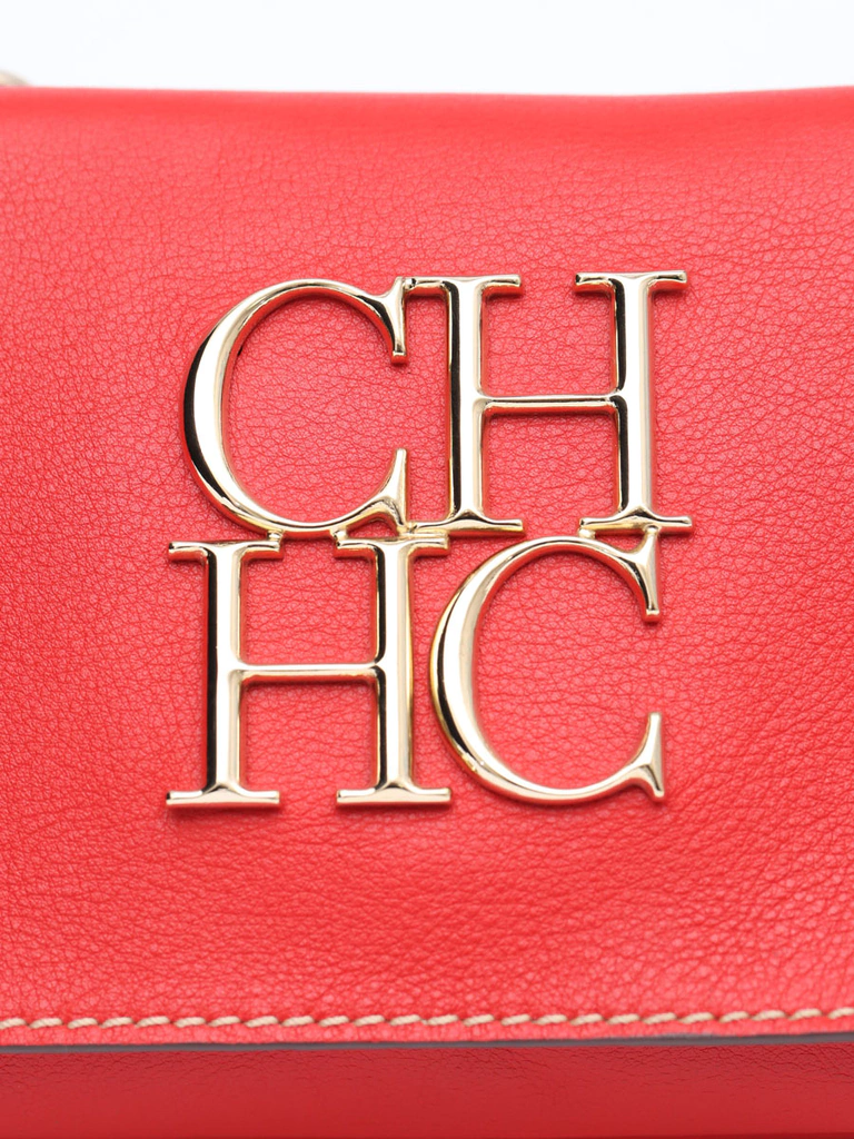 Bolsa Carolina Herrera CH Chain Shoulder produzida em couro vermelho com uma sutil textura, metais prateados com brilho e um belíssimo logo frontal com as letras da marca CH. Apresenta uma alça de ombro em correntes grossas e imponentes, abertura frontal com aba "flap" e um compartimento no verso da bolsa com uma aba de encaixe.