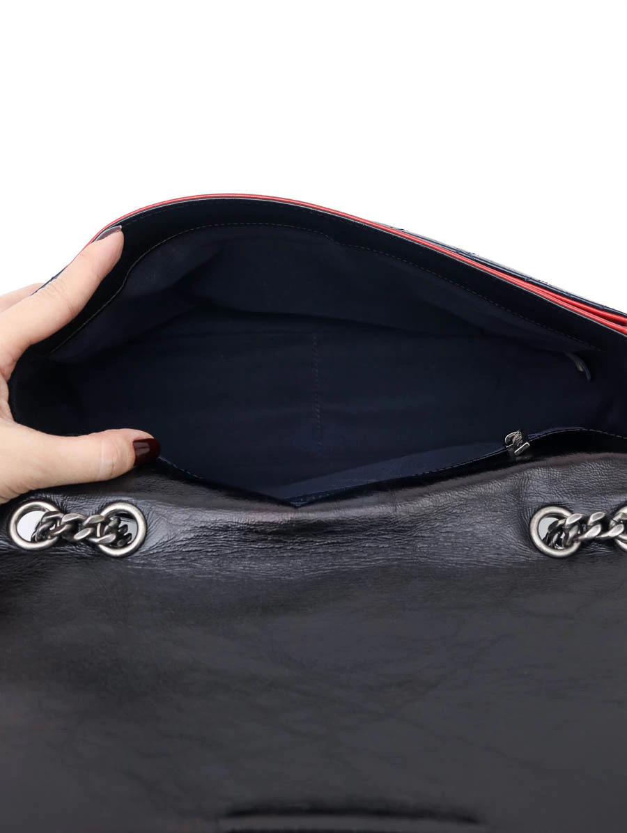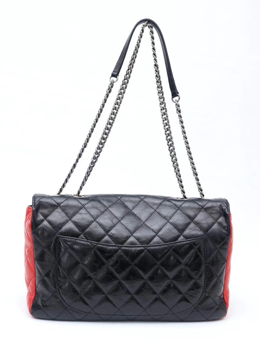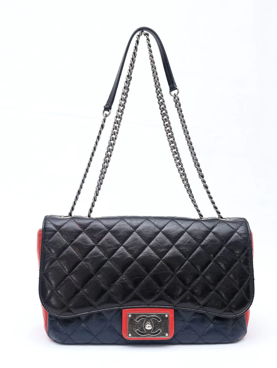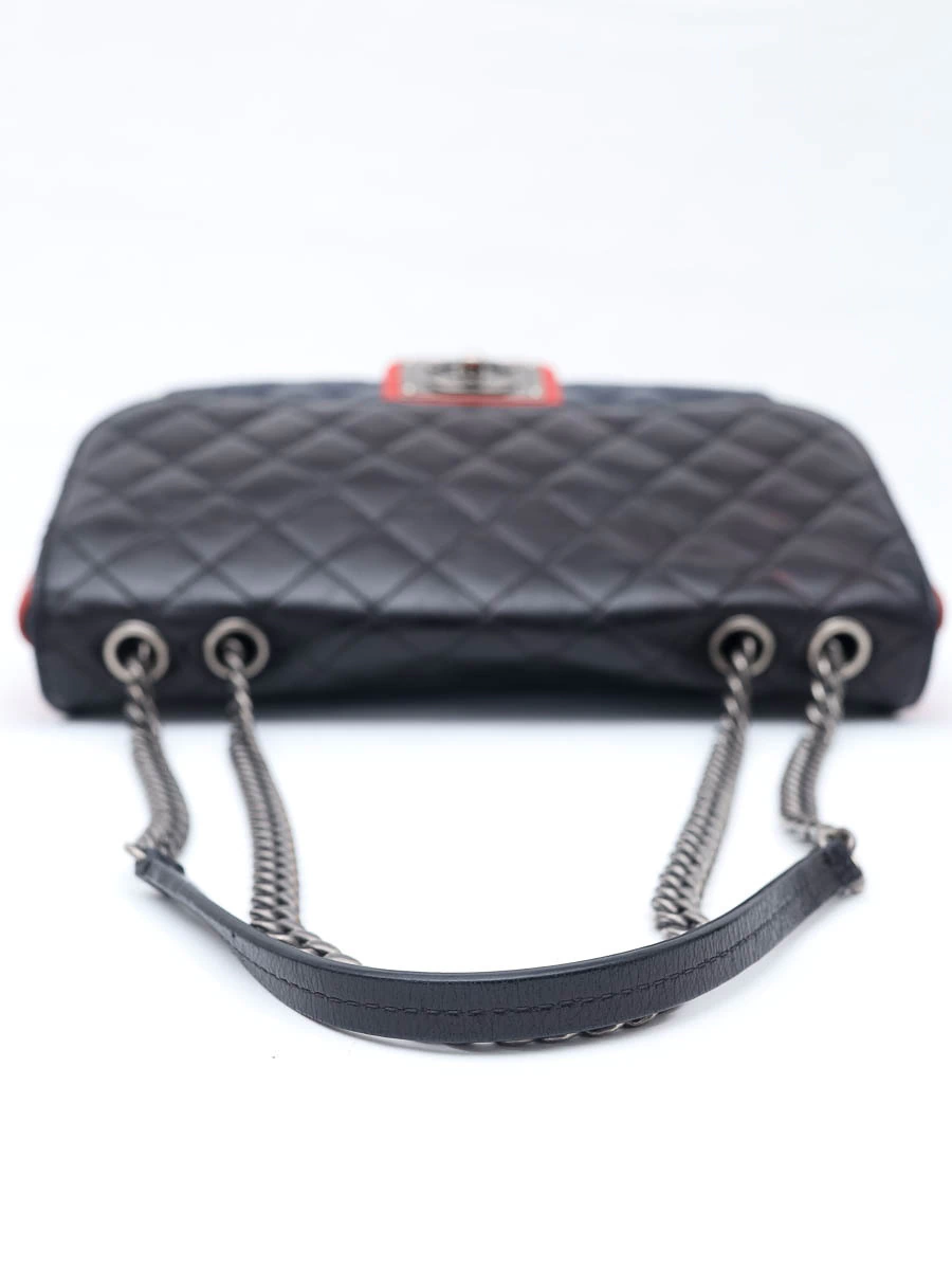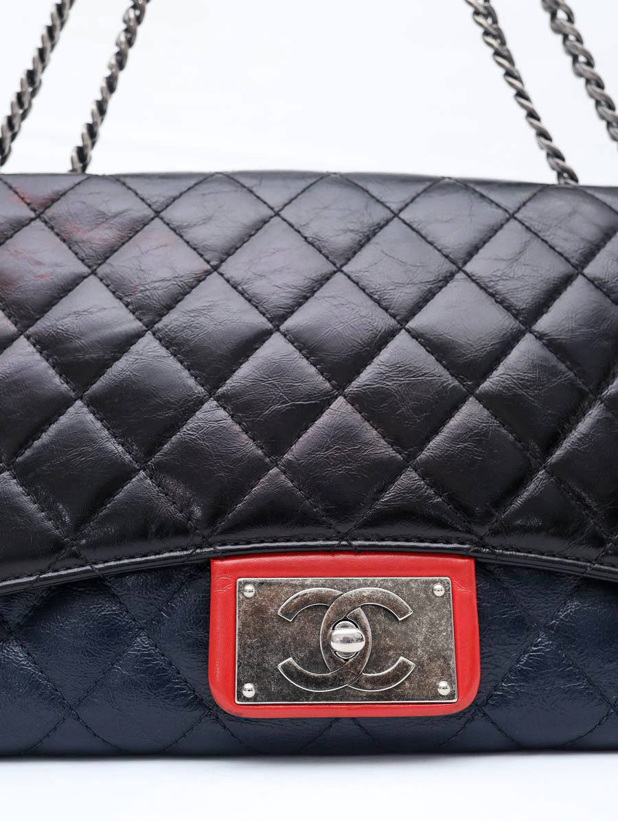 Bolsa Chanel Classic Tricolor confeccionada em couro matelassê nas cores preto, vermelho e azul-marinho. O modelo possui alça de corrente dupla entrelaçada com couro, fechamento clássico em metal prateado envelhecido com o icônico logo “CC” e detalhes contrastantes que conferem um visual contemporâneo e sofisticado à peça.