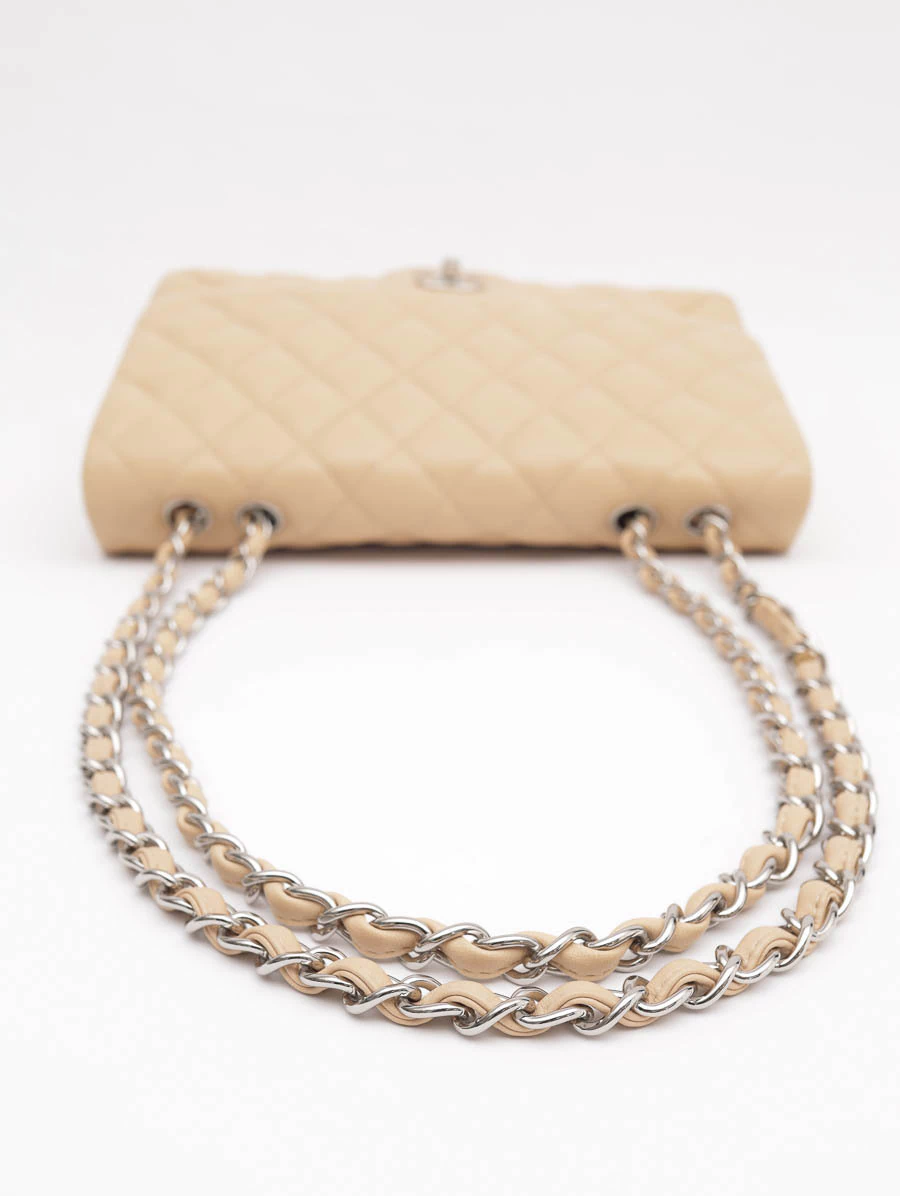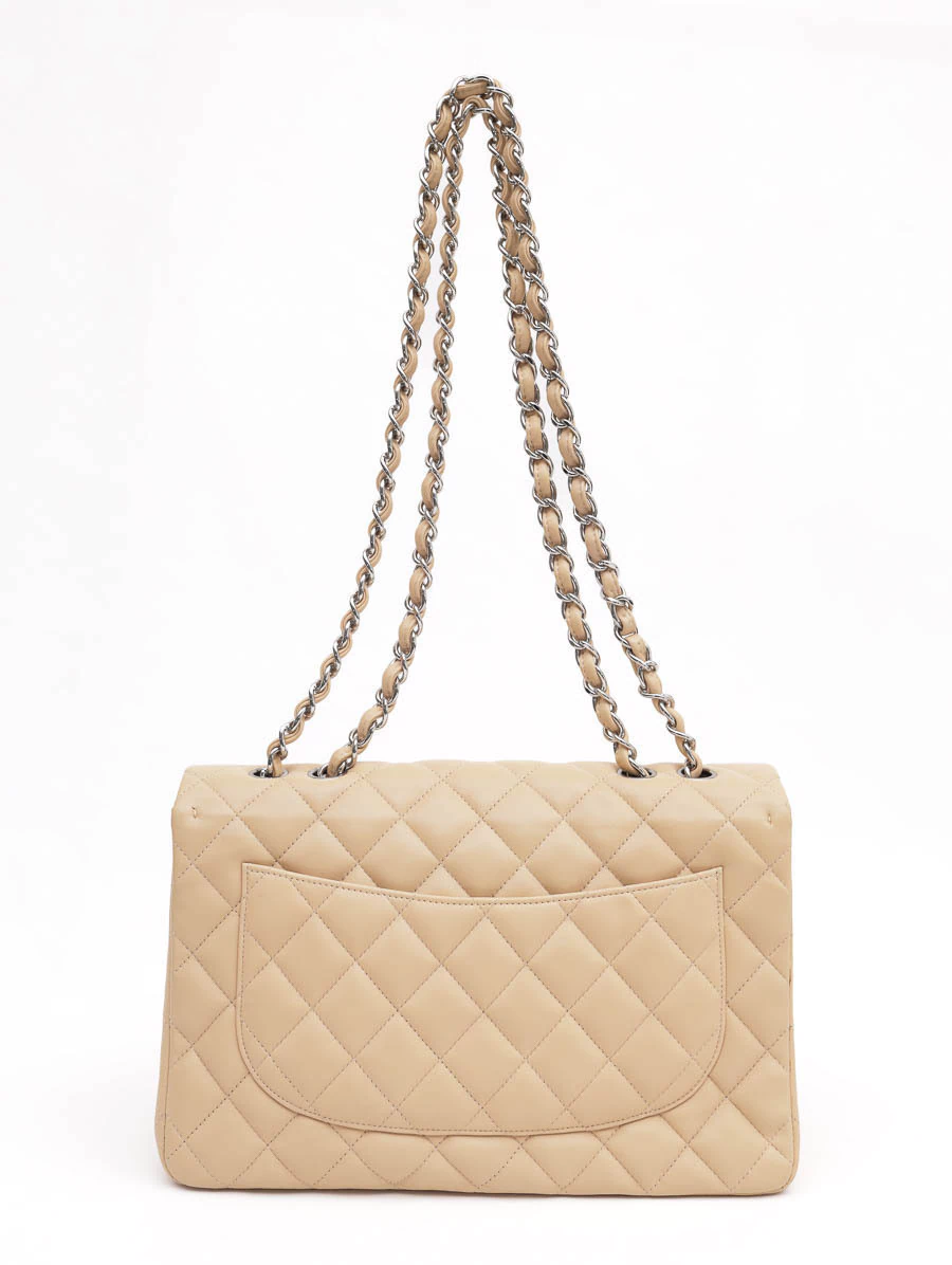 Bolsa Original Chanel Jumbo Lambskin Bege produzida em couro bege e metais pratas. Apresenta fecho por encaixe, um bolso aberto e um bolso com zíper, alça longa com detalhes em correntes e um bolso grande na parte externa.