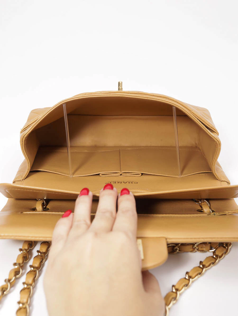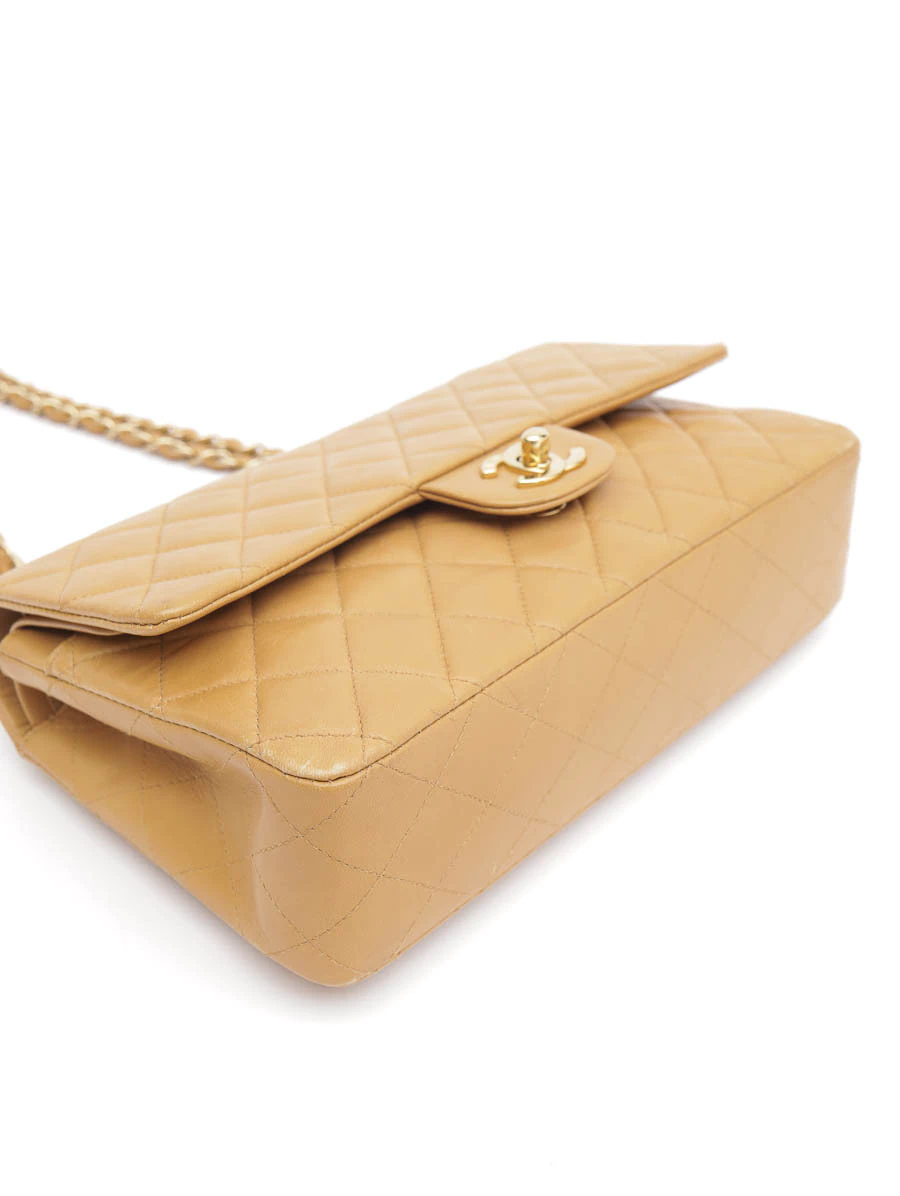 Bolsa Original Chanel Lambskin Bege Duble Flap produzida em couro na cor bege com ferragens douradas. Apresenta fecho de pressão e fecho por encaixe, tres bolsos abertos e um bolso com zíper, alca longa com detalhes em correntes e um bolso externo.
