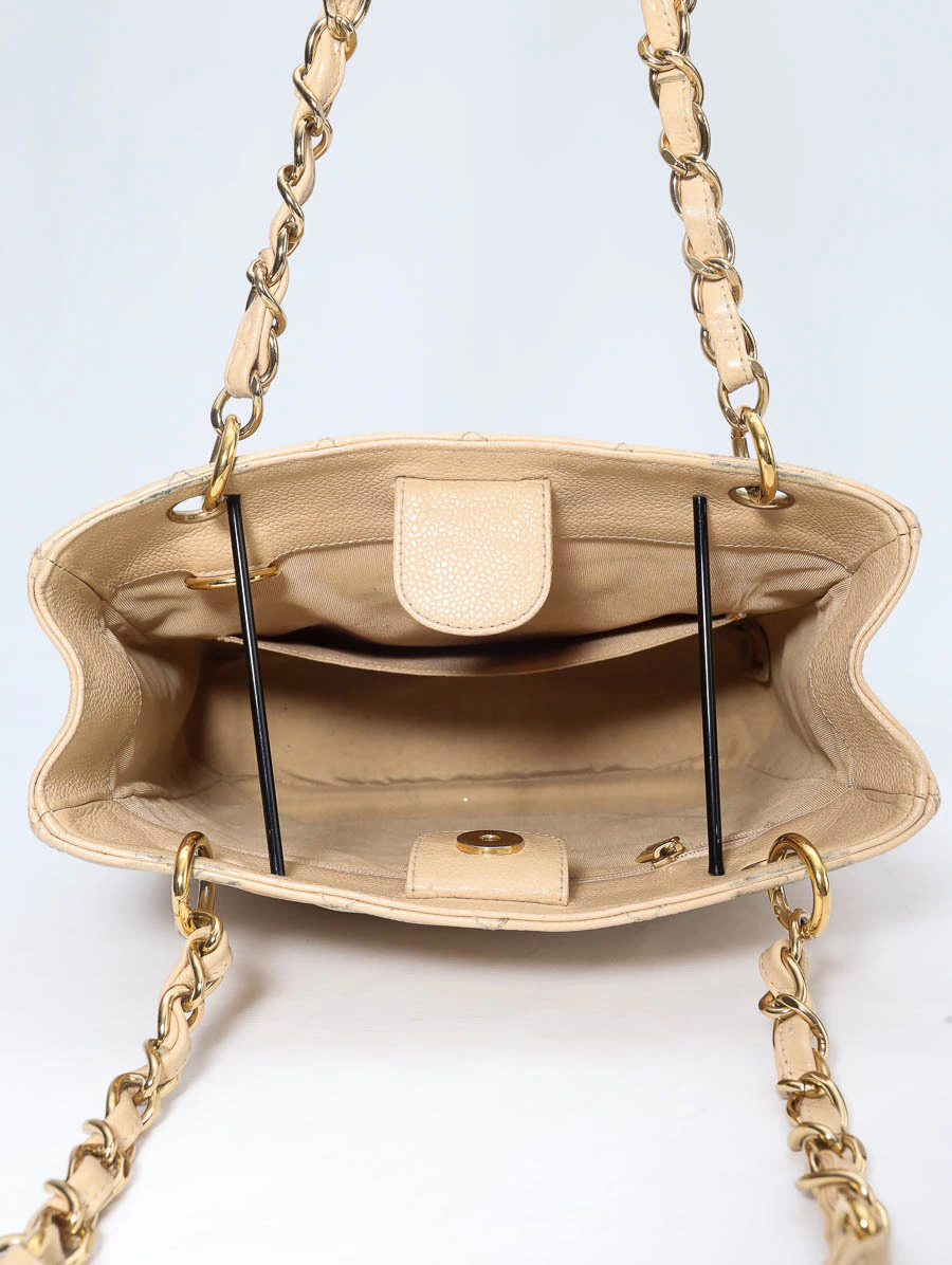 Bolsa Chanel Petit Shopper Nude produzida em couro na cor bege e ferragens douradas. Apresenta alças de ombro em couro e correntes, fecho magnético, um compartimento interno com bolso aberto e um bolso externo também aberto; além do icônico logo da Chanel na parte frontal.