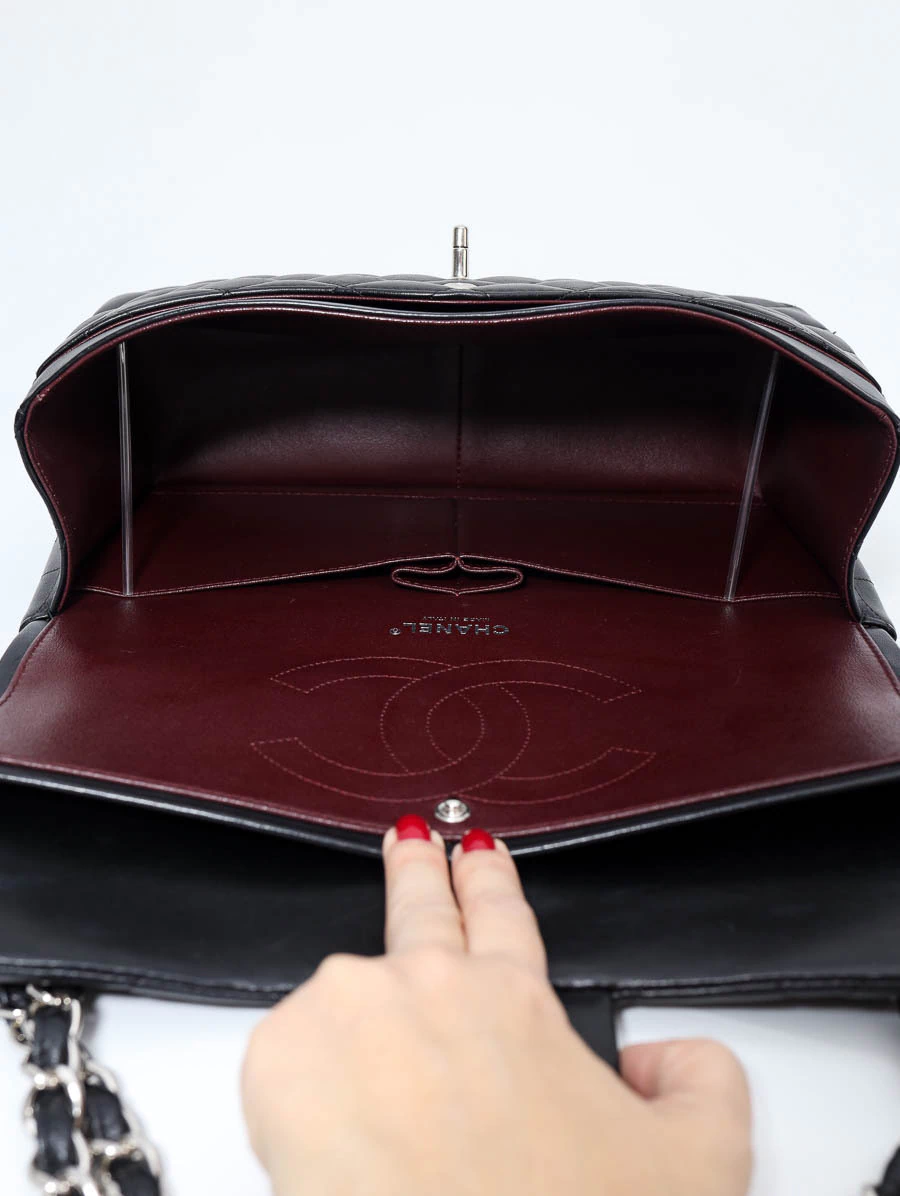 Bolsa Original Chanel Classica Jumbo produzida couro lambskin na cor preta e ferragens com banho prata. Apresenta aba dupla, alça longa, um bolso na parte de tráz e interior em couro com dois pequenos bolsos, um compartimento frontal e um bolso com zíper na aba.