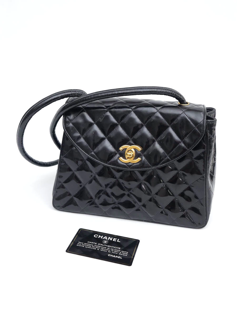 Bolsa Chanel Vintage Preta produzida em couro envernizado na cor preta e ferragens douradas. Apresenta alça longa em formato tubular, abertura por fecho de encaixe e compartimento em couro com dois bolsos, um bolso aberto e um bolso com zíper.