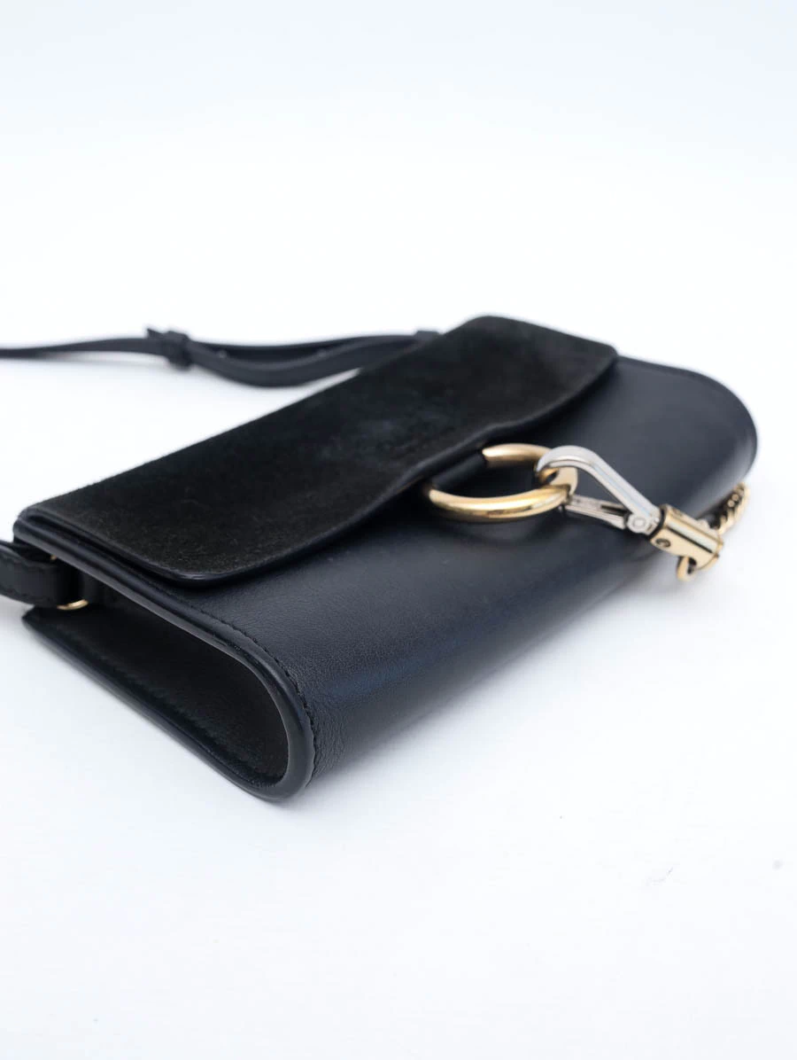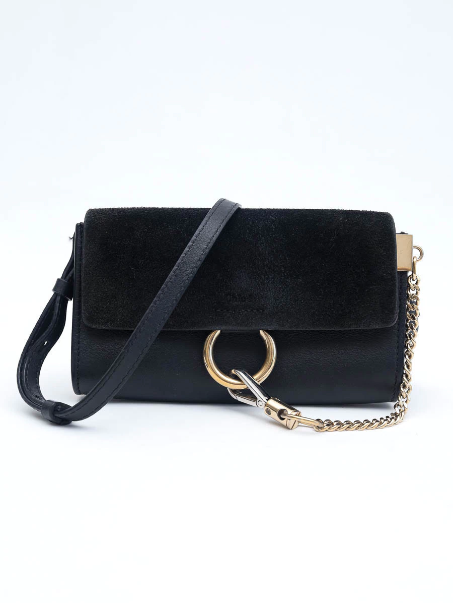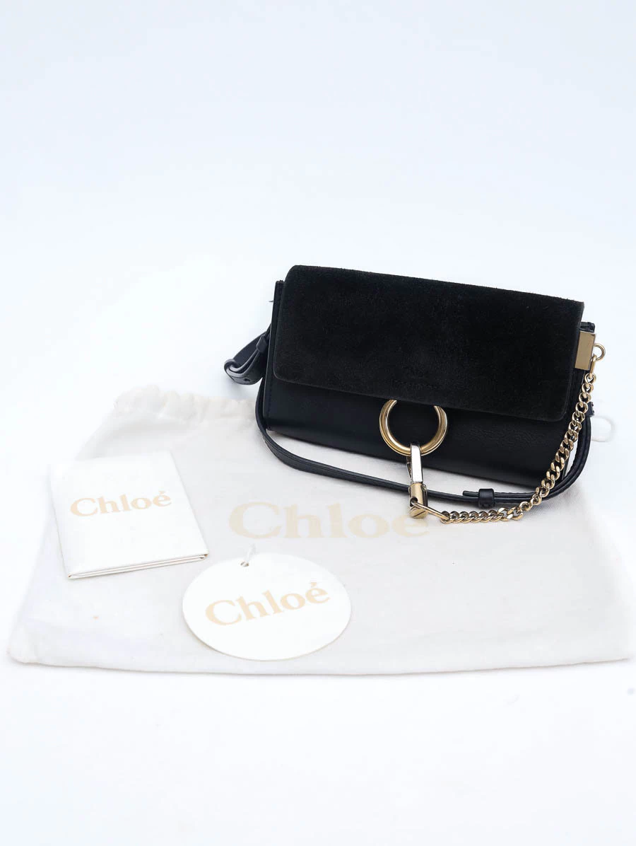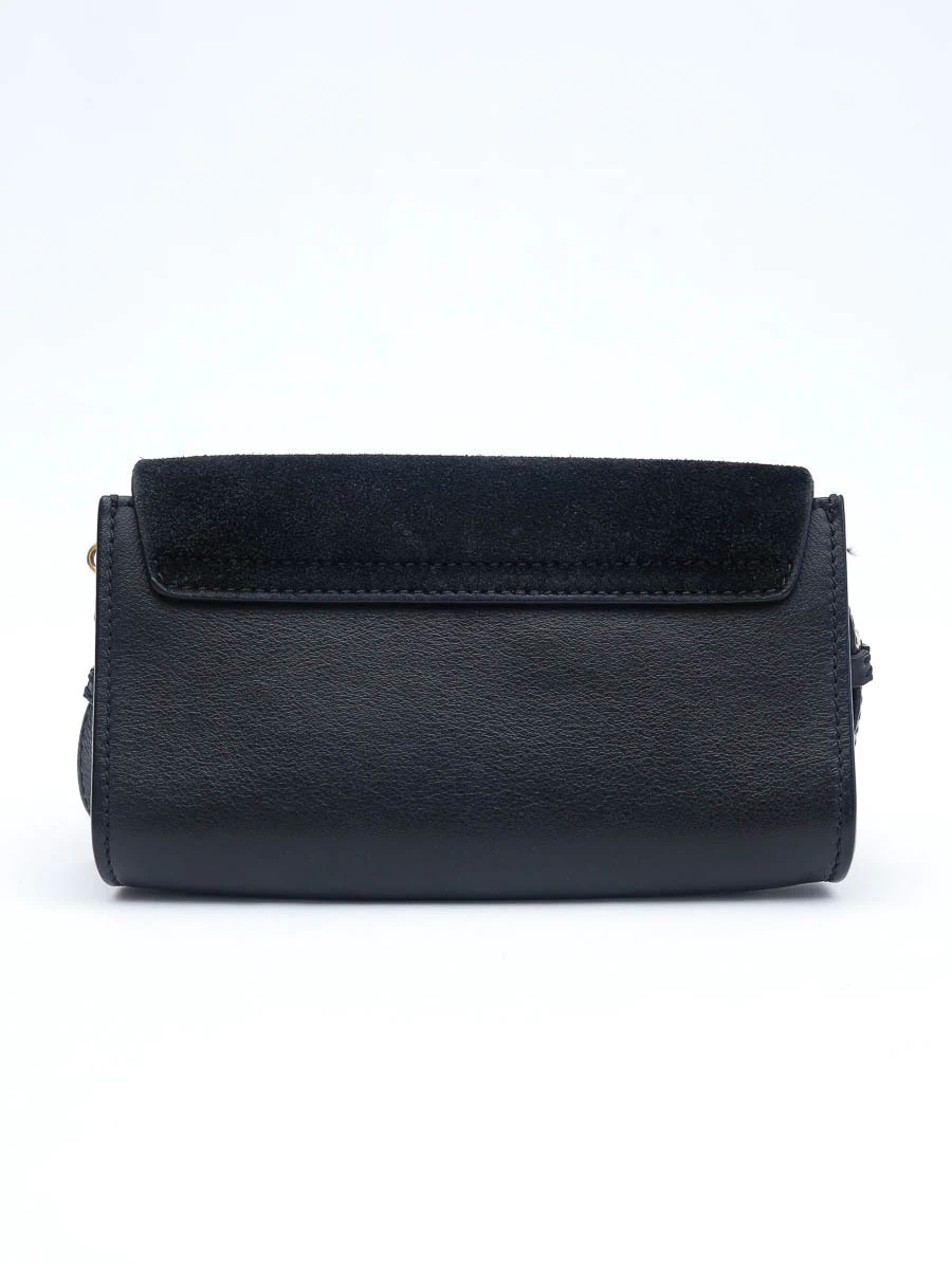 Bolsa Chloé Faye Small confeccionada em couro e camurça na cor preta no tamanho pequeno. No formato retangular, apresenta três compartimentos internos, alça regulável em couro, alças de mão, e abertura com clique. Possui metais dourados e pequena corrente removível.