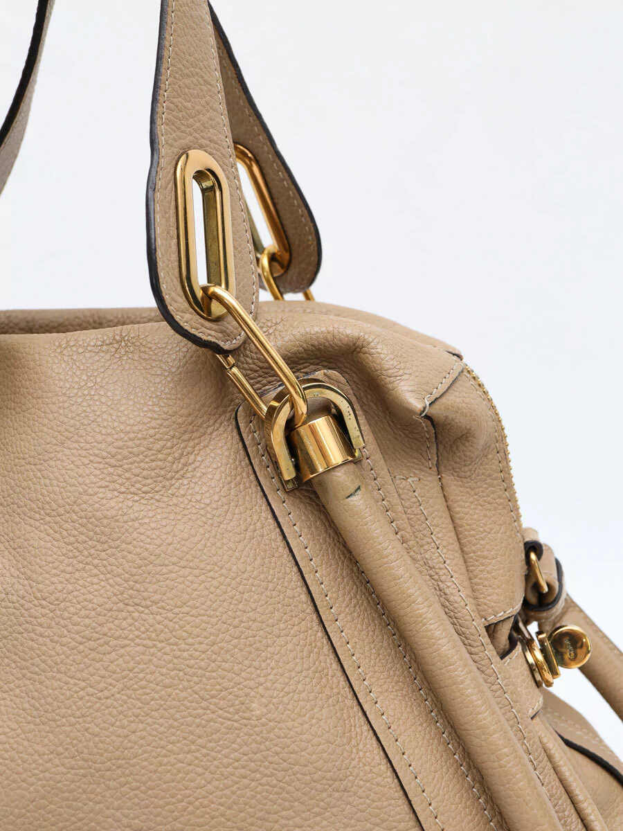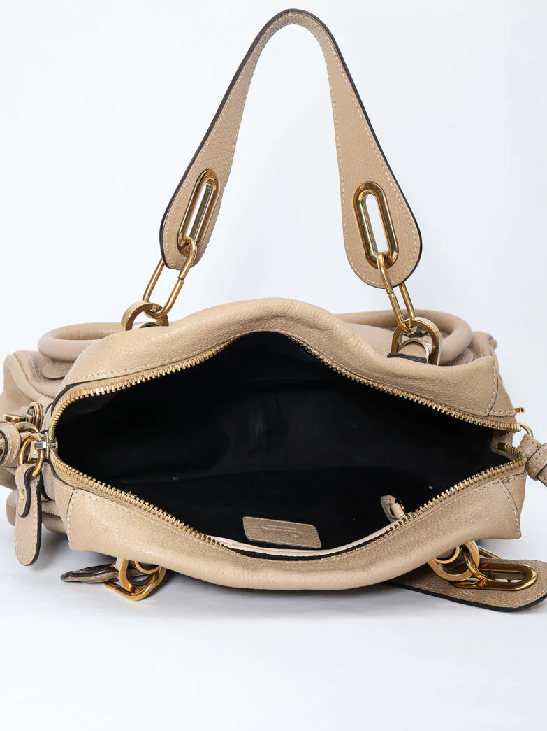 A Bolsa Original Chloé Medium Paraty é um clássico da marca. Produzida em couro bege com textura granulada e ferragens douradas, apresenta abertura superior com zíper, confortável alça de ombro e duas alças de mão.