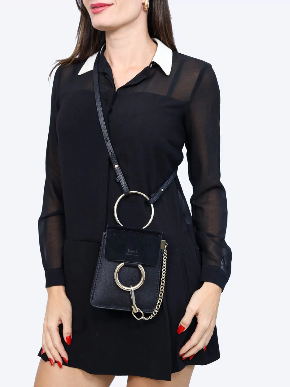 Bolsa Original Chloé Mini Faye Bracelet é uma bolsa divertida e elegante para se apaixonar. Produzida em couro de bezerro com aba em camurça na cor preta, apresenta alça longa removível e um um adorável alça estilo bracelete para ser usada como pulseira. Seu interior é o suficiente para carregar um celular plus size, documentos pessoais e pequena maquiagem.