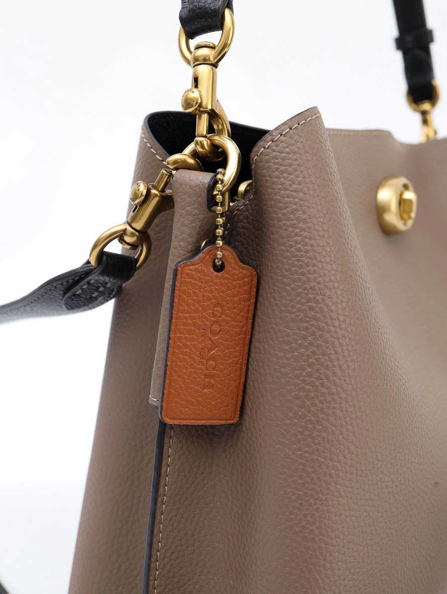 Bolsa Seminova Original Coach Bucket Willow produzida em couro texturizado marrom com metais na cor dourada. Apresenta uma alça de ombro pequena, alça longa removível com ajuste de comprimento, ambas na cor preta. Além de três compartimentos internos, sendo o central com abertura por zíper e bolso lateral, o frontal através de fecho giratório e o traseiro por botão com indução magnética.