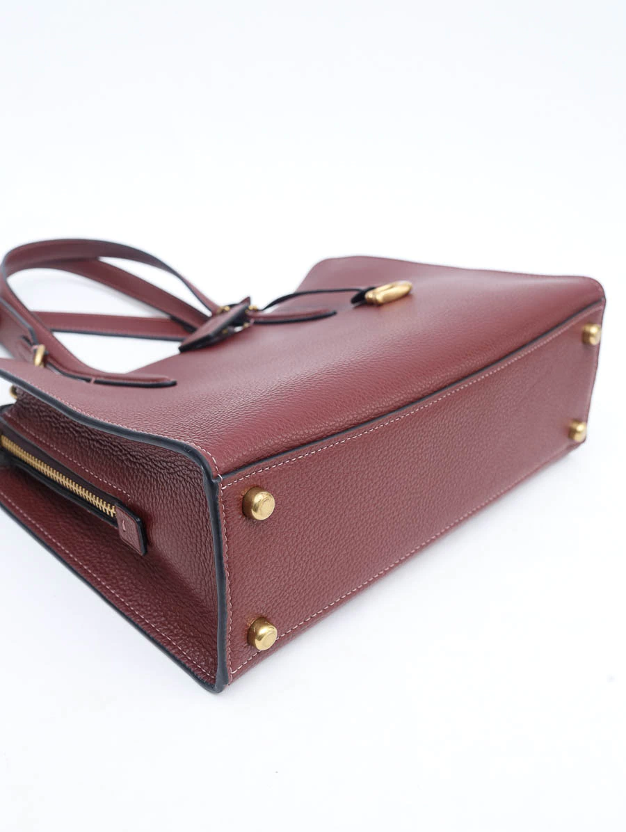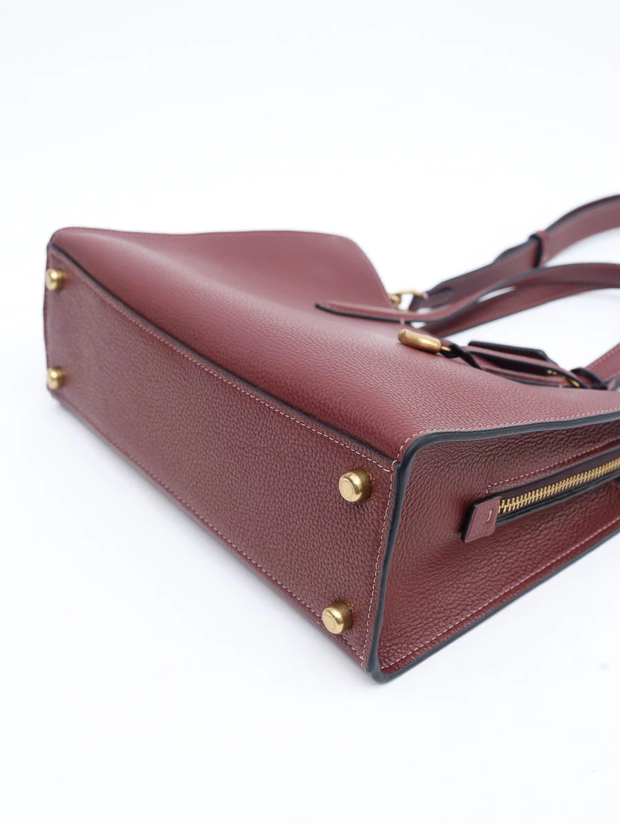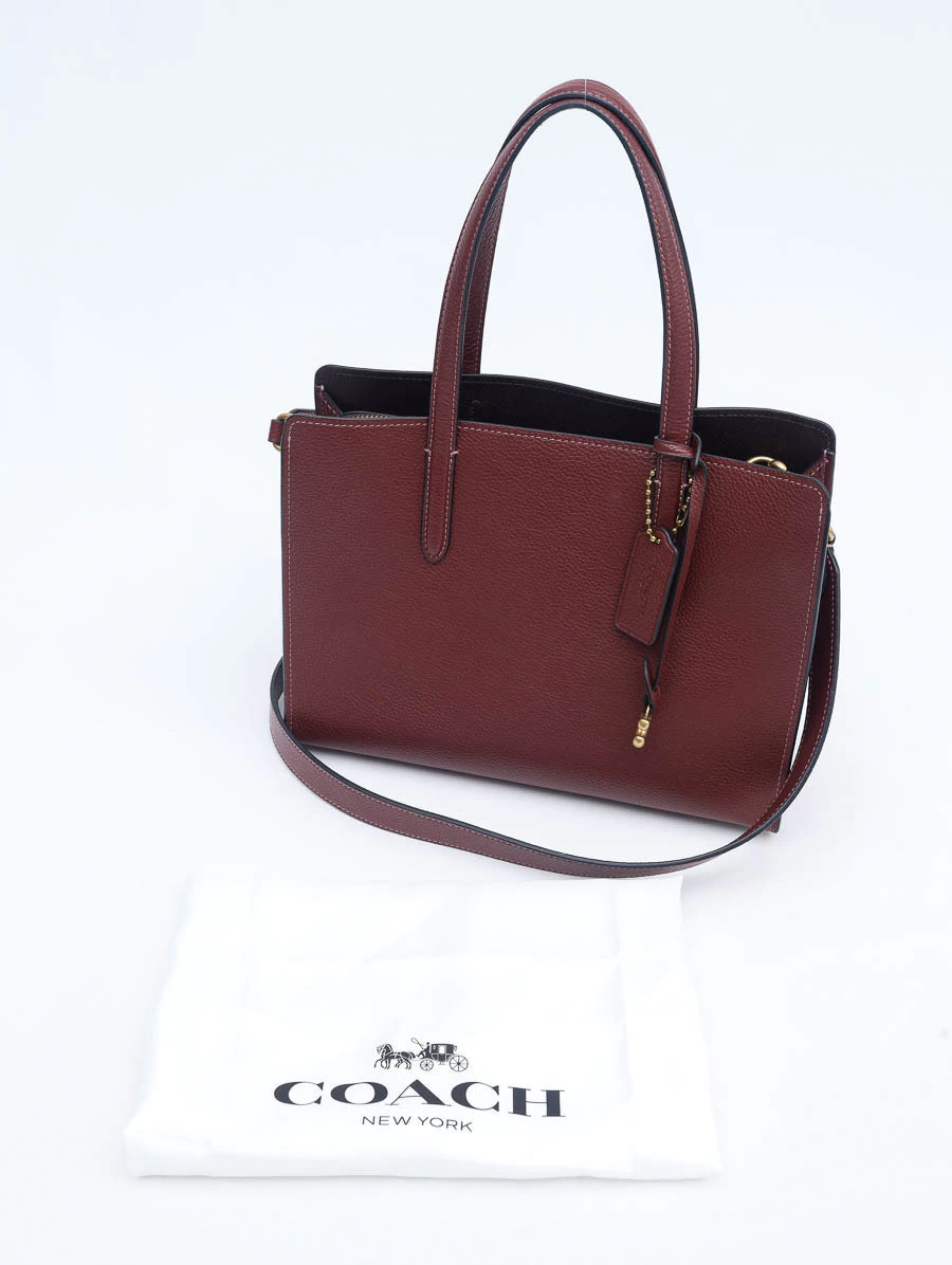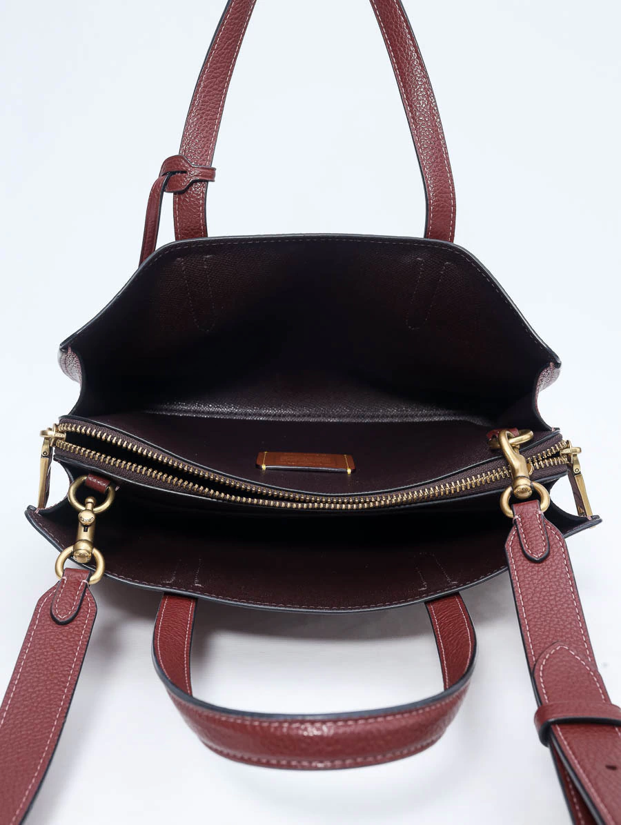 A Bolsa Coach Carryall Satchelé a escolha perfeita para o seu dia a dia. Produzida em couro com textura granulada na cor bordô e metais dourados. Apresenta alça longa removível com ajuste de comprimento, duas alças de mão, dois compartimentos abertos (um deles tendo um bolso interno) e um com zíper.