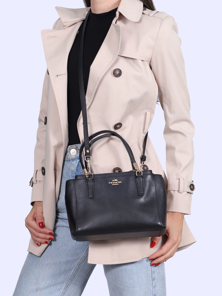 Bolsa Coach Christie Tote Dual Zíper produzida em couro texturizado com metais dourados, abertura superior principal com fecho magnético e dois compartimentos com zíper. O modelo apresenta duas alças de mão e uma alça longa (crossbody) removível com ajuste de comprimento.