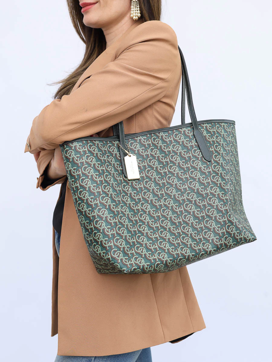 Bolsa Coach City Tote confeccionada em couro e canvas na cor verde com o icônico padrão da marca, possui um design espaçoso e funcional, ideal para o dia a dia. Suas alças duplas de ombro garantem conforto no uso, enquanto o fechamento magnético proporciona praticidade no dia a dia. O interior conta com um amplo compartimento único e um bolso médio com zíper, ideal para manter seus itens organizados com segurança. Elegante e versátil, essa bolsa é perfeita para qualquer ocasião.