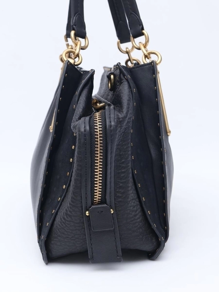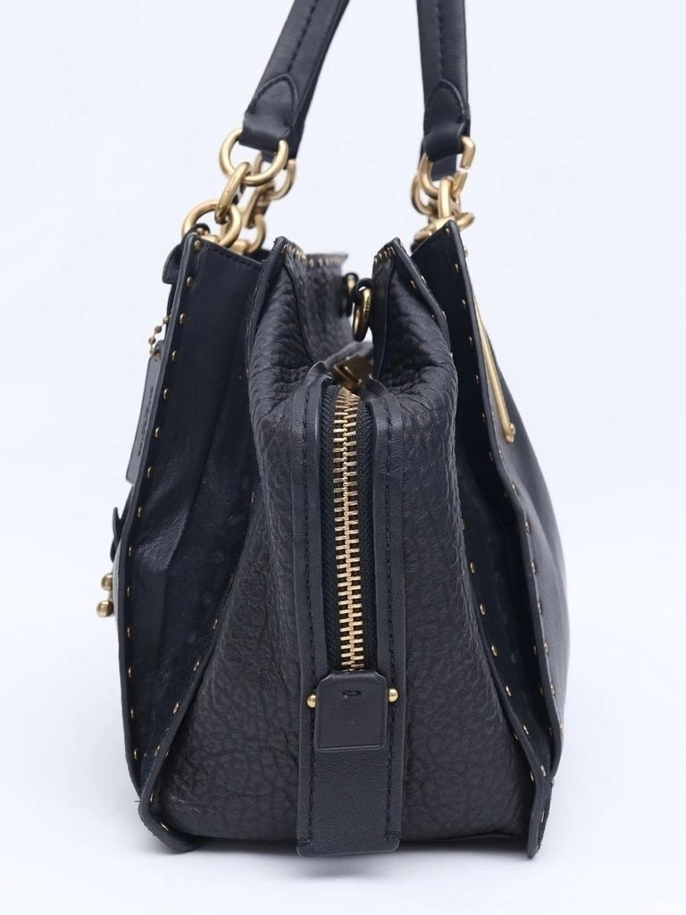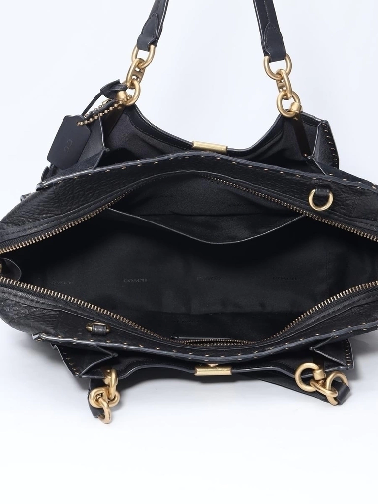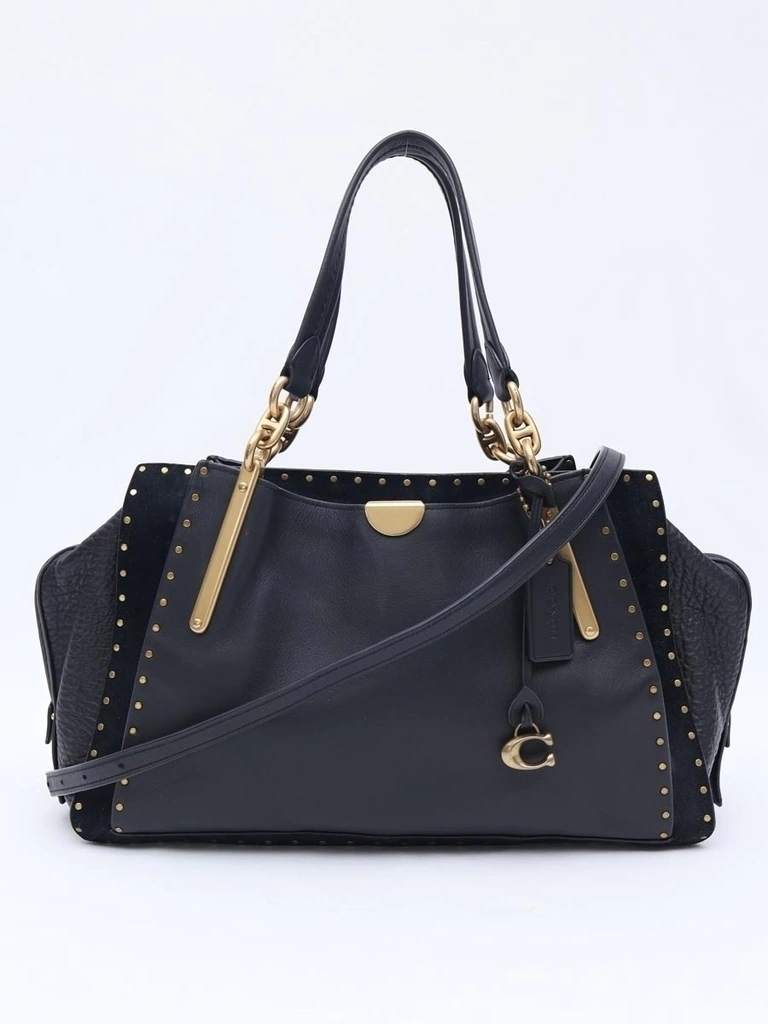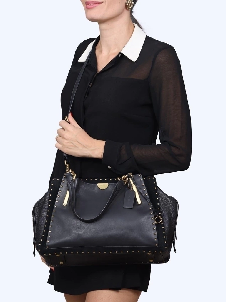 A Bolsa Autêntica Coach Dreamer Spikes é uma perfeita escolha para quem procura uma bolsa muito elegante e rica em detalhes luxuosos. Produzida com três tipos de couros nobres e metais dourados fosco, apresenta alças de ombro, alça longa removível com ajuste de comprimento, abertura superior com dois zíperes e detalhes com tachas nas bordas.