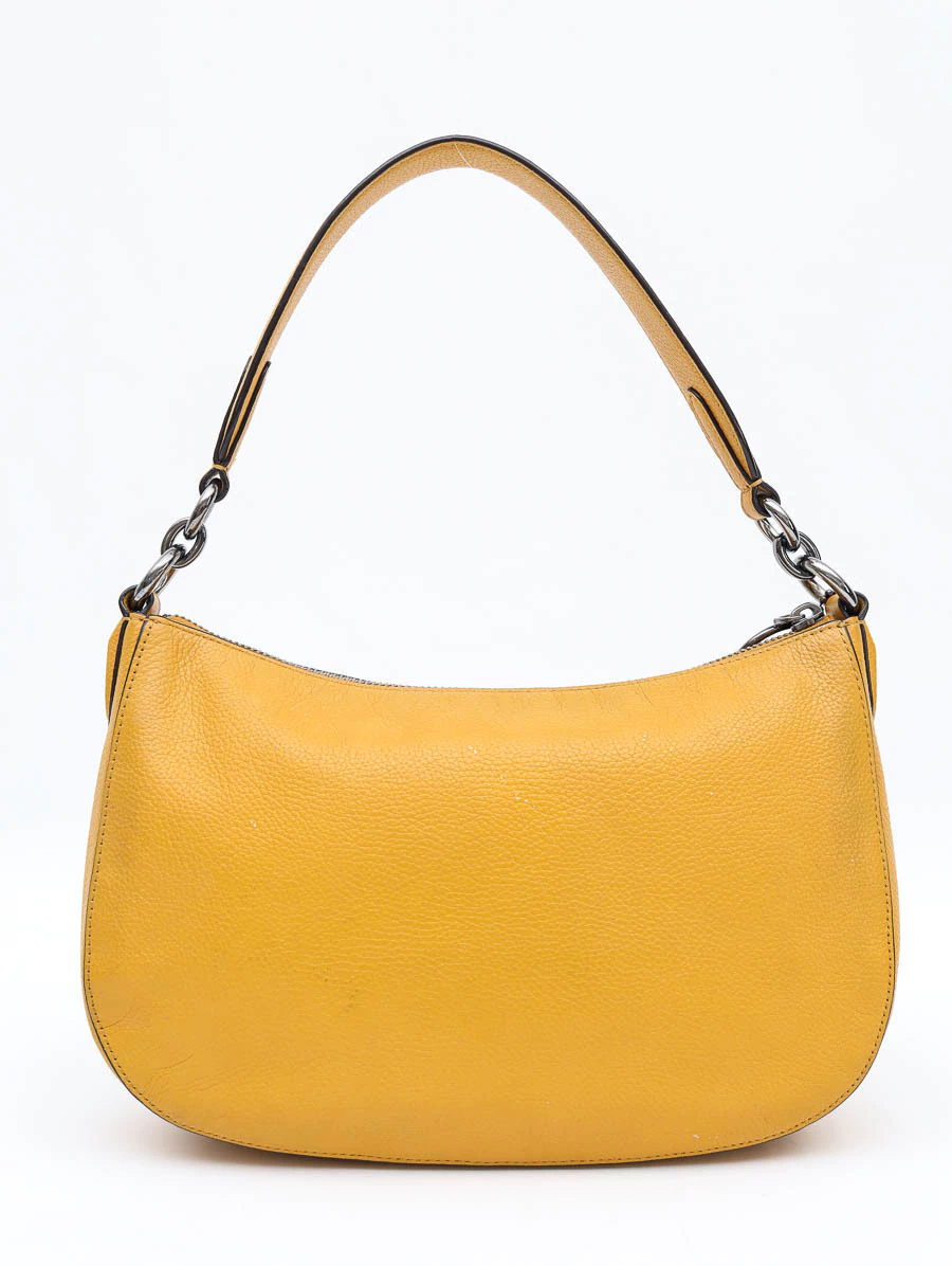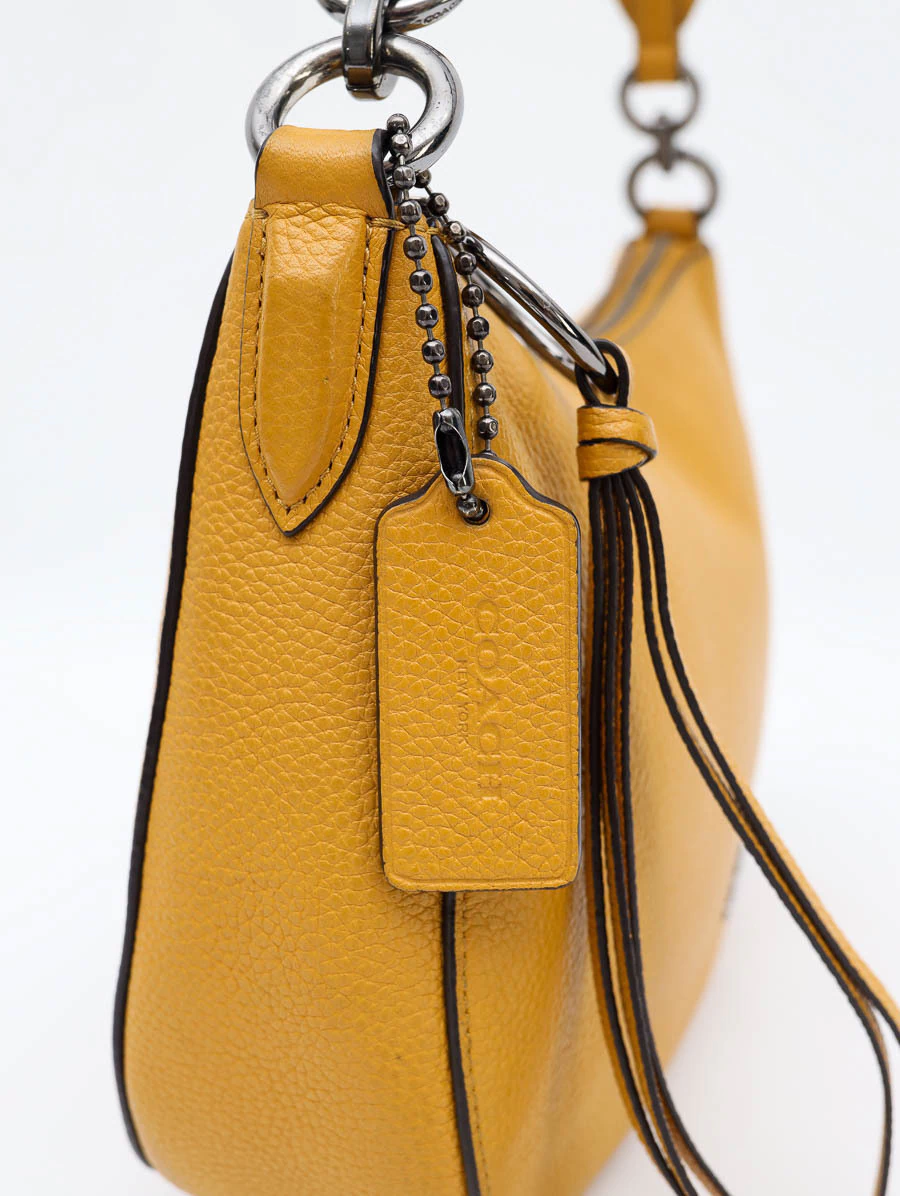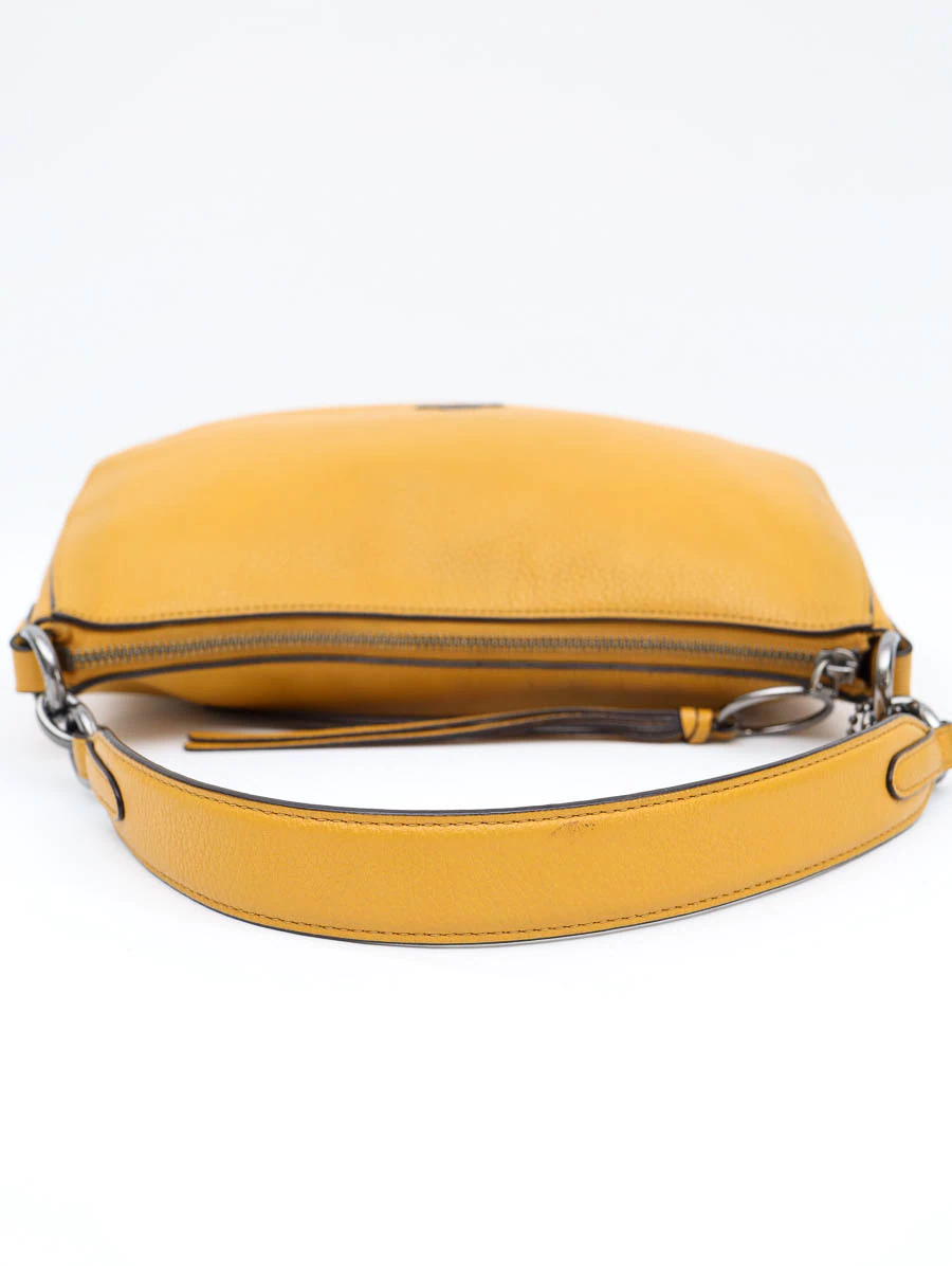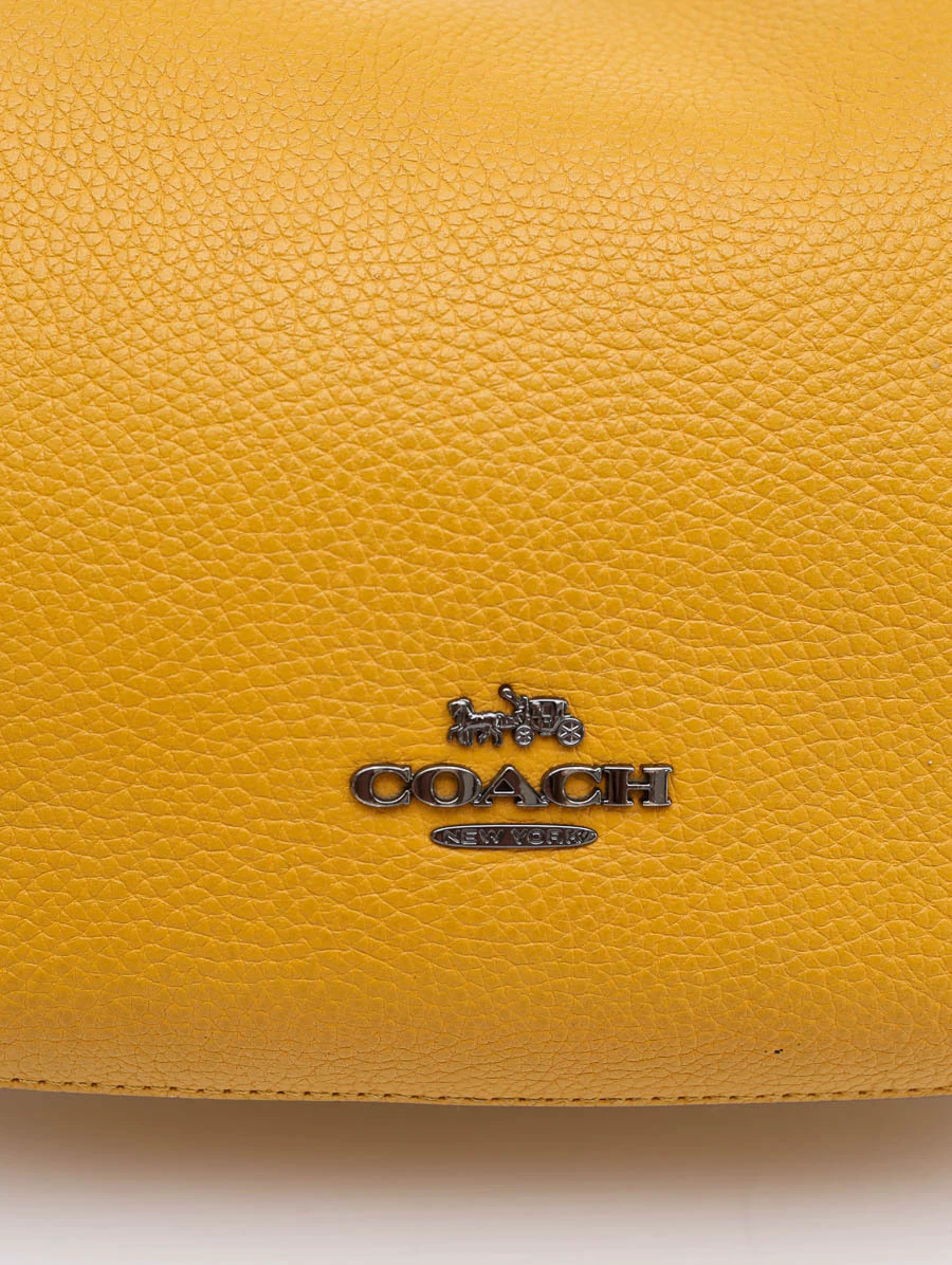 Bolsa Original Coach Half Moon produzida em couro texturizado na cor mostarda e metais rutênio. Apresenta alça longa removível com ajuste de comprimento, alças de ombro, abertura superior com zíper e um bolso aberto.