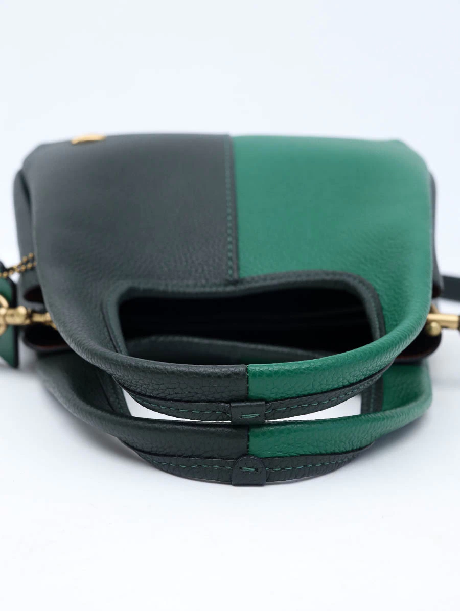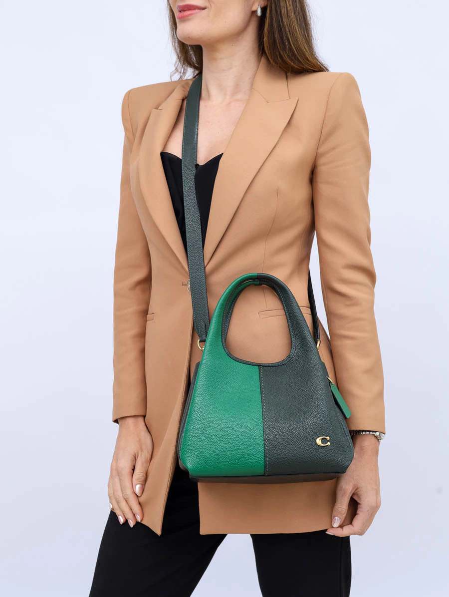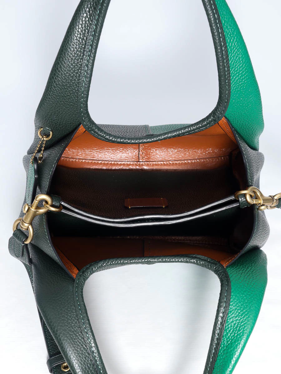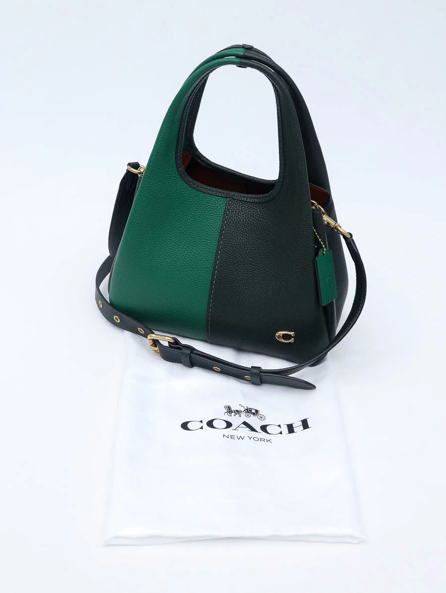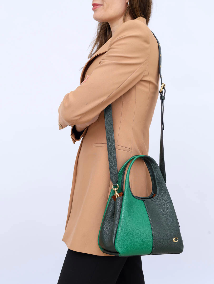 A Bolsa Original Coach Lana Bicolore é uma peça de tamanho médio que combina um design inovador e moderno com funcionalidade prática. Com seu elegante visual bicolor em tons de verde folha e verde musgo, ela se destaca como um acessório versátil para diversas ocasiões. O interior é revestido em luxuoso couro marrom e apresenta três compartimentos internos, oferecendo organização e sofisticação. Além disso, a bolsa vem com uma alça longa removível e ajustável, permitindo múltiplas formas de uso com conforto e estilo.