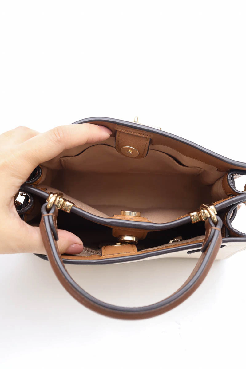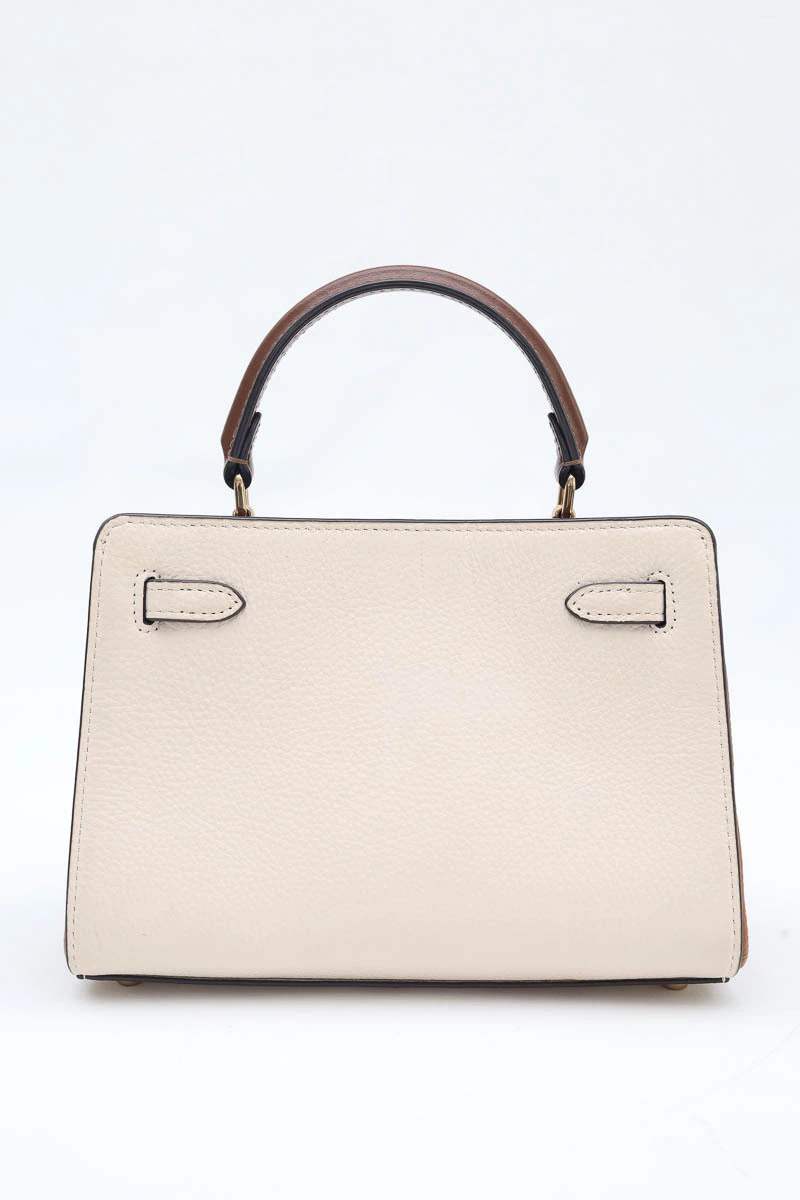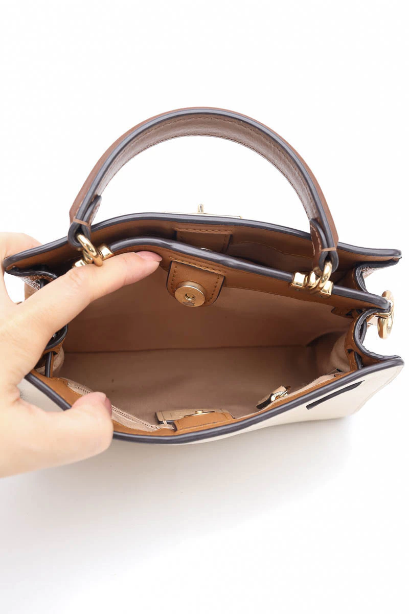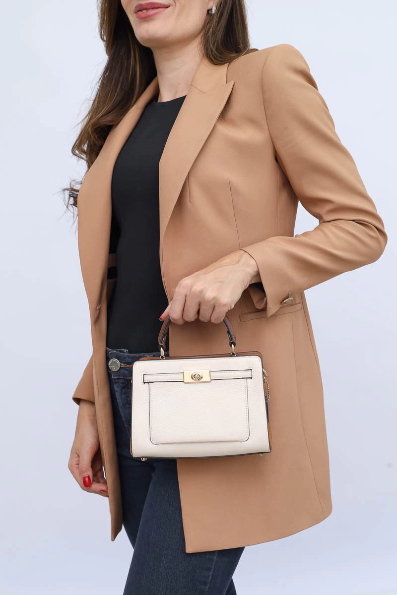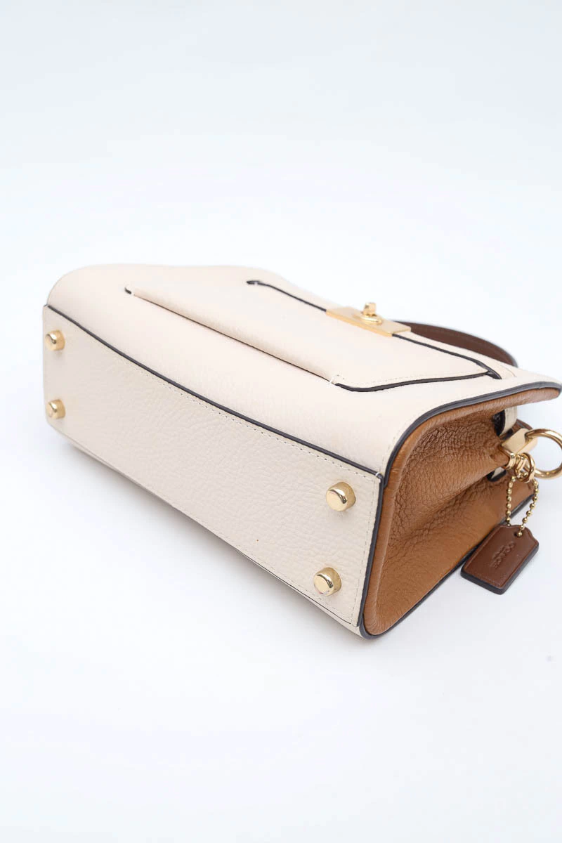 Bolsa Coach Mini Lane Top produzida em couro em tons de marrom, caramelo e off white com metais dourados. Apresenta uma alça crossbody que pode ser regulada e utilizada como alça de ombro, uma alça de mão, além de um lindo pingente em couro marrom lateral. Possui dois compartimentos internos com fecho magnético (ambos com um bolso dentro) e um compartimento externo na parte frontal da peça.