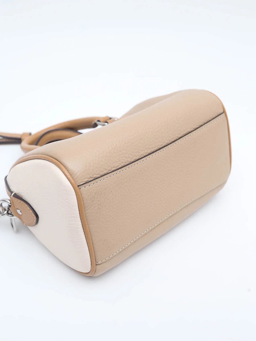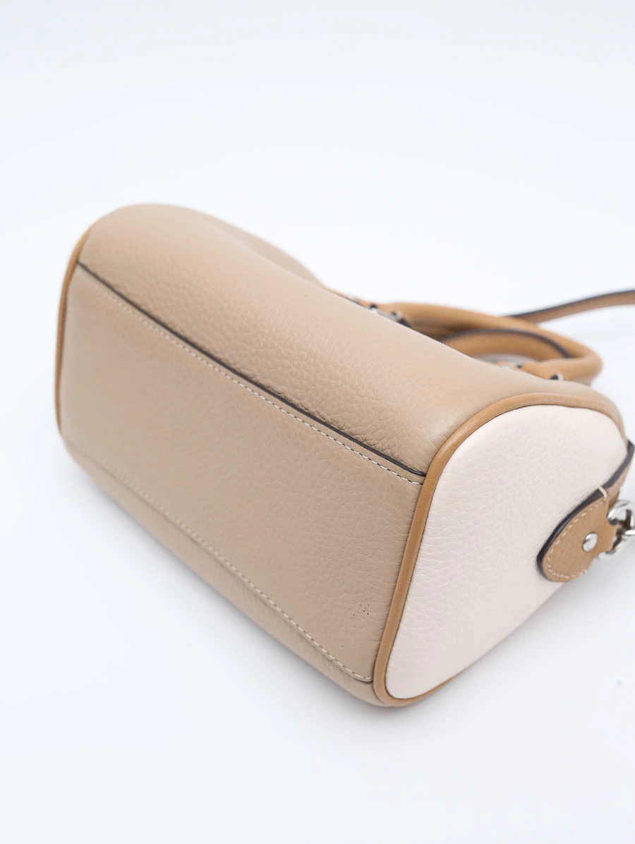 Bolsa Coach Mini Rowan produzida em couro em tons de nude e off white com metais dourados. Apresenta uma alça crossbody que pode ser regulada e utilizada como alça de ombro, duas alças de mão, além de um lindo pingente dourado na lateral. Possui compartimento único com fechamento por zíper e dois 'slots' internos para cartão.