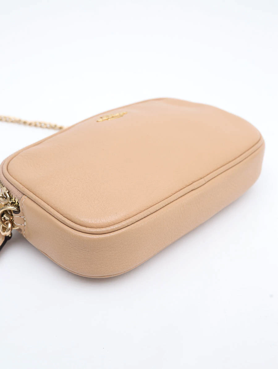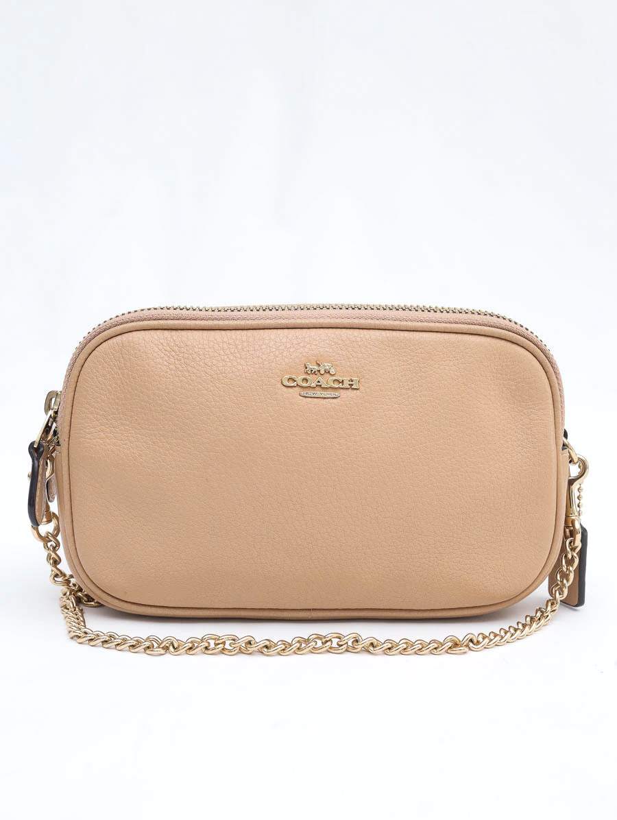 Bolsa Coach Pebble confeccionada em couro granulado na cor bege com ferragens douradas, apresenta dois compartimentos, com fecho por zíper e ambos possuindo bolsinhos internos. Também possui alça em corrente removível.