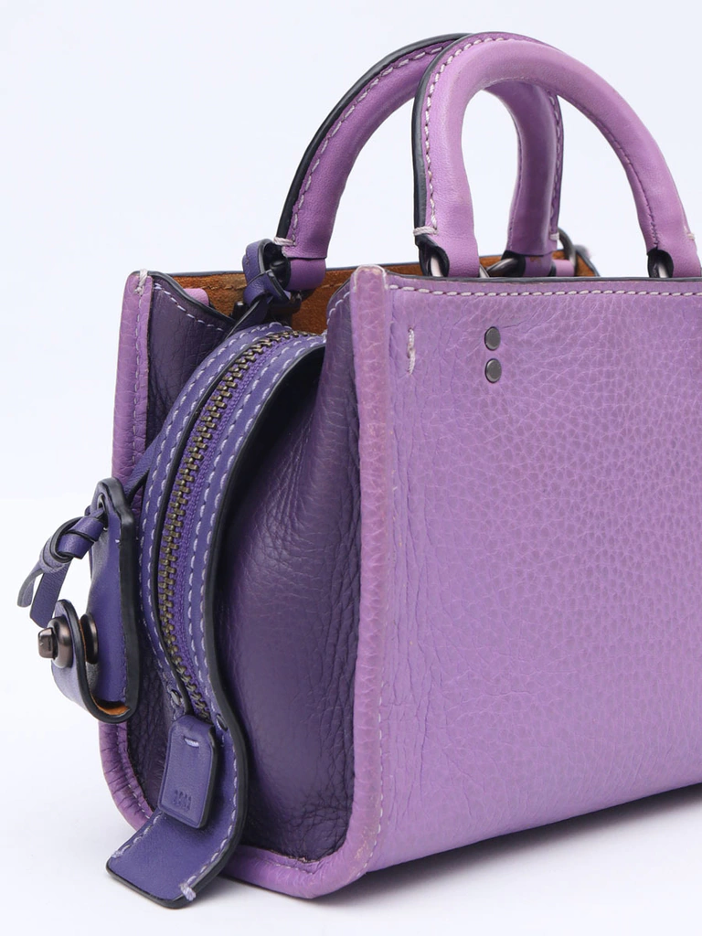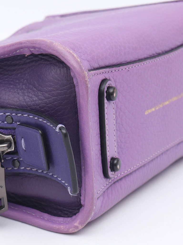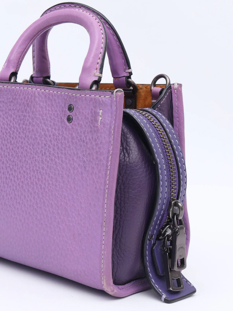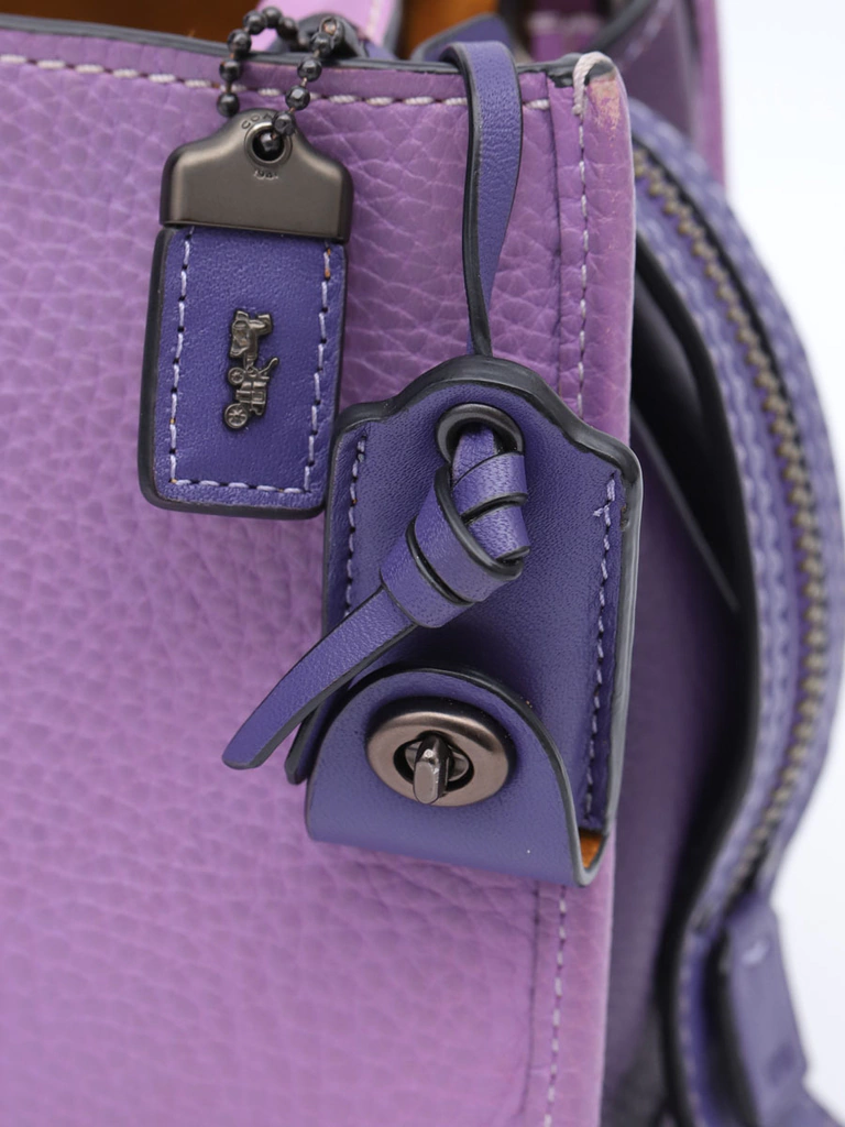 Bolsa Autêntica Coach Rogue 17 Colorblock produzida em couro Coach Glovetanned granulado na cor lilás, laterais na cor roxa e metais com banho preto fosco. Apresenta duas alças de mão, uma alça longa removível com ajuste de comprimento, dois compartimentos abertos, um compartimento central com zíper, um bolso interno com zíper e um slot para cartões. Uma bolsa luxuosa da marca Coach, rica em detalhes e materiais.