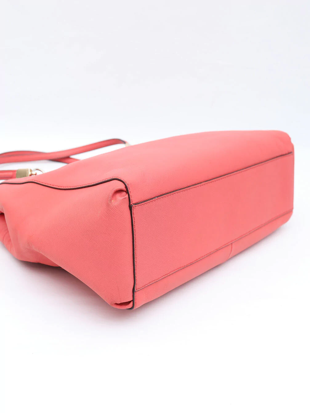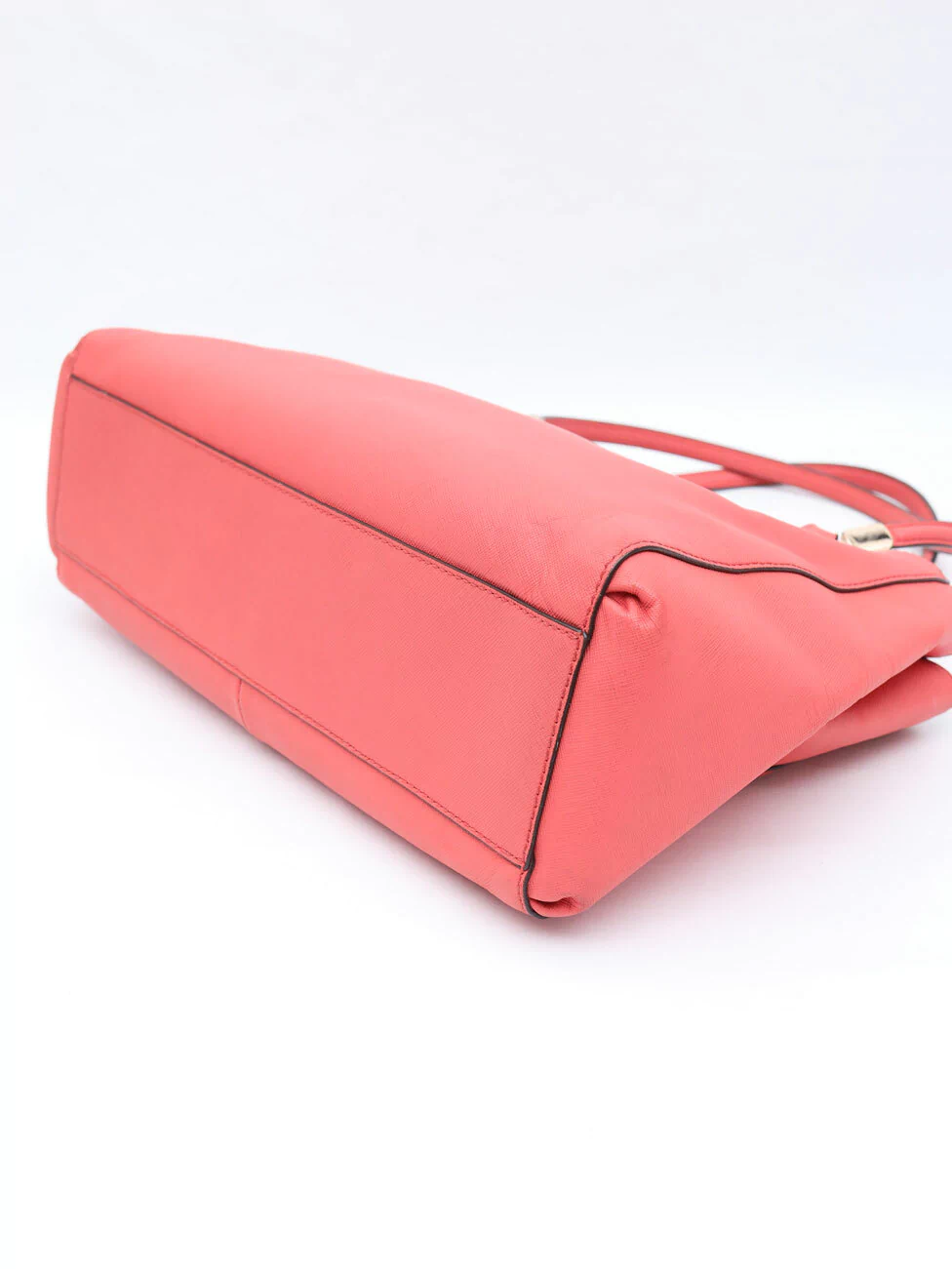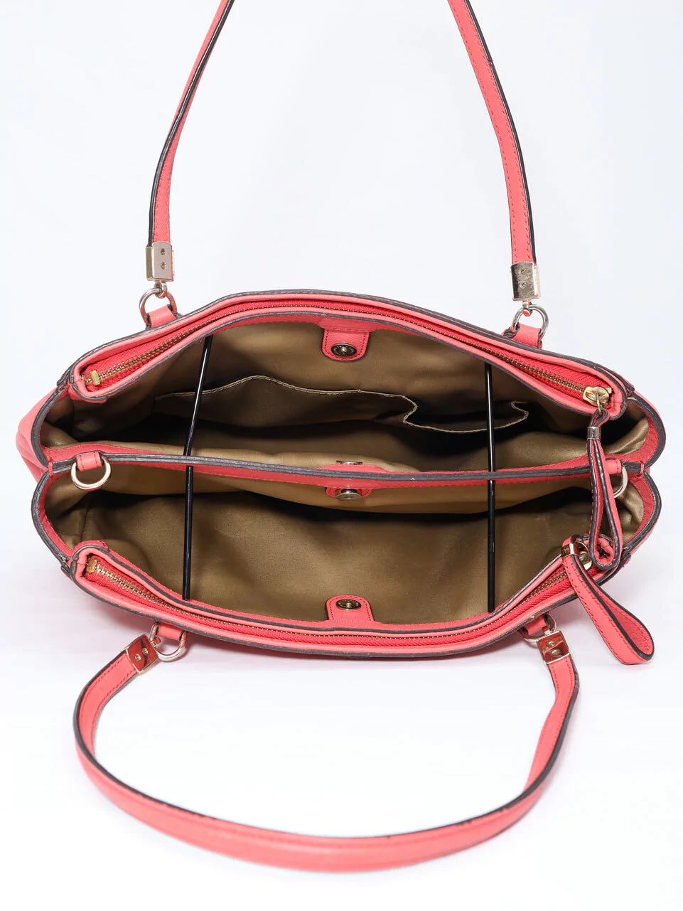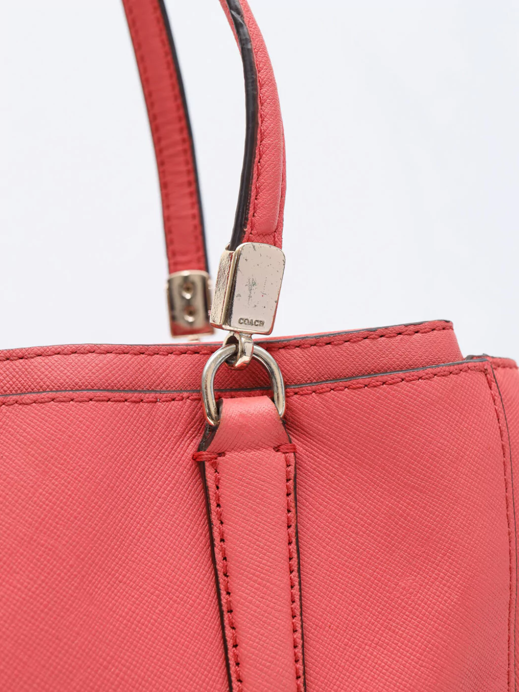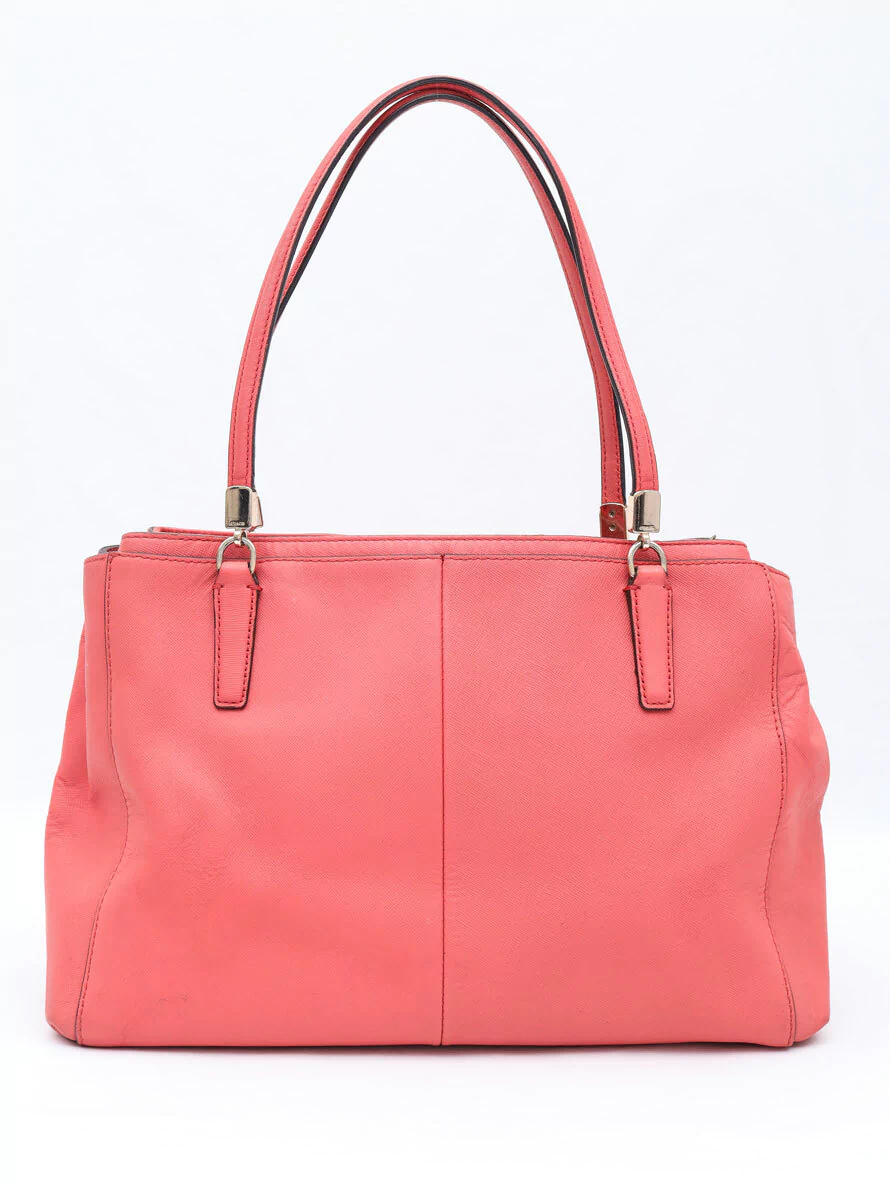 Bolsa Autêntica Coach Sholder Tote Salmon produzida em couro rosa e ferragens douradas. Apresenta alças de ombro, uma alça longa removível com ajuste de comprimento, abertura superior com quatro compartimentos (dois com zíper e dois com fecho magnético). Uma bolsa excelente para o uso diário.