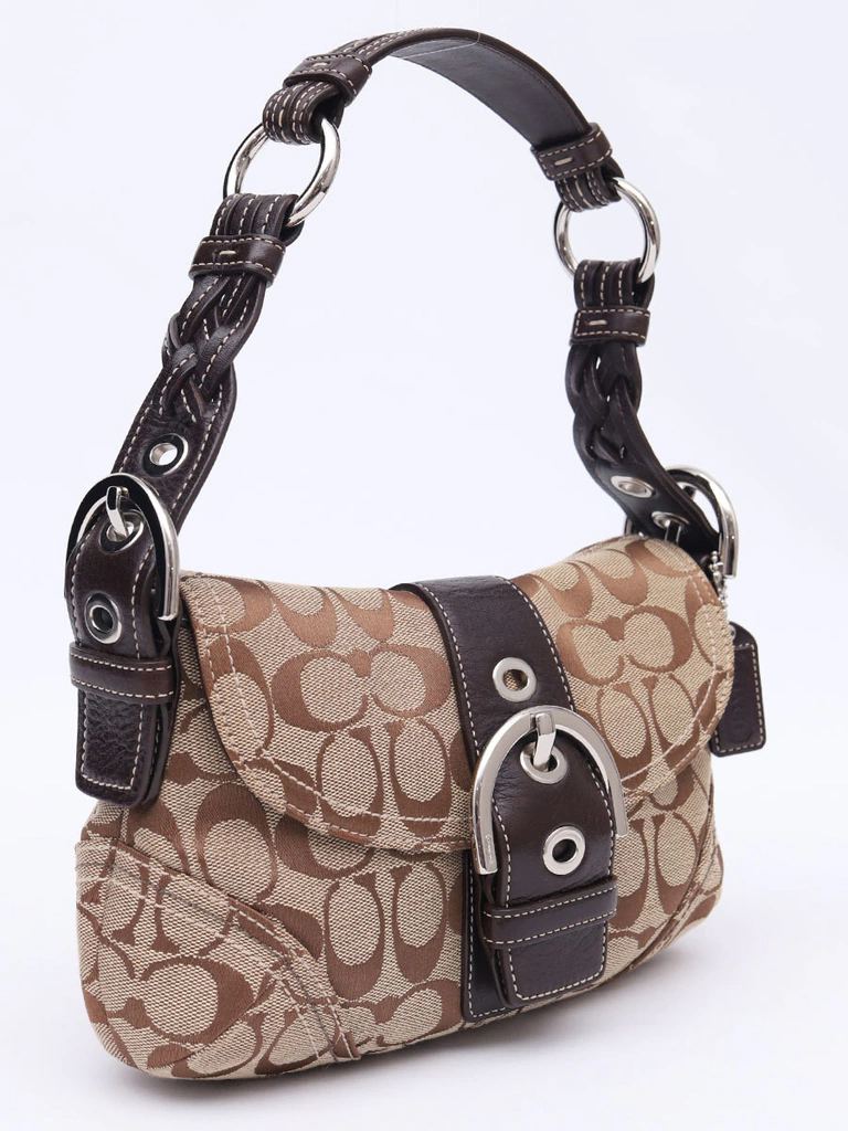 A Bolsa Original Coach Shoulder Signature é uma bolsa maravilhosa e muito elegante para ser usada todos os dias. Produzida em material jacquard com estampa clássica Coach Signature em tons marrom, com detalhes em couro e alça com um lindo trabalho trançado e pespontos brancos, apresenta metais na cor prata, abertura magnética oculta na parte de trás de um fecho decorativo em fivela e interior com 3 bolsos.