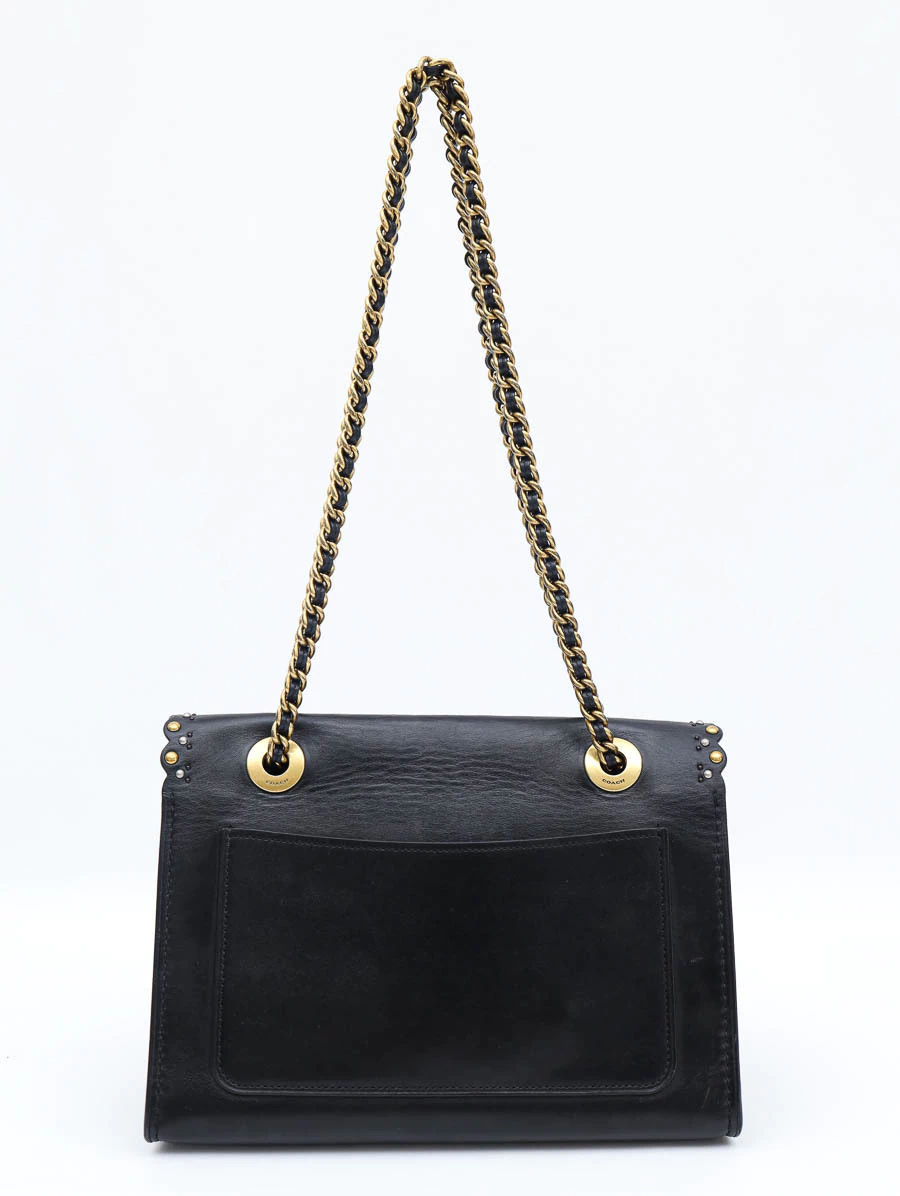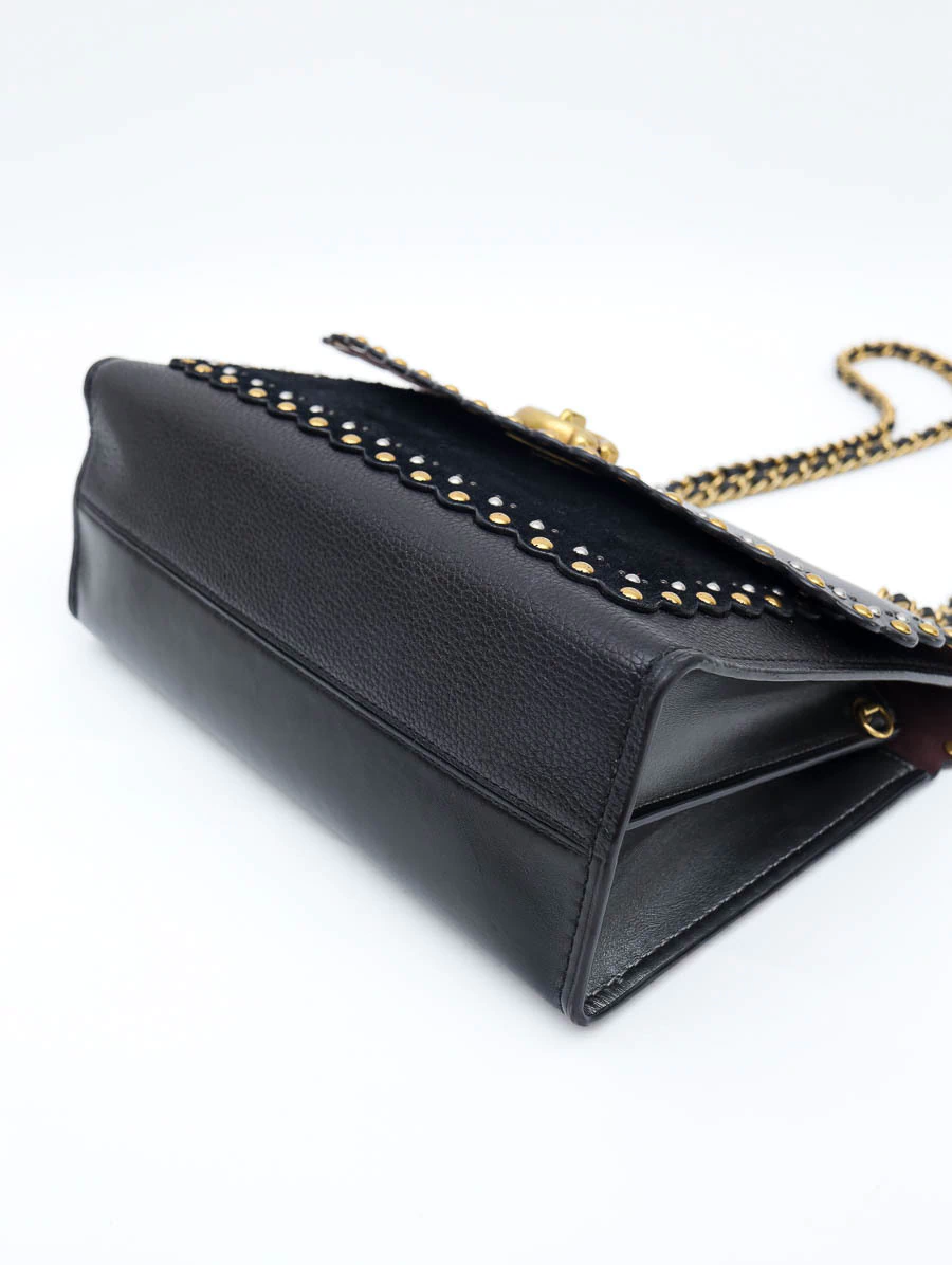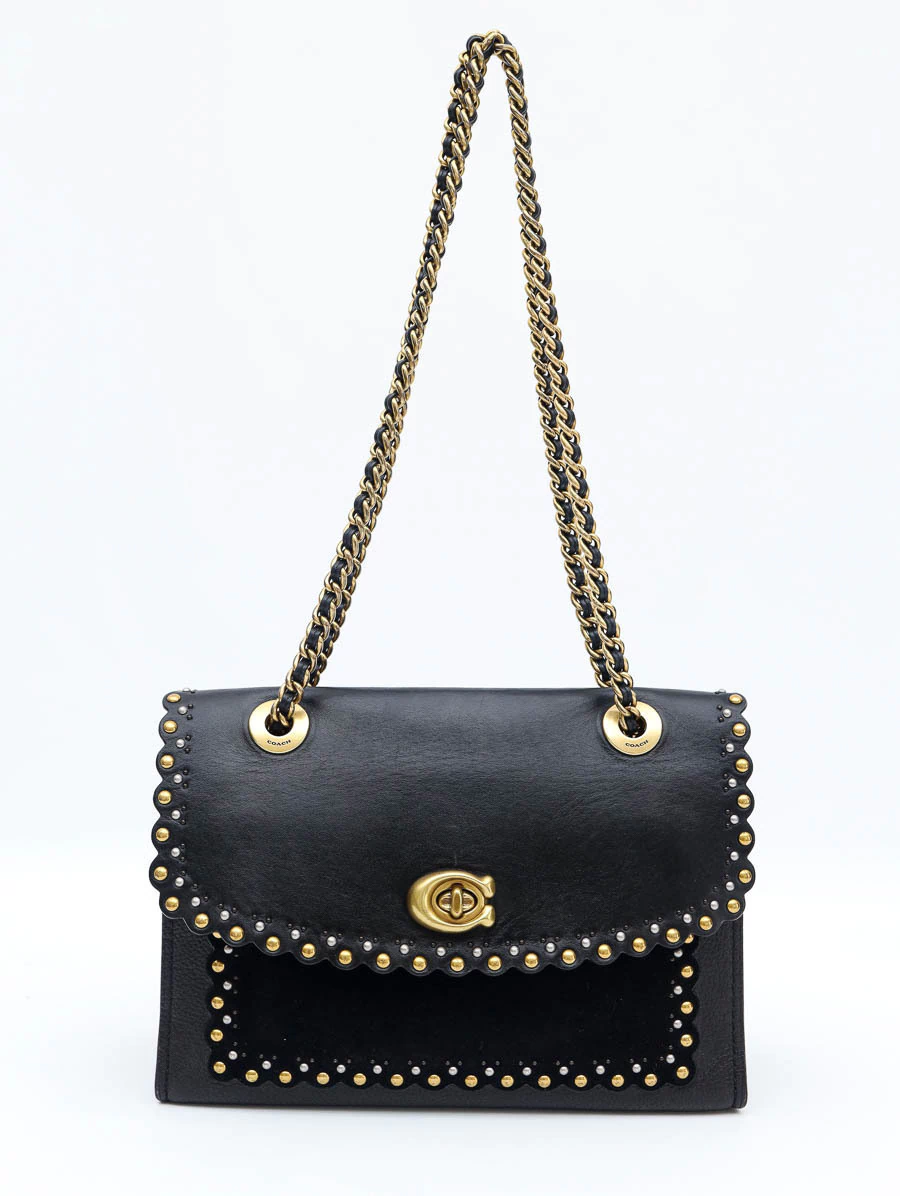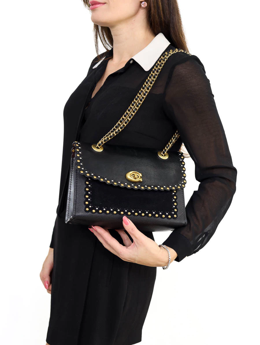 Bolsa Original Coach Spikes Crossbody produzida em couro na cor preta e metais dourados. Apresenta alça longa, abertura por fecho de encaixe, dois compartimentos e dois bolsos, sendo um aberto e um com zíper e um bolso aberto na parte externa.