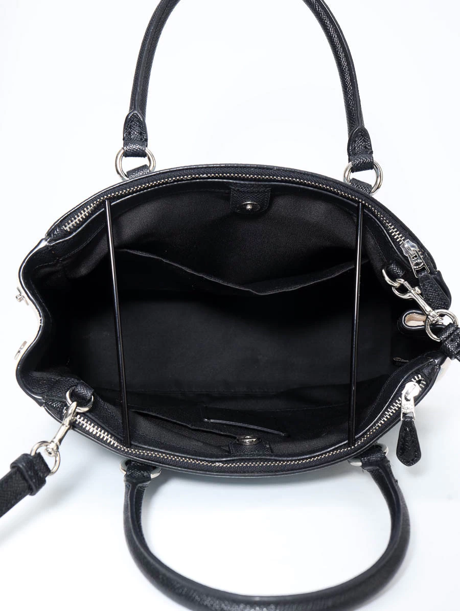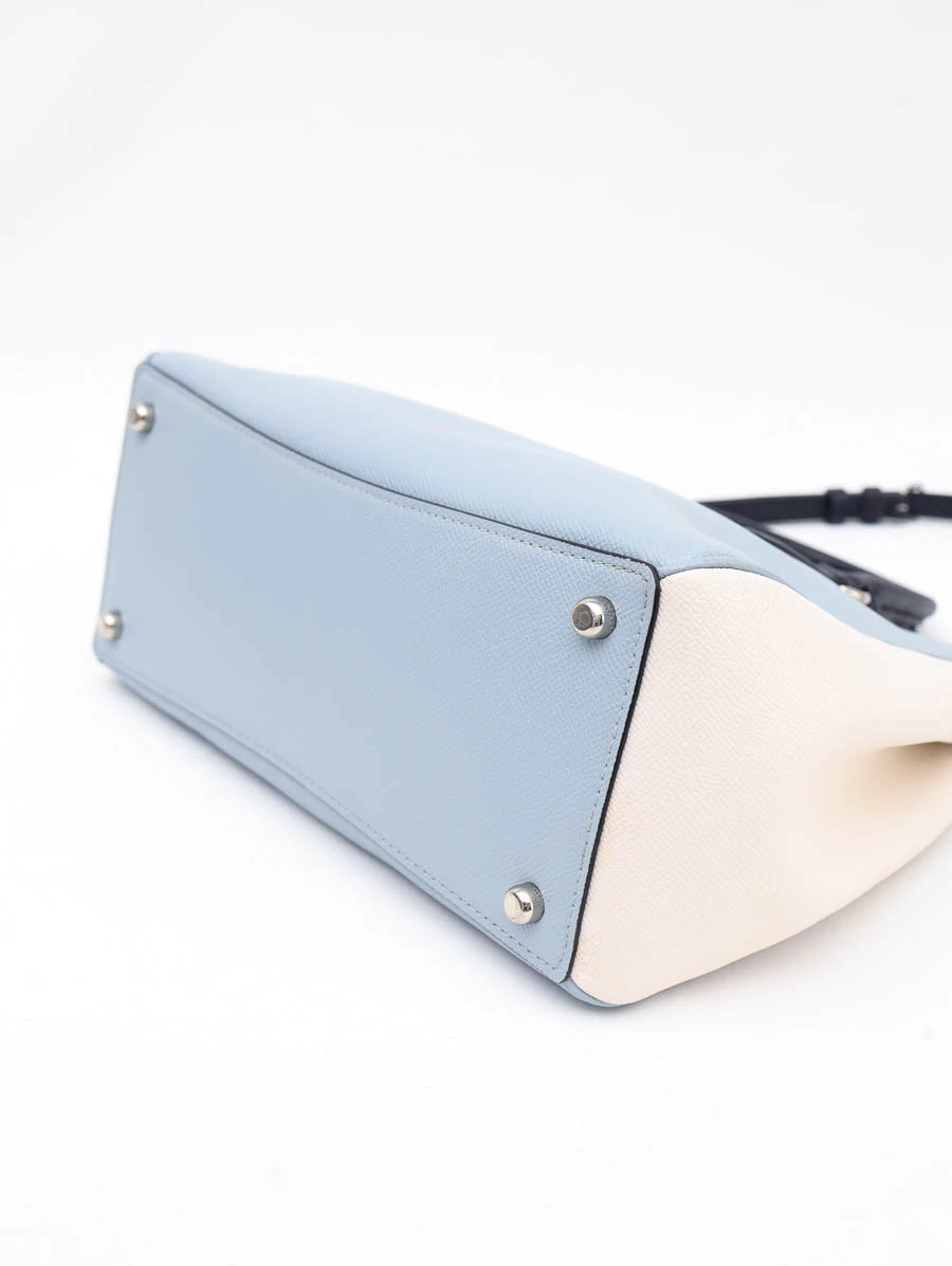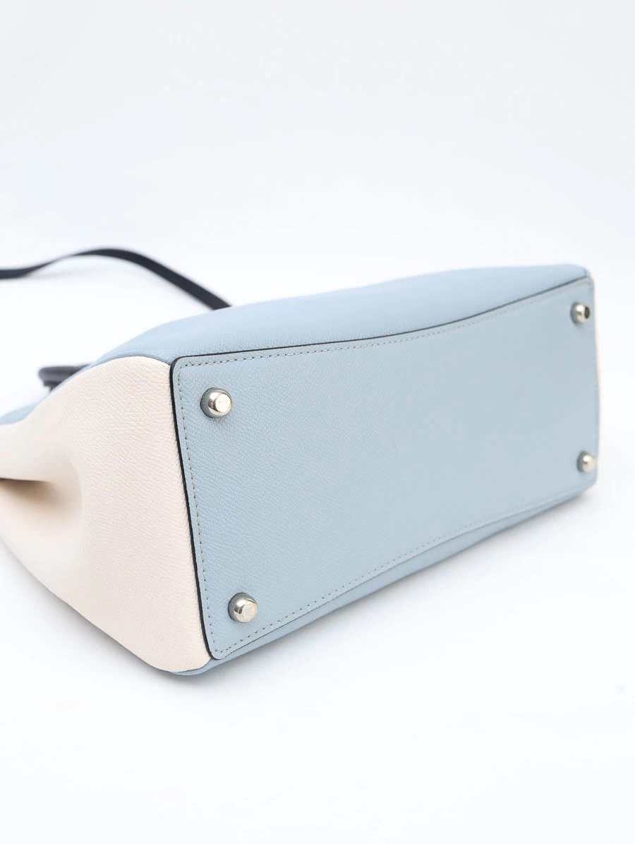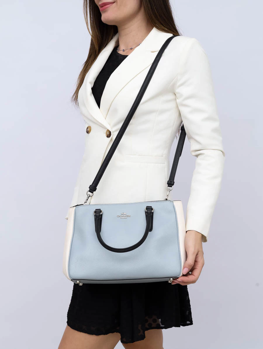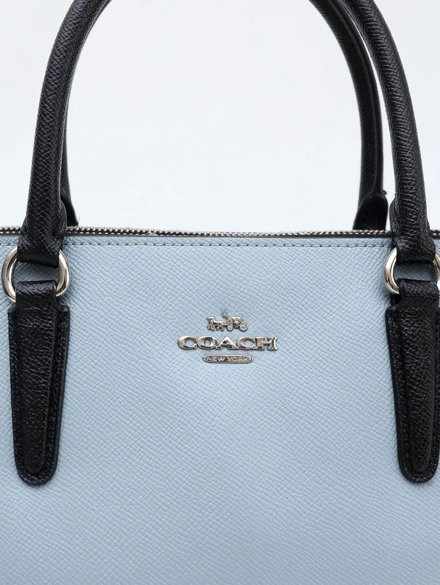 Bolsa Seminova Original Coach Tri Color produzida em couro texturizado azul claro, branco, preto e ferragens na cor prata. Apresenta uma alça de de mão, alça longa removível com ajuste de comprimento. Além de um compartimento interno central com fecho magnético e dois bolsos laterais, dois compartimentos laterais com zíper.