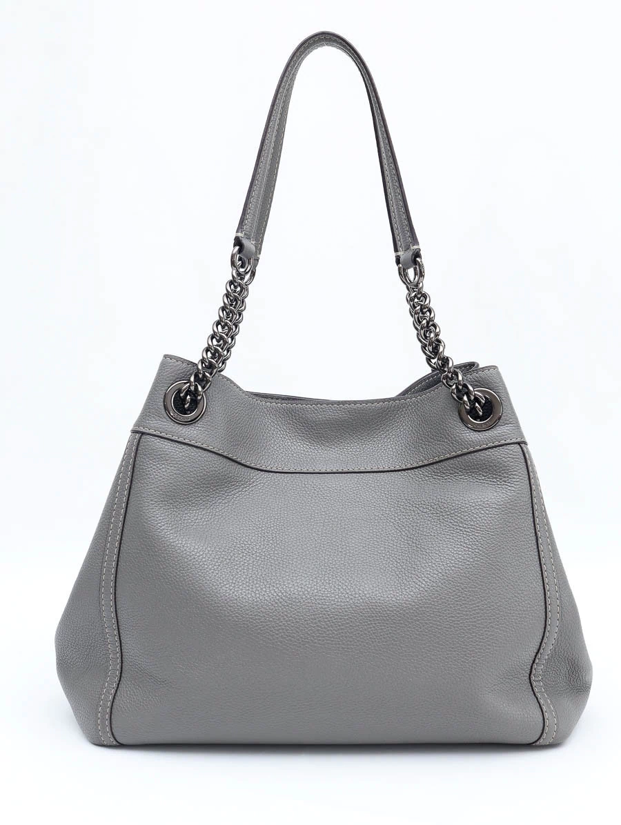 Bolsa Original Coach Turn Lock Mediaproduzida em couro na cor cinza. Apresenta abertura por fecho Turn Lock e três compartimentos, sendo dois abertos e um com zíper. Possui bolsos internos, alças de ombro e metais pratas.