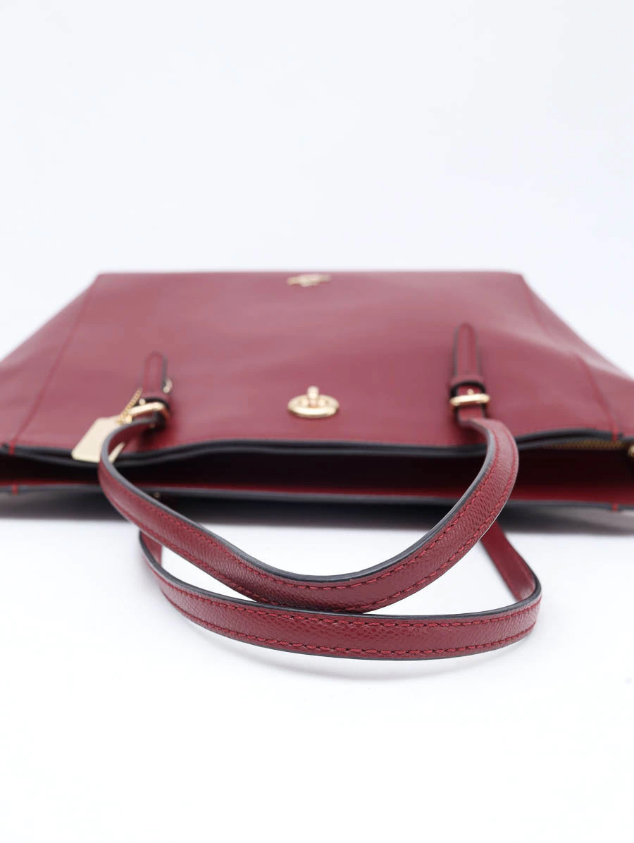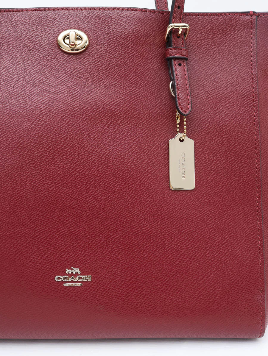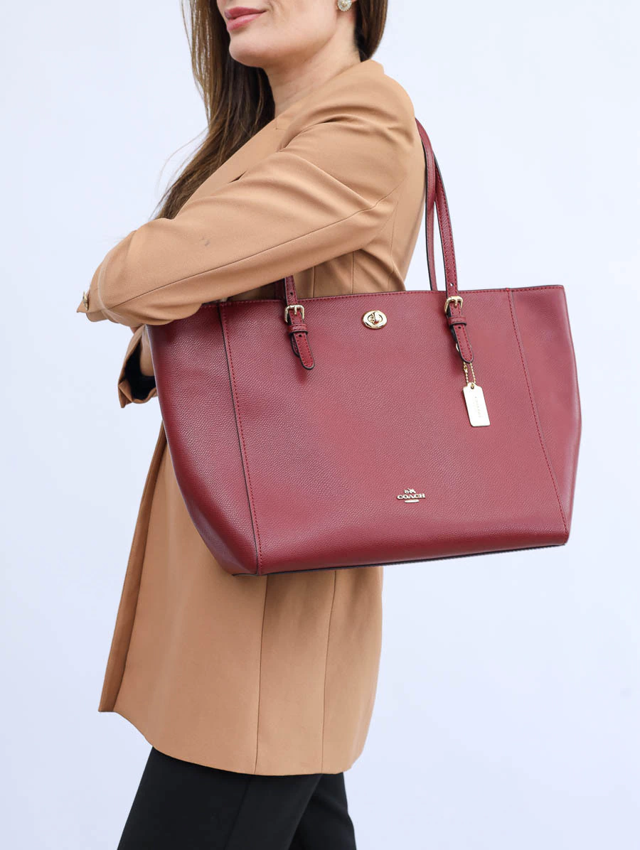 Bolsa Coach Turnlock Toteproduzida em couro na cor bordô e ferragens douradas, apresenta uma alça de ombro, abertura por zíper, um compartimento interno maior com dois bolsos abertos e um bolso com zíper.