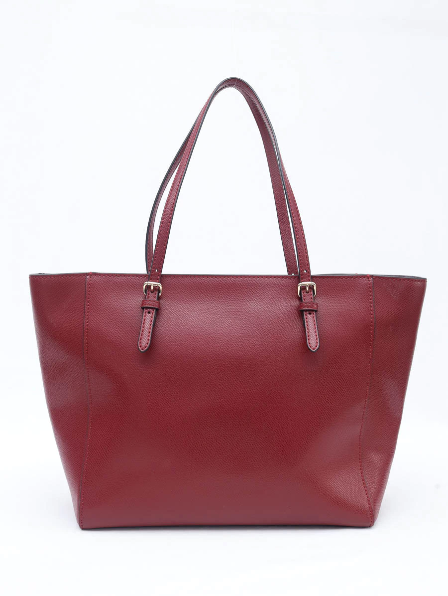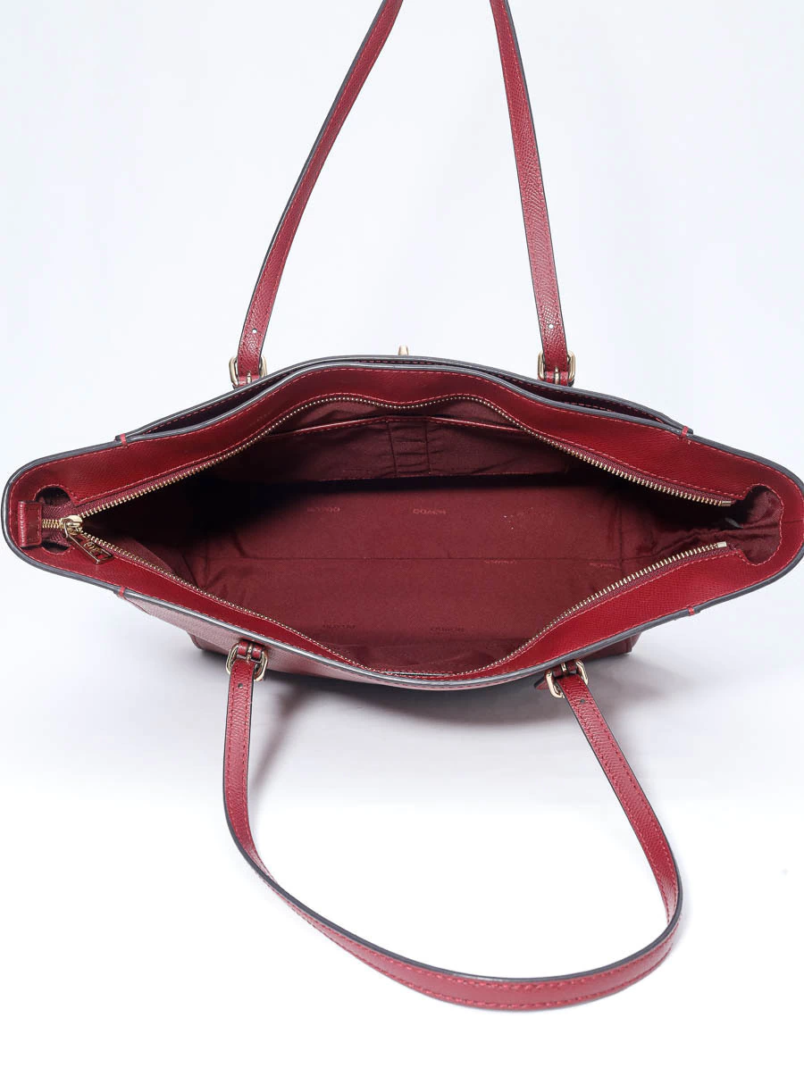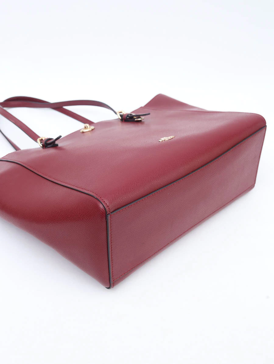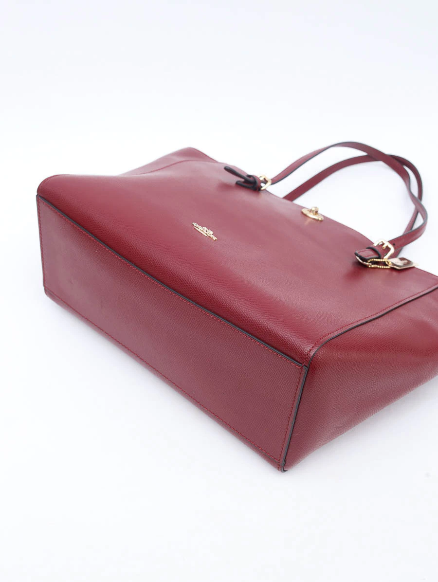 Bolsa Coach Turnlock Toteproduzida em couro na cor bordô e ferragens douradas, apresenta uma alça de ombro, abertura por zíper, um compartimento interno maior com dois bolsos abertos e um bolso com zíper.