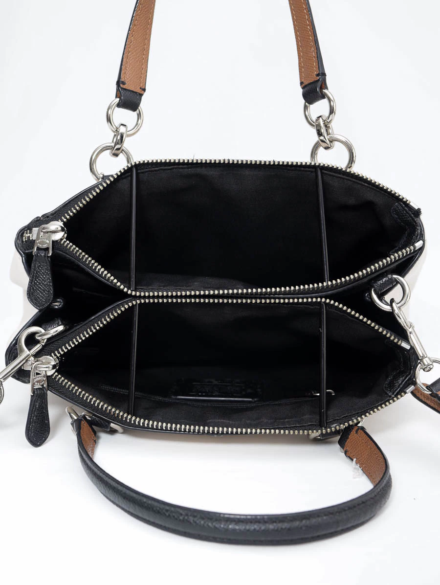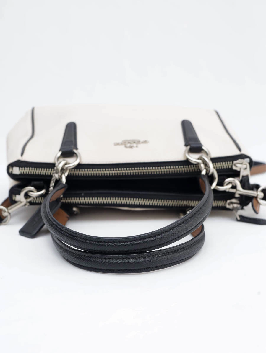 Bolsa Seminova Original Coach White/Black/Brown Leather produzida em couro texturizado branco e detalhes em preto e marrom com metais na cor prata. Apresenta duas alças de mão, alça longa removível com ajuste de comprimento, compartimento principal superior com fechamento magnético e dois compartimentos com zíper.