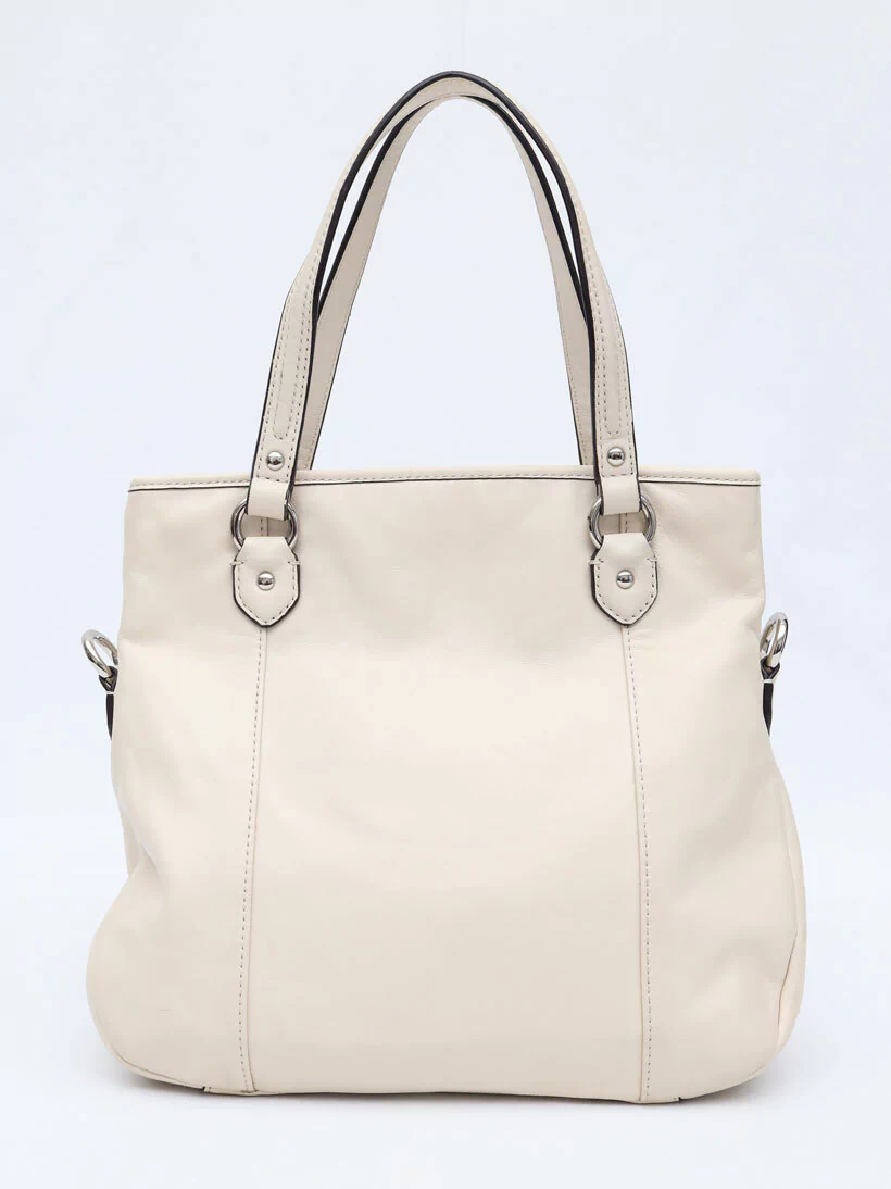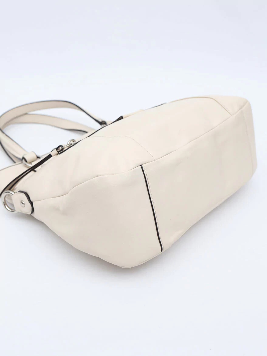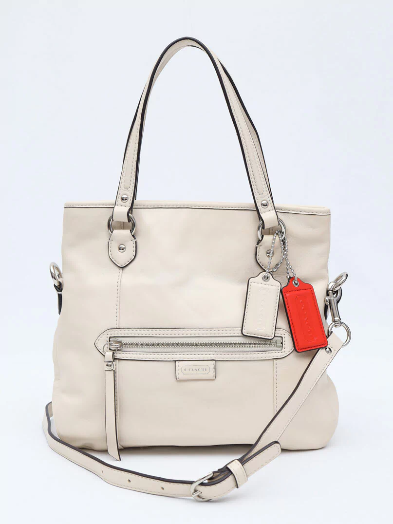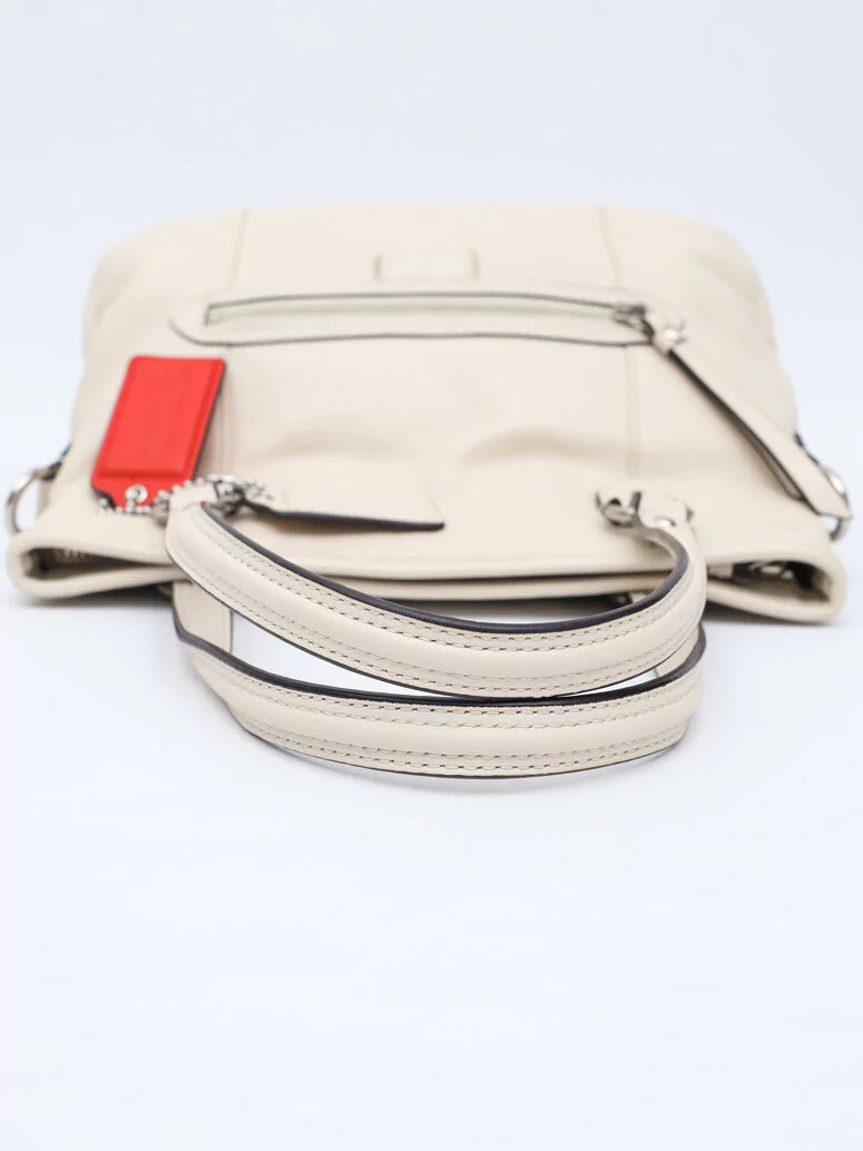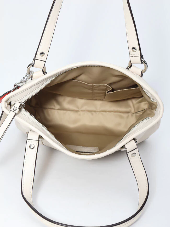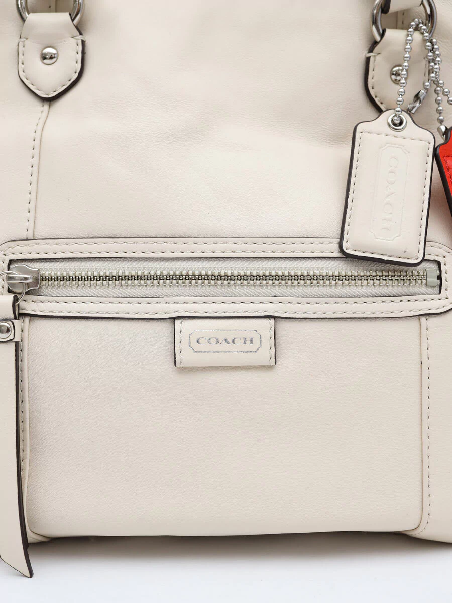 Bolsa Autêntica Coach White Leather Crossbody produzida em couro na cor branco off-white com ferragens pratas, apresenta alça longa removível com ajuste de comprimento, alças de ombro, um bolso com zíper na parte da frente de fácil acesso, abertura superior com zíper e puxador em couro, interior em nylon com um bolso com zíper e dois bolsos abertos.