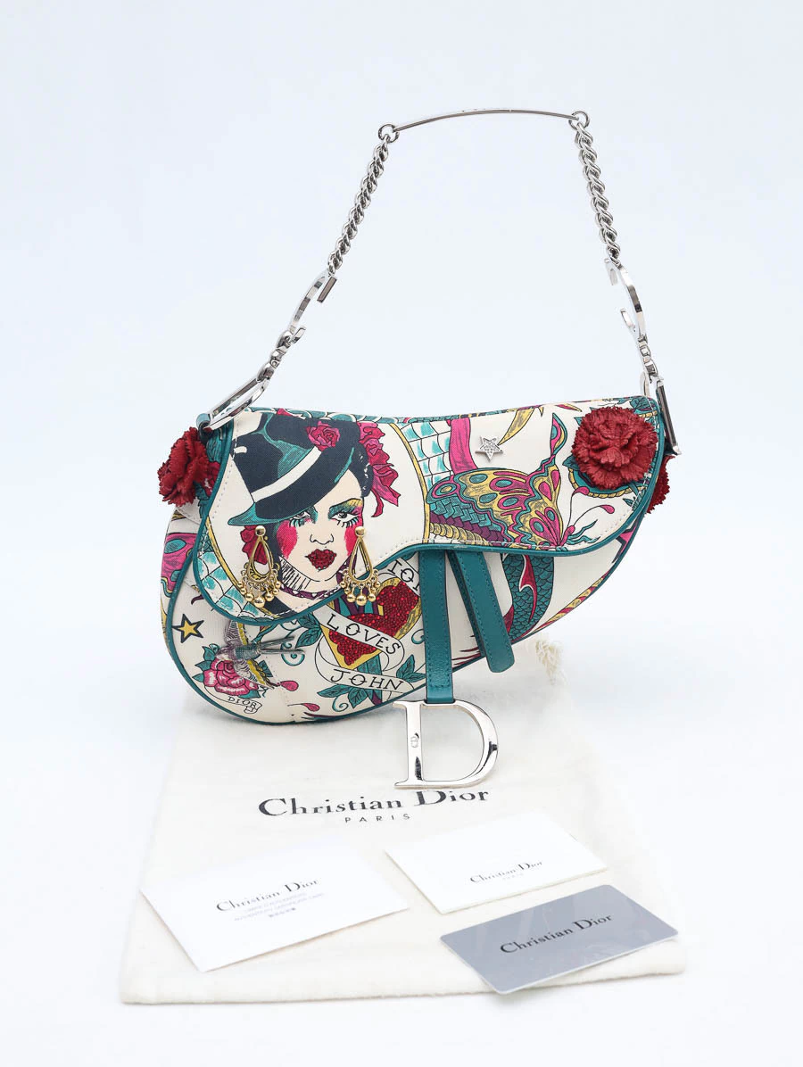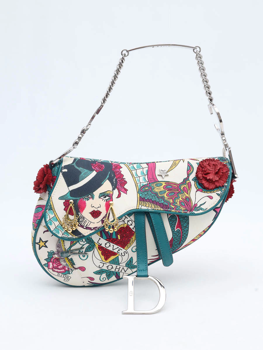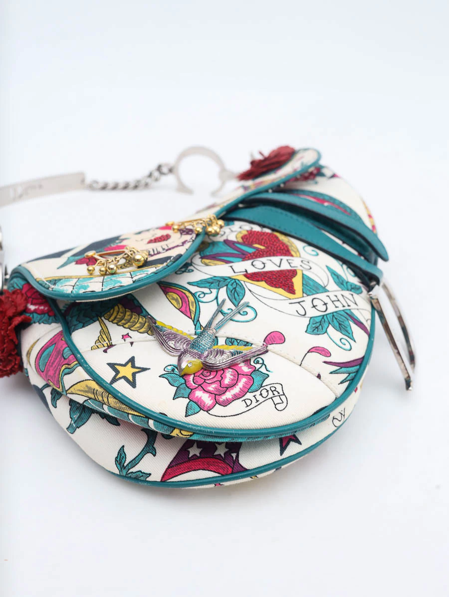 A Bolsa Dior Saddle Bag Loves John Limited Edition é uma peça icônica e rara, lançada como parte de uma coleção exclusiva desenhada por John Galliano para a Dior. Com um design inspirado na estética do mundo das tatuagens, a bolsa apresenta ilustrações vibrantes e frases românticas como "Loves John" e "J’Adore Dior", além de detalhes florais e elementos gráficos ousados.
