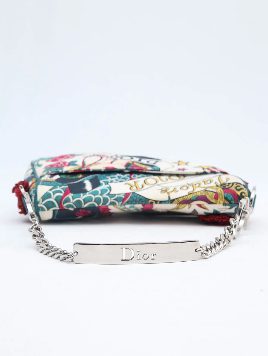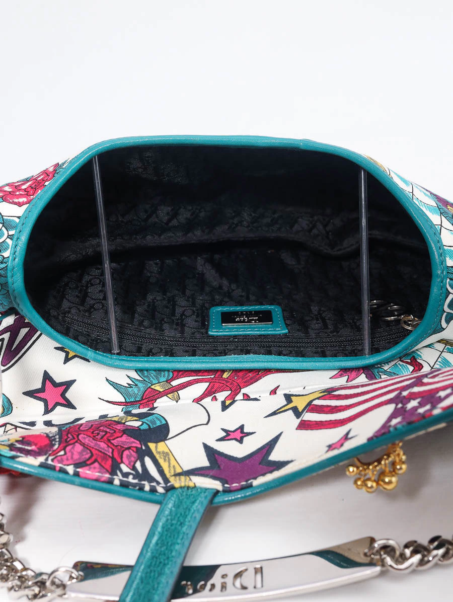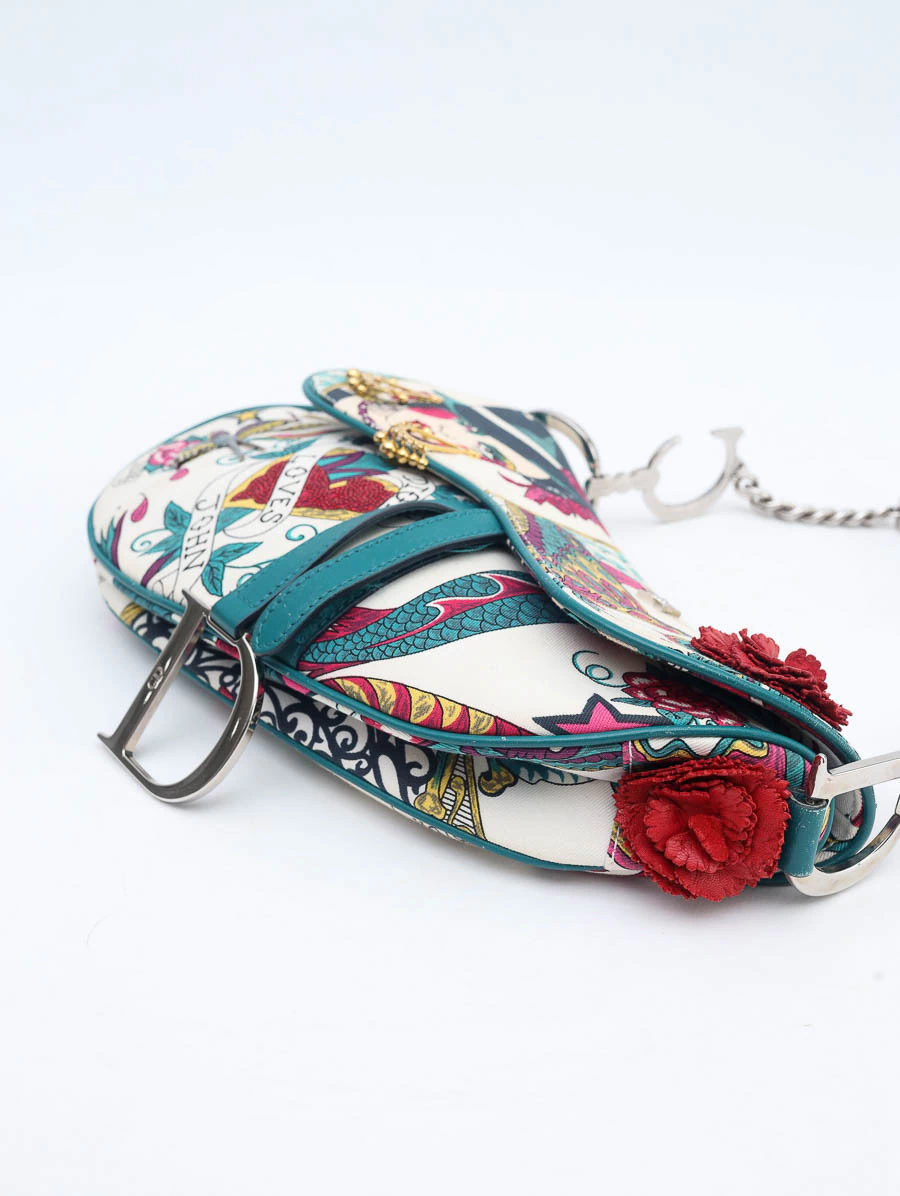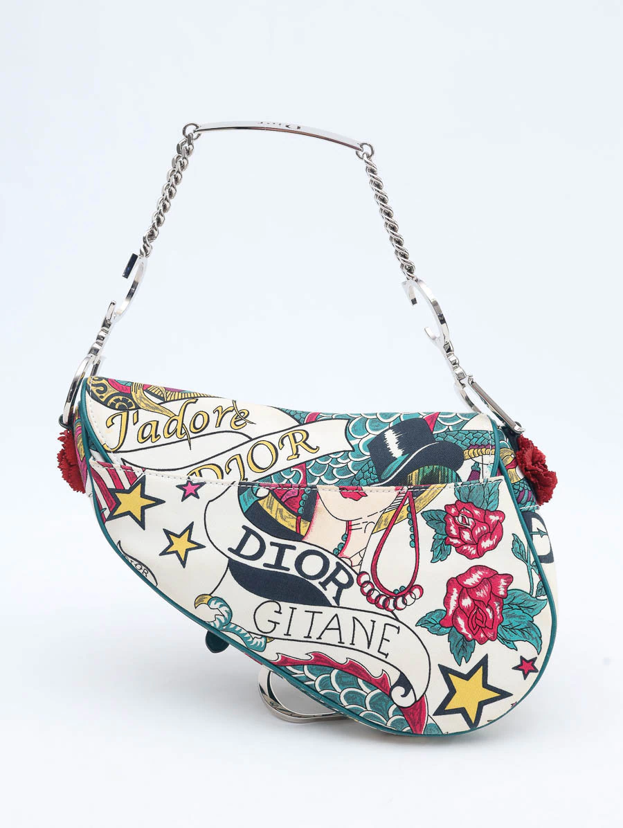 A Bolsa Dior Saddle Bag Loves John Limited Edition é uma peça icônica e rara, lançada como parte de uma coleção exclusiva desenhada por John Galliano para a Dior. Com um design inspirado na estética do mundo das tatuagens, a bolsa apresenta ilustrações vibrantes e frases românticas como "Loves John" e "J’Adore Dior", além de detalhes florais e elementos gráficos ousados.