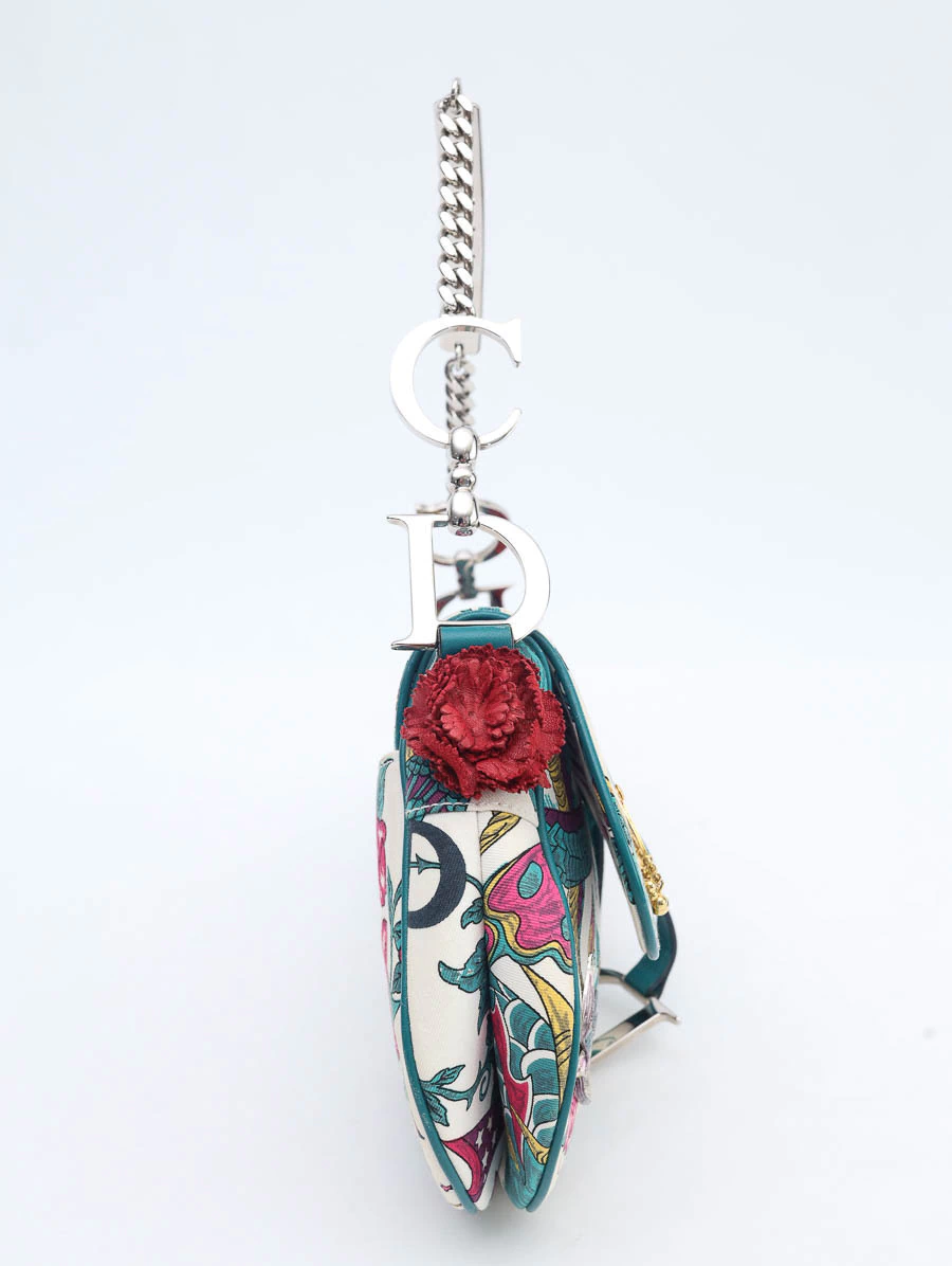 Este modelo exclusivo mantém o formato clássico da Saddle Bag, com a icônica aba curva e o fecho em "D" metálico. A alça de corrente prateada adiciona um toque moderno e sofisticado, enquanto os detalhes em couro verde destacam ainda mais o design único da peça.
