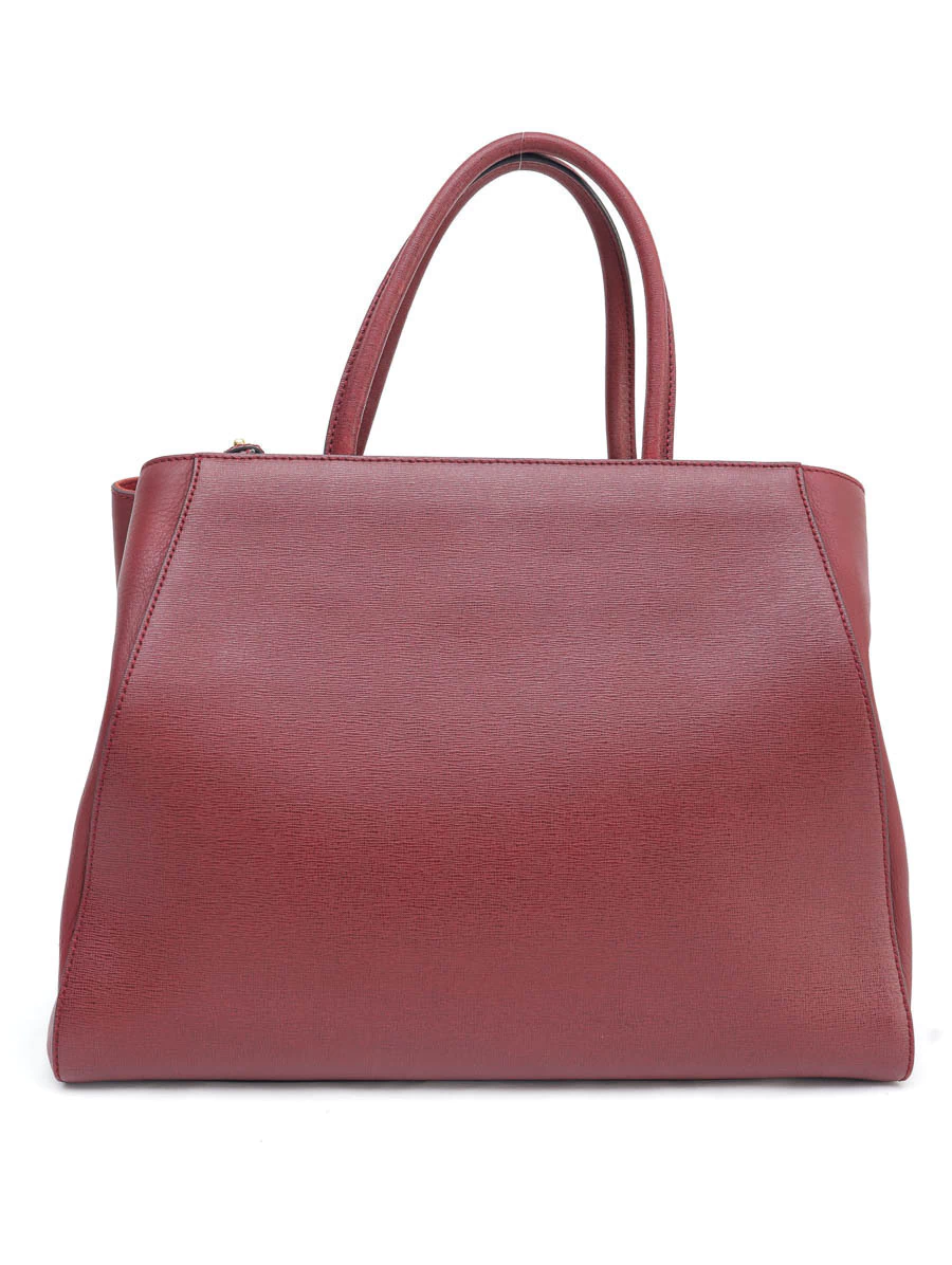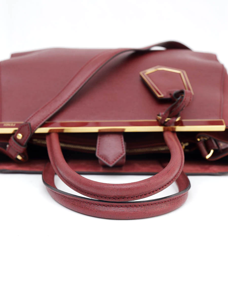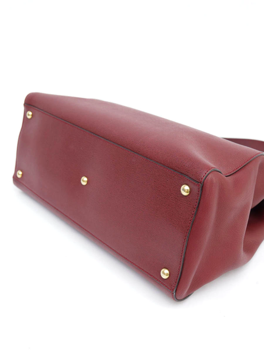 Bolsa Original Seminova Fendi Medium 2Jours produzida em couro Saffiano com estrutura firme e linhas clássicas na cor vinho. Com abertura superior através de uma fechamento com botão de pressão e uma elegante barra superior em metal com logotipo da marca, o modelo conta com duas alças de mão e uma alça longa estilo crossbody. Seu interior apresenta três compartimentos, sendo o compartimento central com zíper.