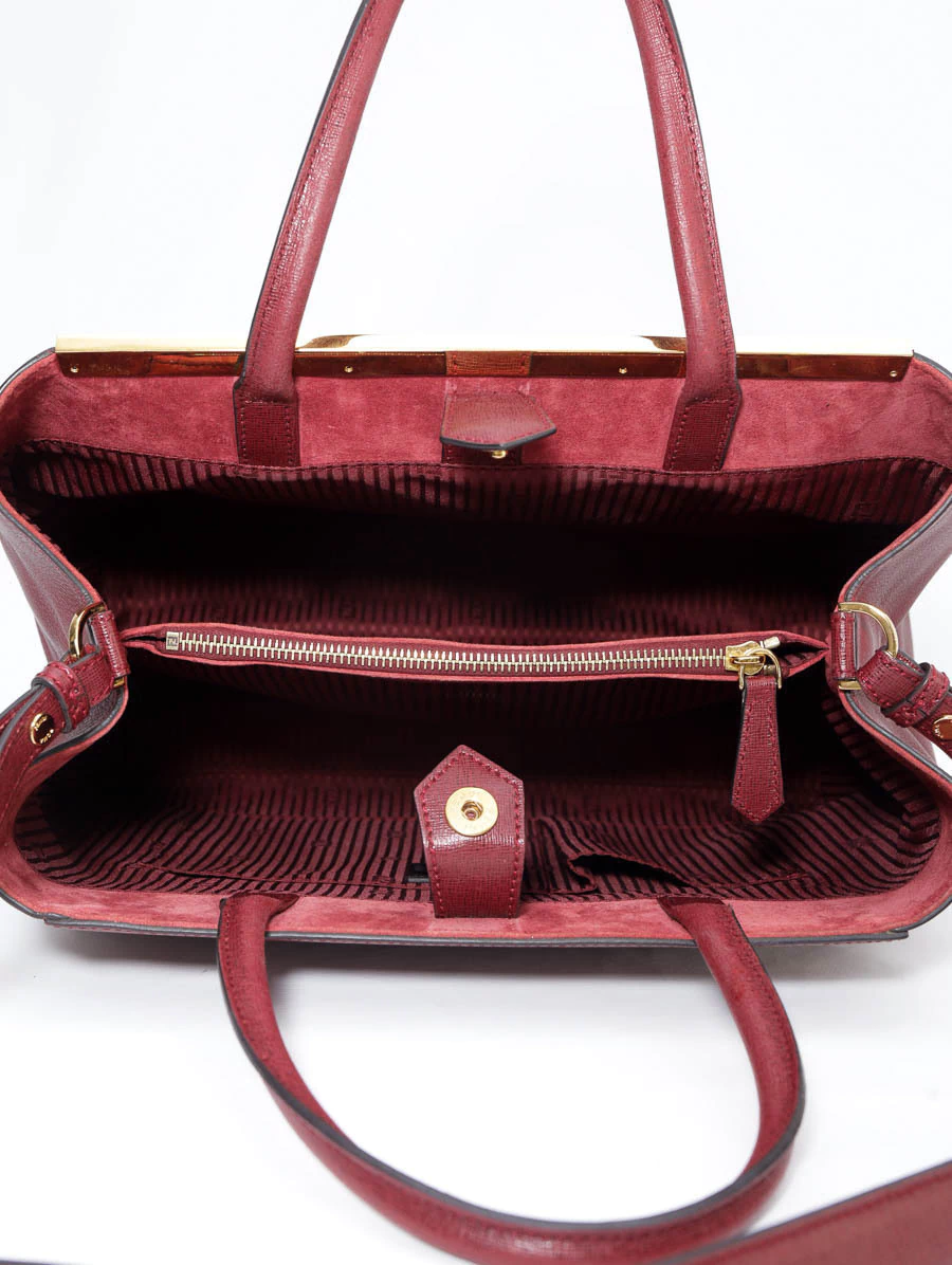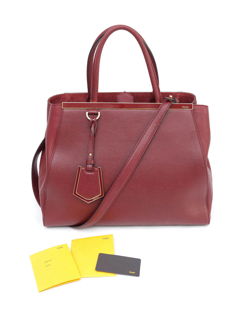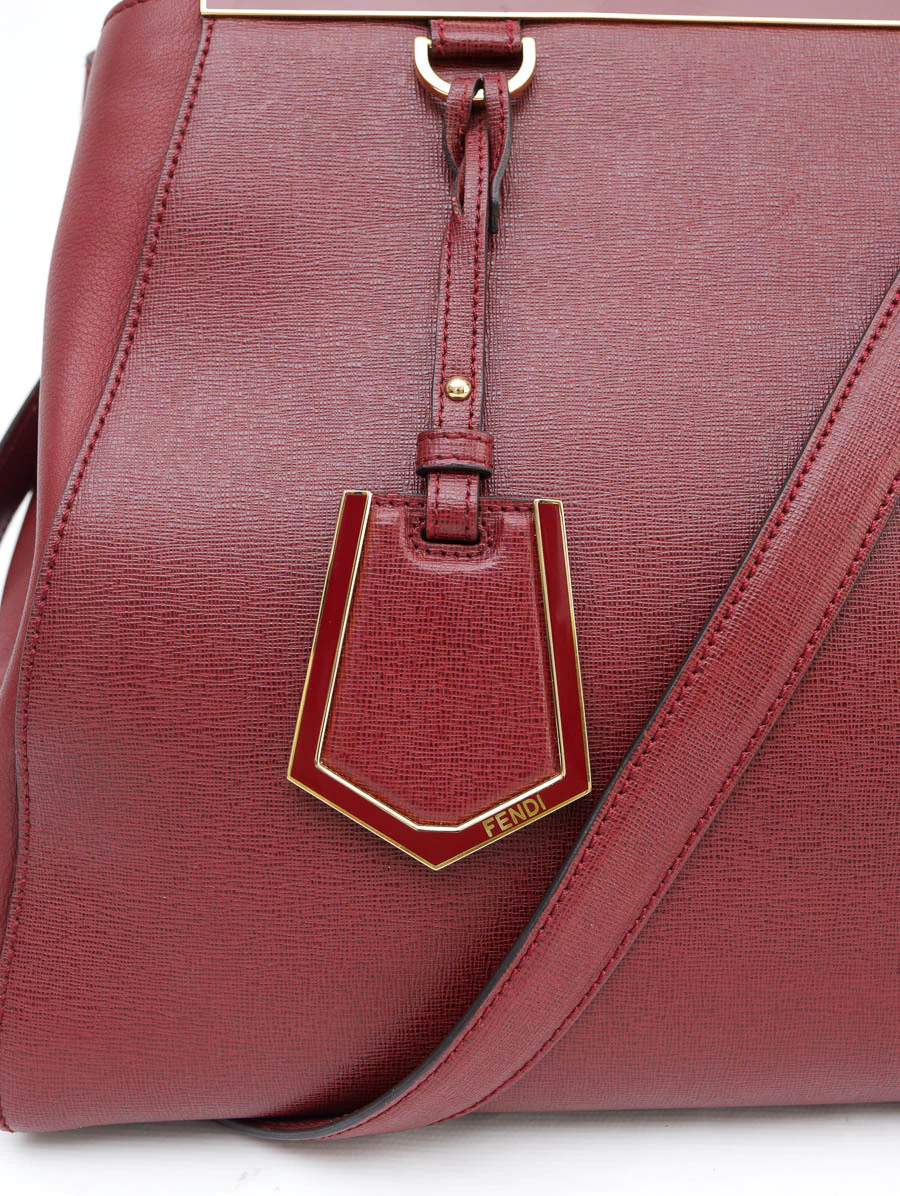 Bolsa Original Seminova Fendi Medium 2Jours produzida em couro Saffiano com estrutura firme e linhas clássicas na cor vinho. Com abertura superior através de uma fechamento com botão de pressão e uma elegante barra superior em metal com logotipo da marca, o modelo conta com duas alças de mão e uma alça longa estilo crossbody. Seu interior apresenta três compartimentos, sendo o compartimento central com zíper.