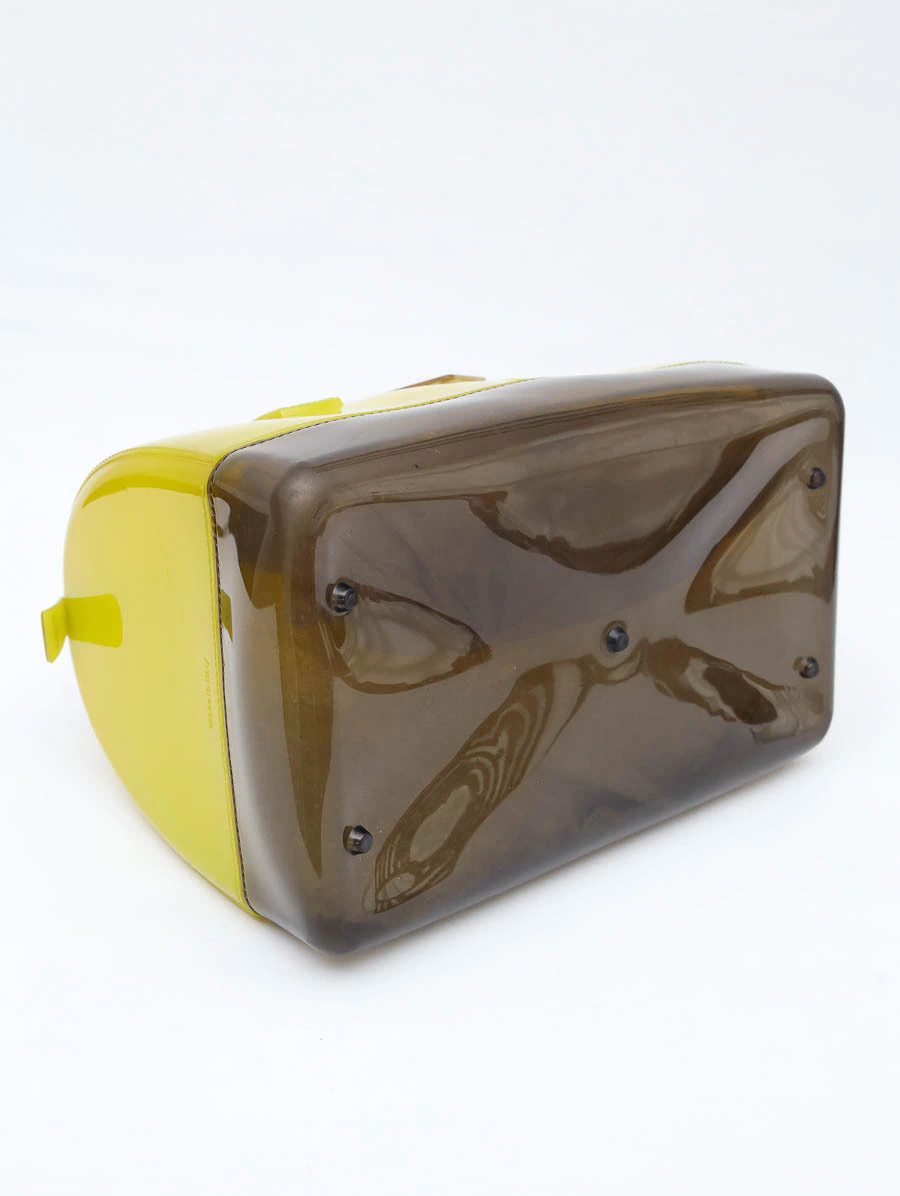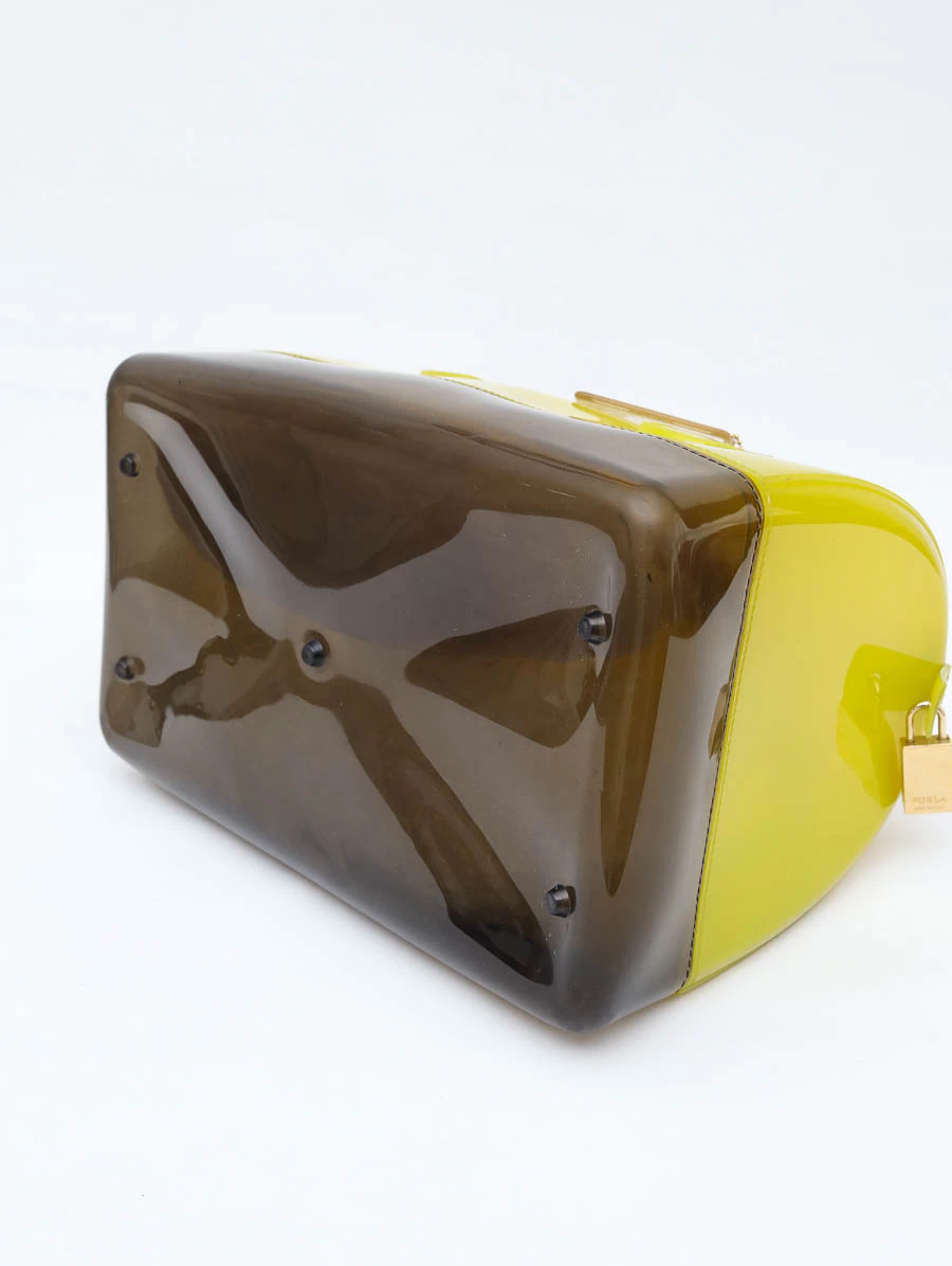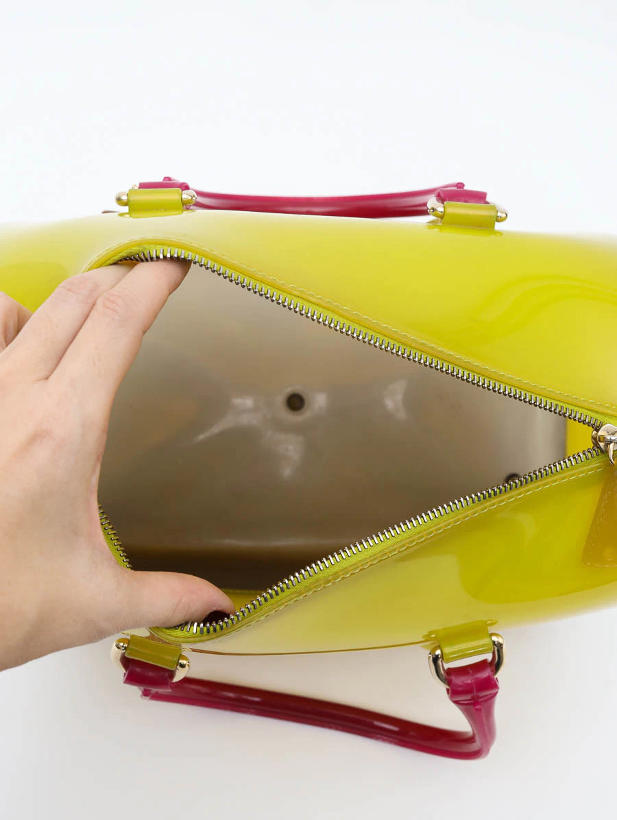 Versão vibrante e moderna da clássica Bolsa Furla Candy Bag, confeccionada em PVC envernizado em um degradê que transita do amarelo translúcido ao marrom na base, complementada pelas alças rígidas em tom bordô. Estrutura robusta e acabamento brilhante que conferem um visual marcante e irreverente. Possui fechamento superior em zíper, garantindo segurança e funcionalidade. Ideal para looks criativos e cheios de personalidade.