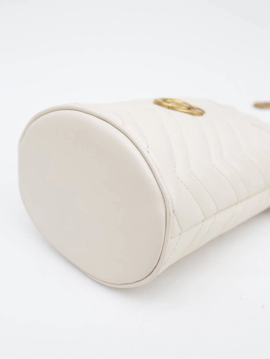 A Bolsa Seminova Original Gucci Bucket é um charme e está presente na coleção atual da marca. Produzida em couro matelassê na cor Off-White e ferragens com banho dourado envelhecido, o modelo apresenta abertura superior com cordão enforcador, alça longa crossbody em delicadas correntes, interior aveludado com dois slots para cartões, um pequeno mosquetão com correntes interno para chaves e espaçoso interior para uma carteira, celular e pequenas maquiagens.