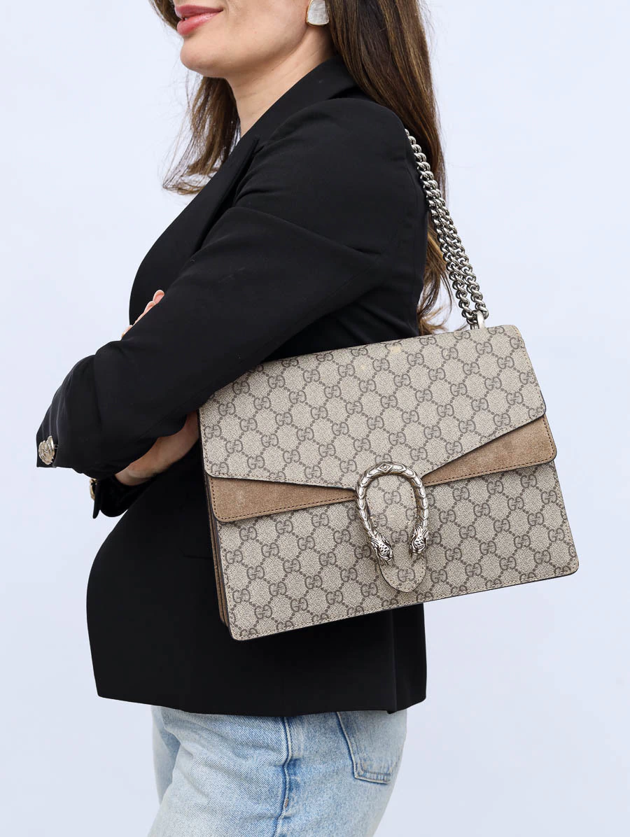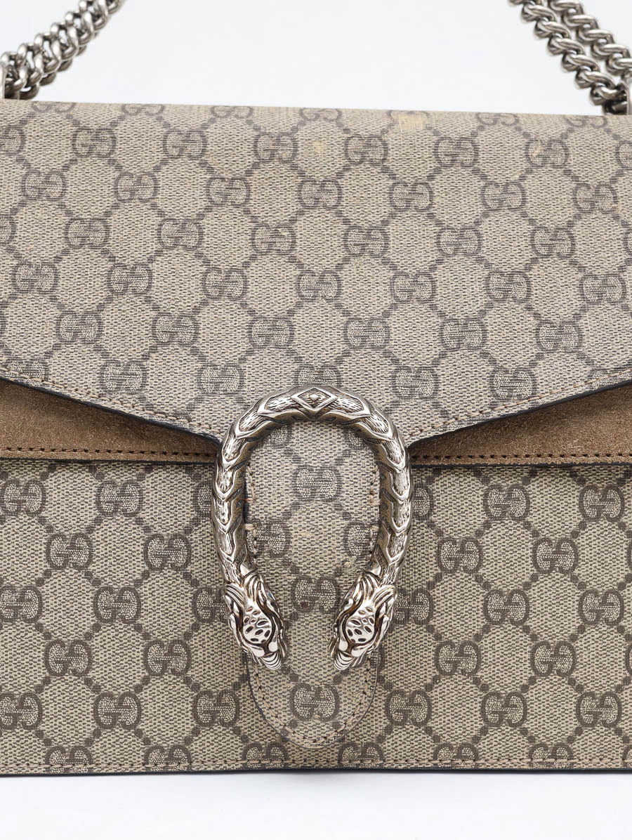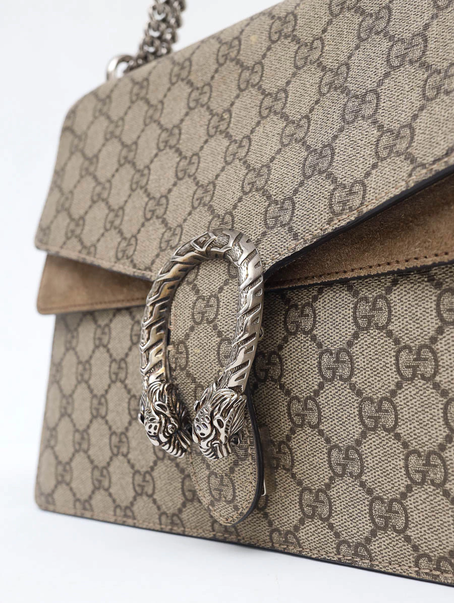 Bolsa original Gucci Dionysus GG Supreme em canvas monogram bege, com detalhes em camurça taupe e fecho icônico em metal envelhecido. Modelo estruturado e elegante, perfeito para compor looks sofisticados.