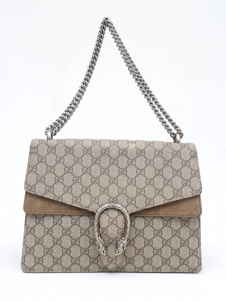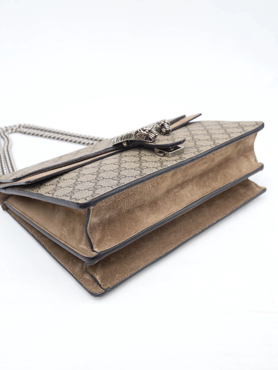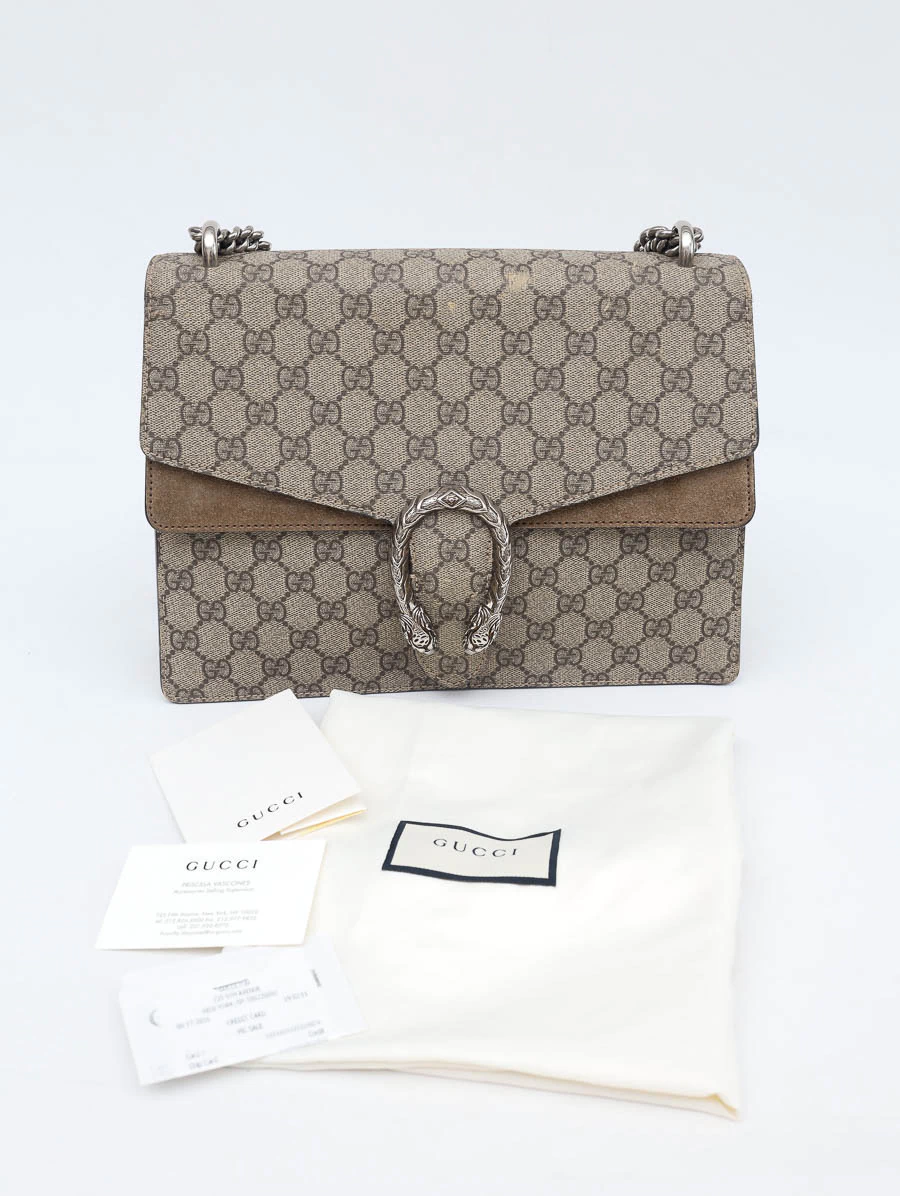 Bolsa original Gucci Dionysus GG Supreme em canvas monogram bege, com detalhes em camurça taupe e fecho icônico em metal envelhecido. Modelo estruturado e elegante, perfeito para compor looks sofisticados.
