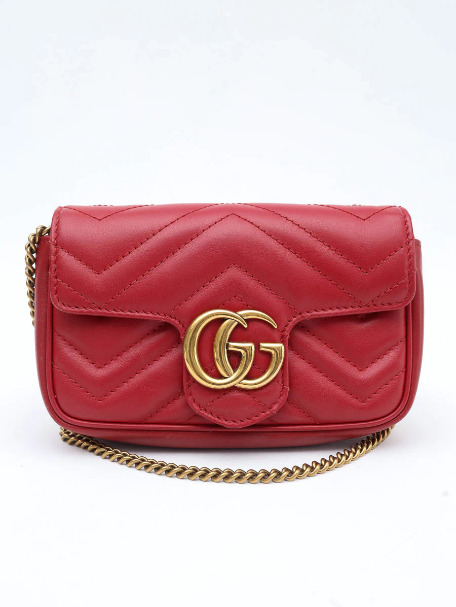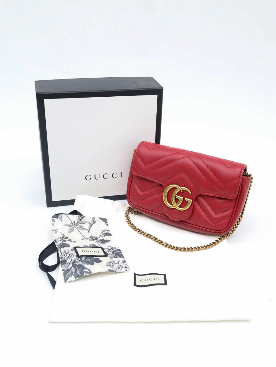 Bolsa Gucci Marmont Super Mini produzida em couro na cor vermelho acolchoado com pespontos diagonais e metais em ouro envelhecido. Apresenta uma alça longa crossbody , abertura superior com zíper e interior aveludado.