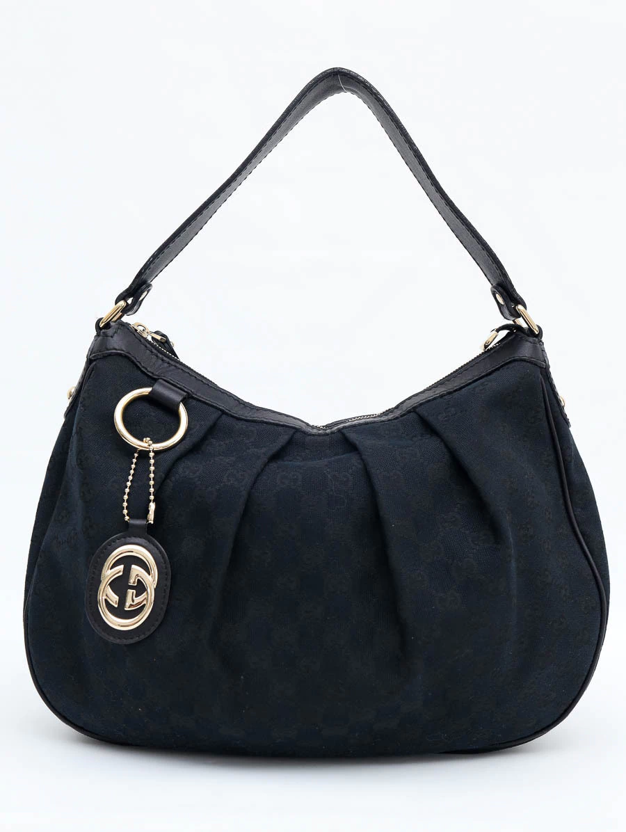 Esta chique e sofisticada Bolsa Original Gucci Medium Sukey Hobo é um modelo muito leve de ser carregada e uma opção perfeita para usar todos os dias. No tamanho médio, produzida em tecido de alta durabilidade com estampa monograma clássica GG Gucci na cor preta, detalhes em couro preto e ferragens com banho dourado. Apresenta uma confortável alça de ombro em couro e um belíssimo pingente da Gucci com logotipo GG.