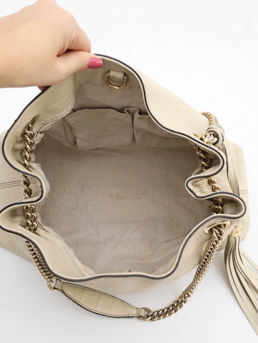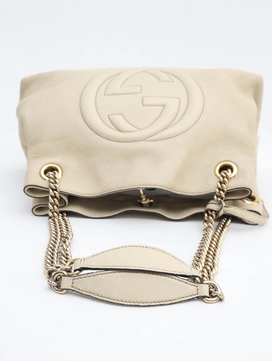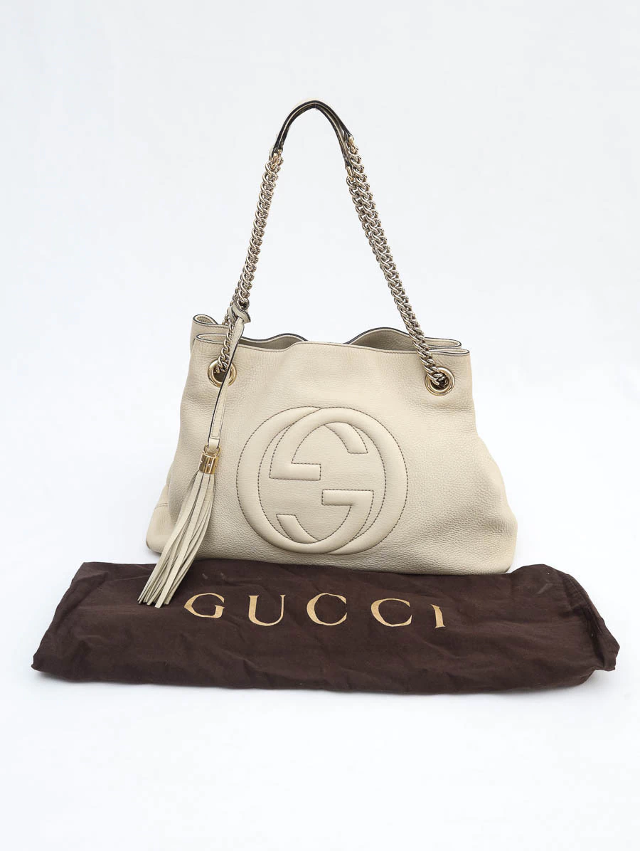 A Bolsa Original Gucci Soho Chain Shoulder é uma peça sofisticada e versátil, ideal para quem busca estilo e praticidade. Confeccionada em couro na elegante cor branca off white, possui como destaque suas alças de ombro em correntes douradas, que adicionam um toque luxuoso ao design. O modelo conta com abertura superior por fecho mosquetão e compartimento único espaçoso, equipado com três bolsos internos, sendo dois abertos e um com zíper, garantindo organização e praticidade.