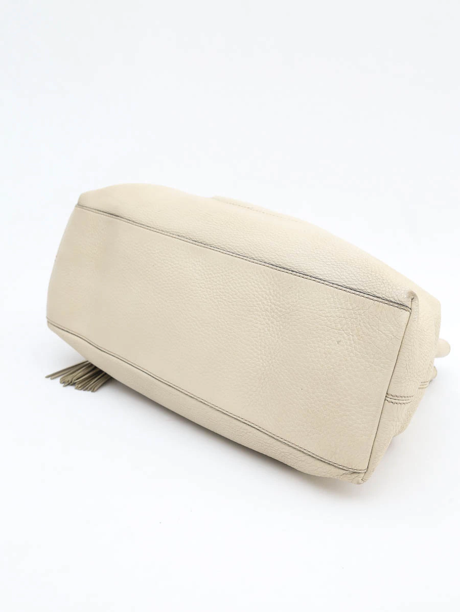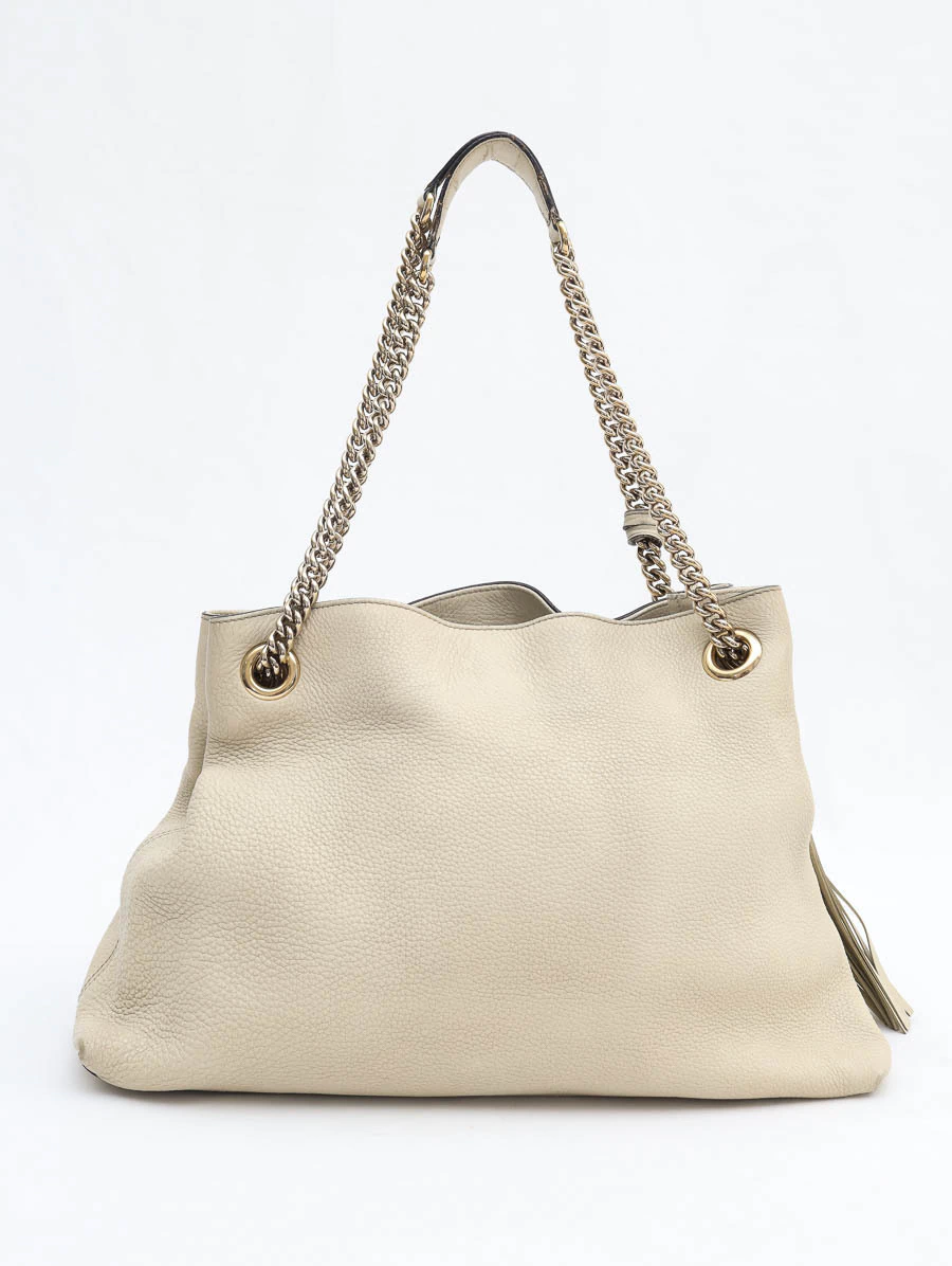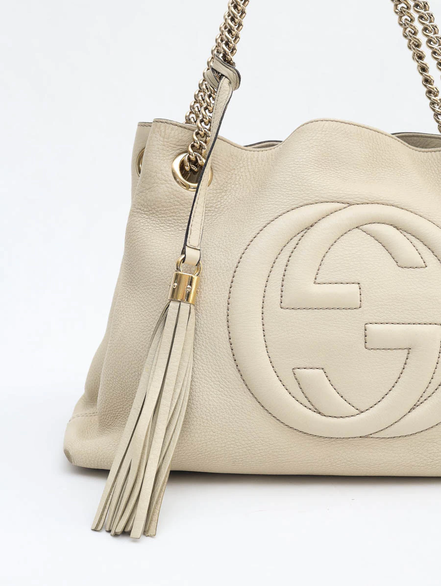 A Bolsa Original Gucci Soho Chain Shoulder é uma peça sofisticada e versátil, ideal para quem busca estilo e praticidade. Confeccionada em couro na elegante cor branca off white, possui como destaque suas alças de ombro em correntes douradas, que adicionam um toque luxuoso ao design. O modelo conta com abertura superior por fecho mosquetão e compartimento único espaçoso, equipado com três bolsos internos, sendo dois abertos e um com zíper, garantindo organização e praticidade.