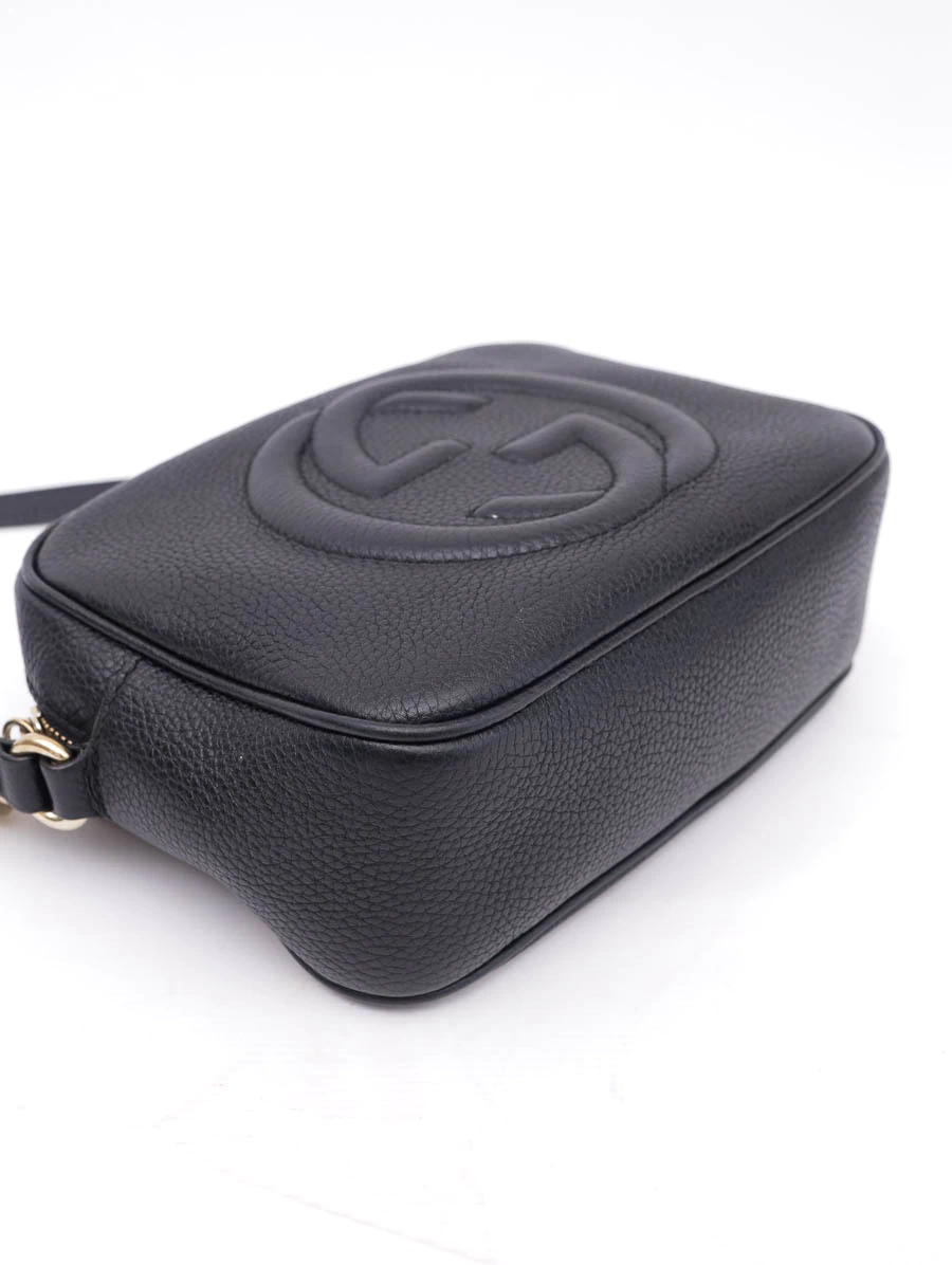 Bolsa Original Gucci Soho Disco Preta produzida em couro na cor preta e metais dourados. Apresenta alça longa, abertura por zíper e compartimento único com dois bolsos abertos.
