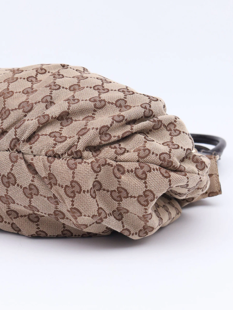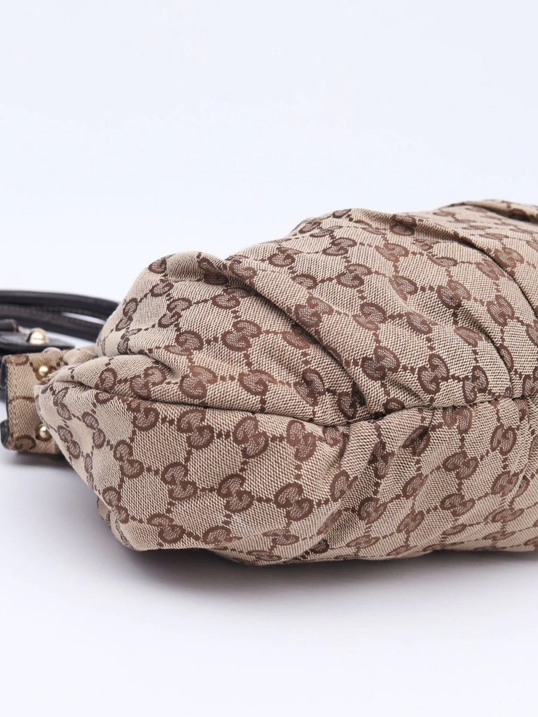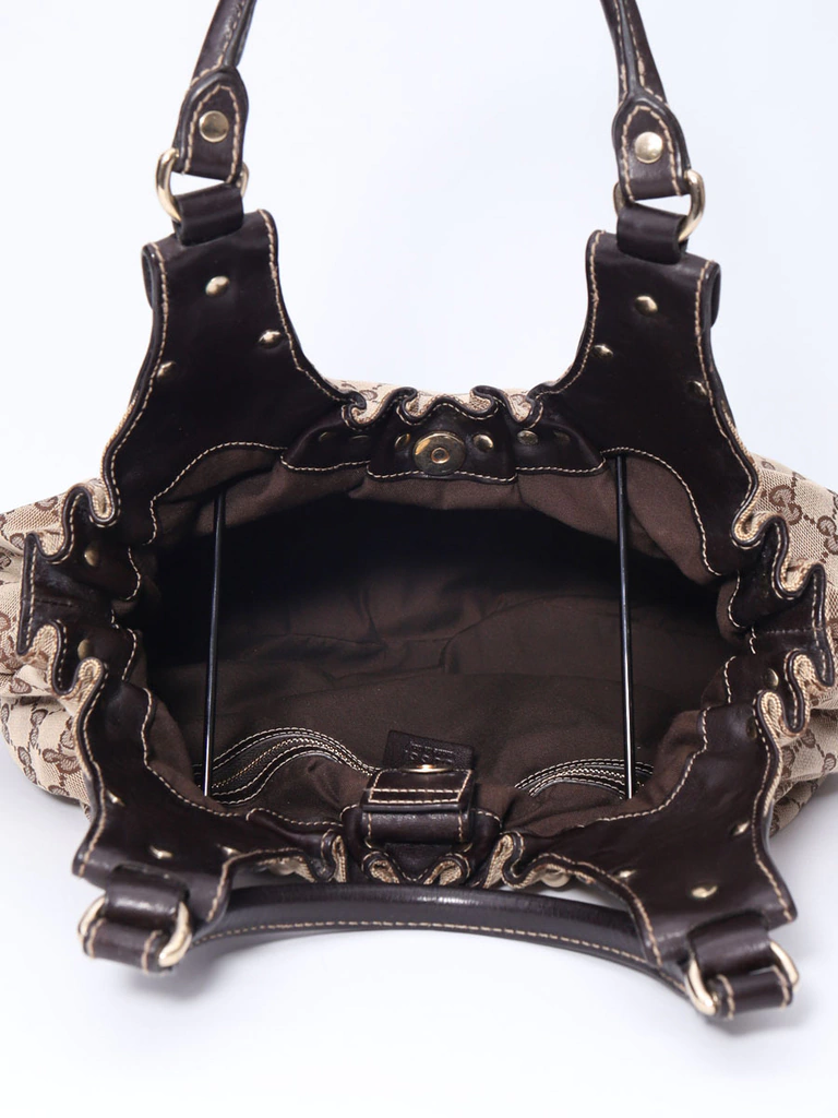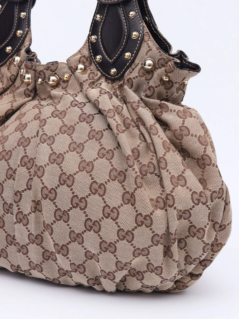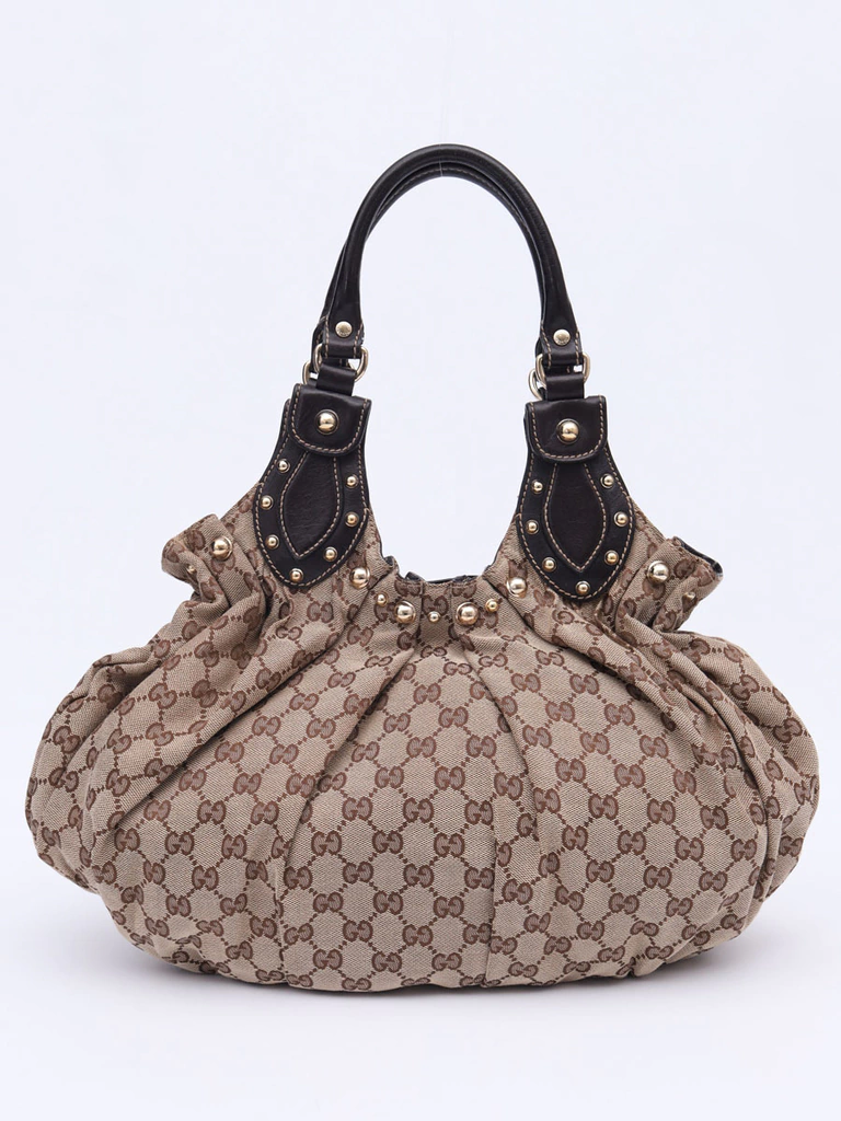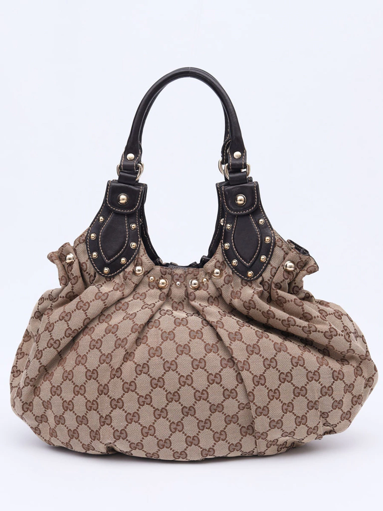 Esta elegante Bolsa Original Gucci Studded Pelhamproduzida em tecido canvas de alta durabilidade com estampa GG clássica da Gucci na cor ébano e bege, apresenta alças de ombro e detalhes em couro, tachas em metal com banho em dourado e interior espaçoso com um bolso com zíper. Confortável, muito leve e espaçosa, é uma excelente opção para usar diariamente.